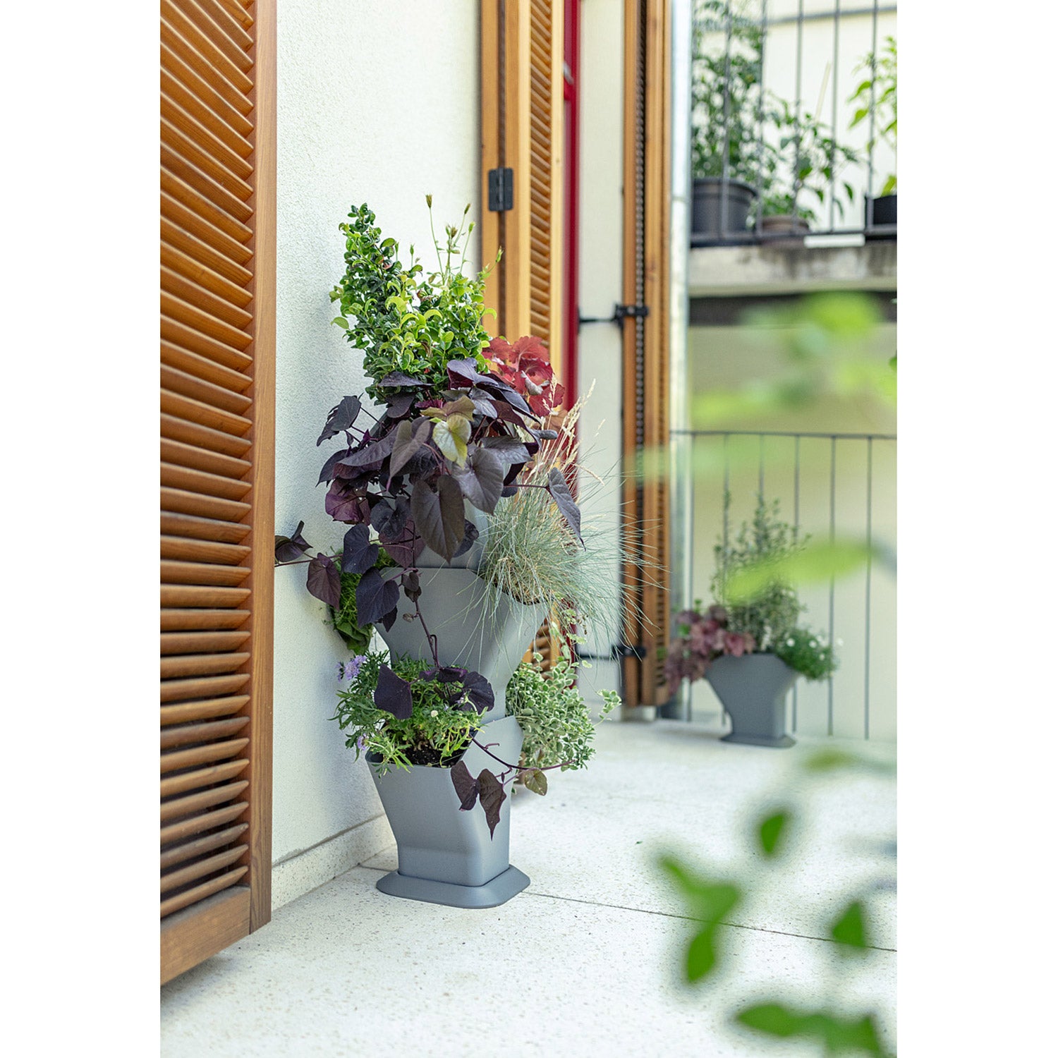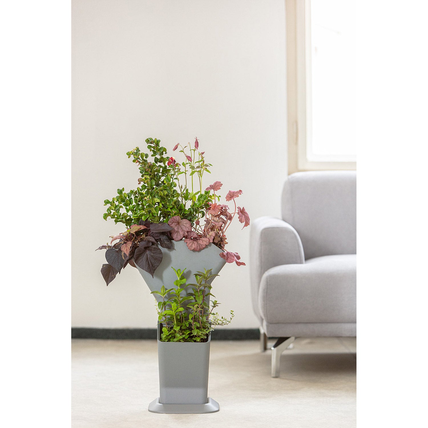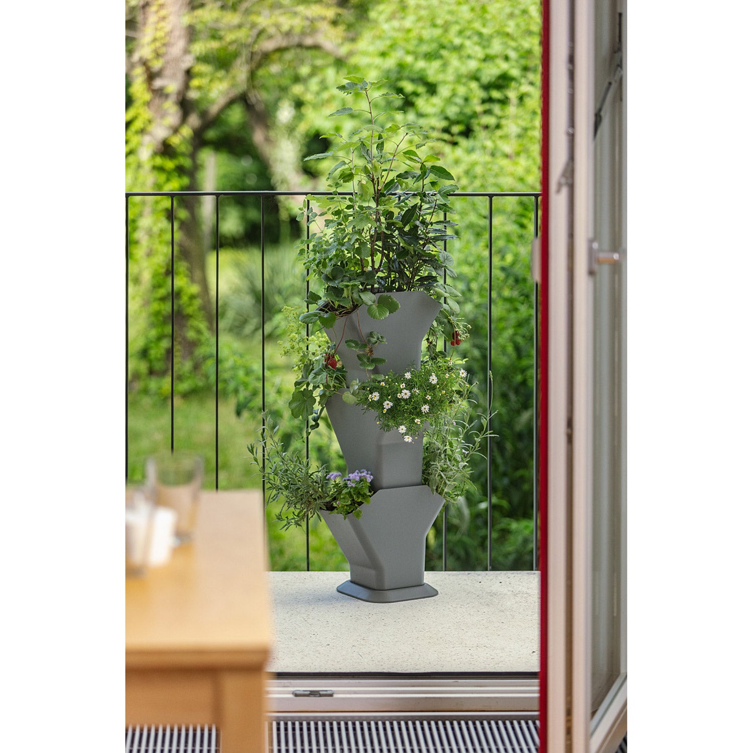 Den självvattnande odlingstornet är en vertikal odlingslösning, idealisk för att odla jordgubbar, sallat, örter eller andra små växter på en begränsad yta. Den smarta designen gör det möjligt att placera flera odlingsnivåer effektivt.