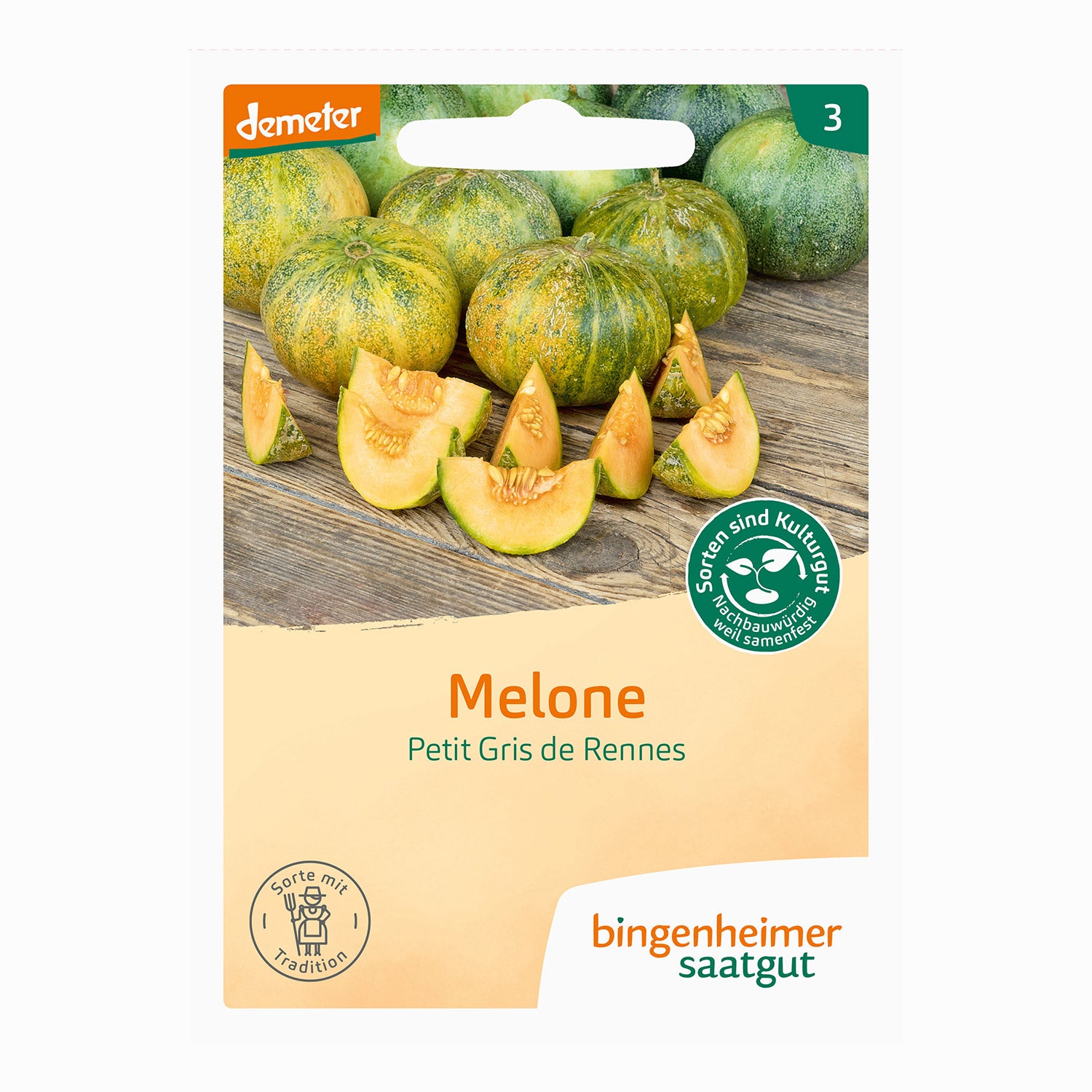 Sockermelon Petit Gris de Rennes, en högproducerande melon med frukter mellan 500 och 800 g. Denna melon visar sin mångsidighet genom att mogna bra även under mindre varma förhållanden, så att du kan njuta av dess härligt söta, orange fruktkött.