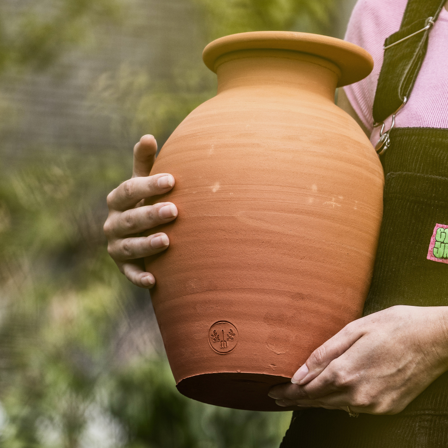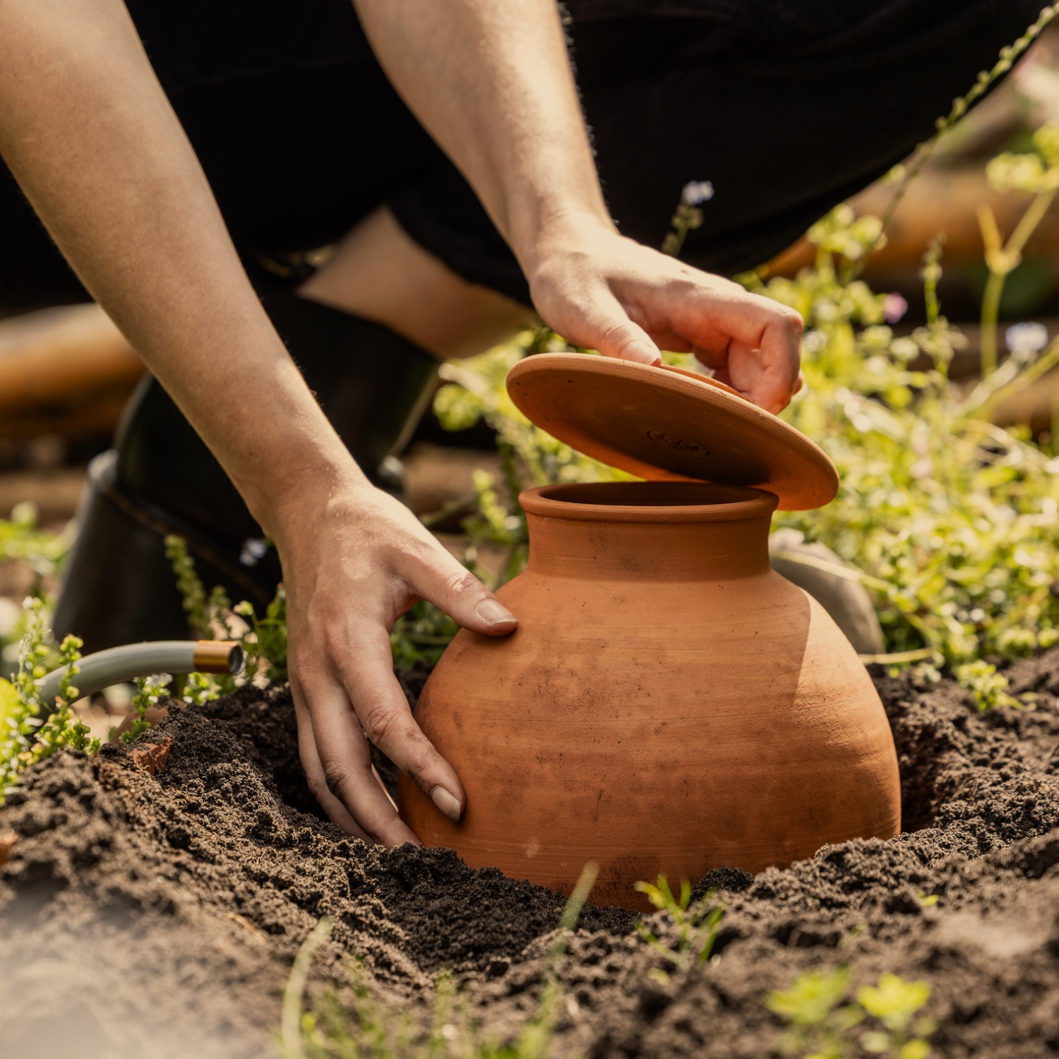 Sköt din trädgård smart och hållbart med en Olla. Vill du alltid ge dina växter tillräckligt med vatten utan att slösa för mycket? Olla är den perfekta lösningen! Denna uråldriga teknik använder en halvvattentät lerkruka som placeras i jorden och långsamt avger vatten till växternas rötter, precis där det behövs. Det ger optimal hydrering och en frisk trädgård. Oavsett om du har en grönsaksträdgård, odlar kryddor, tar hand om blommande växter eller sköter krukväxter inomhus, passar Olla för ett brett spektrum av växter. Du använder Olla enkelt; gräv ner Olla, fyll den med vatten och klart.