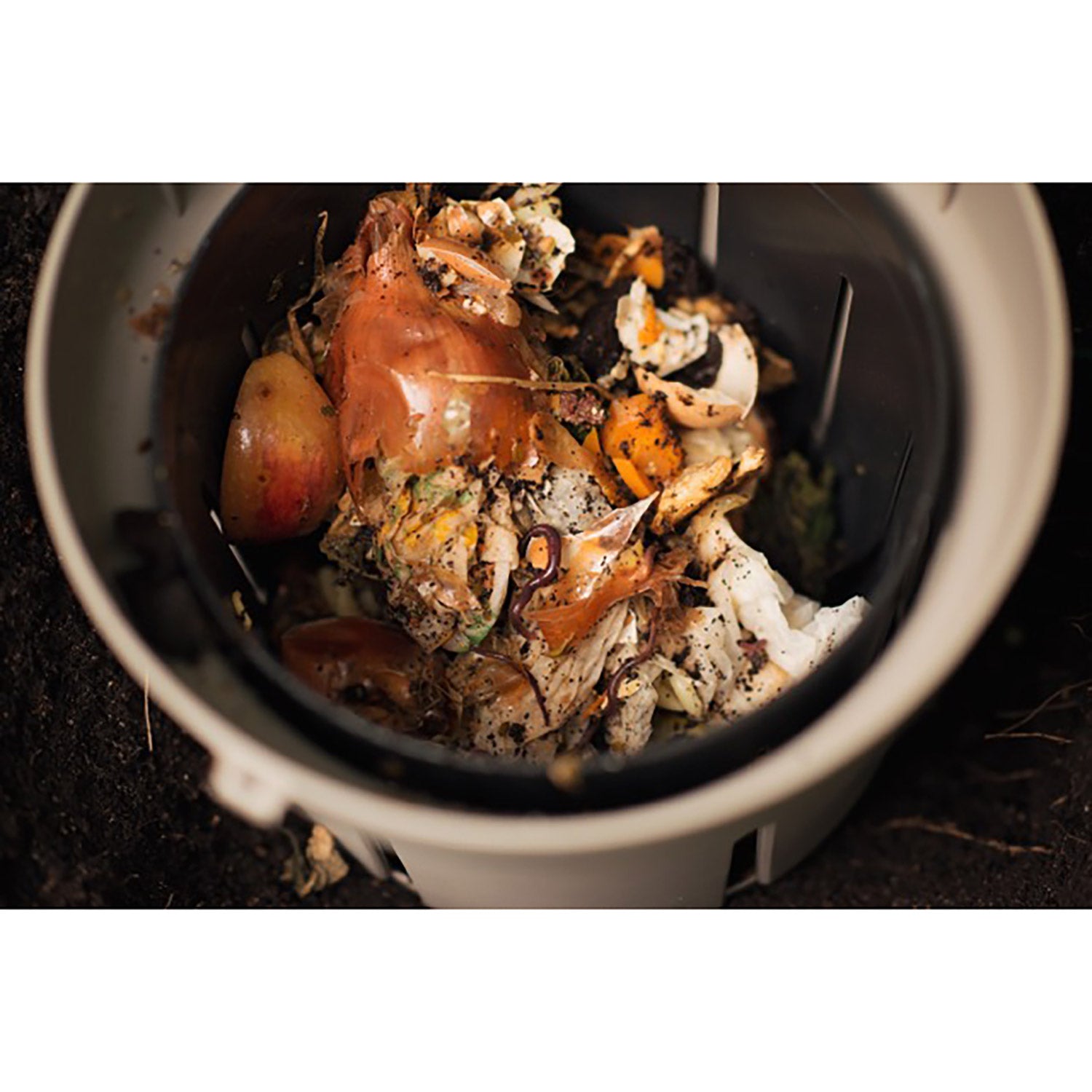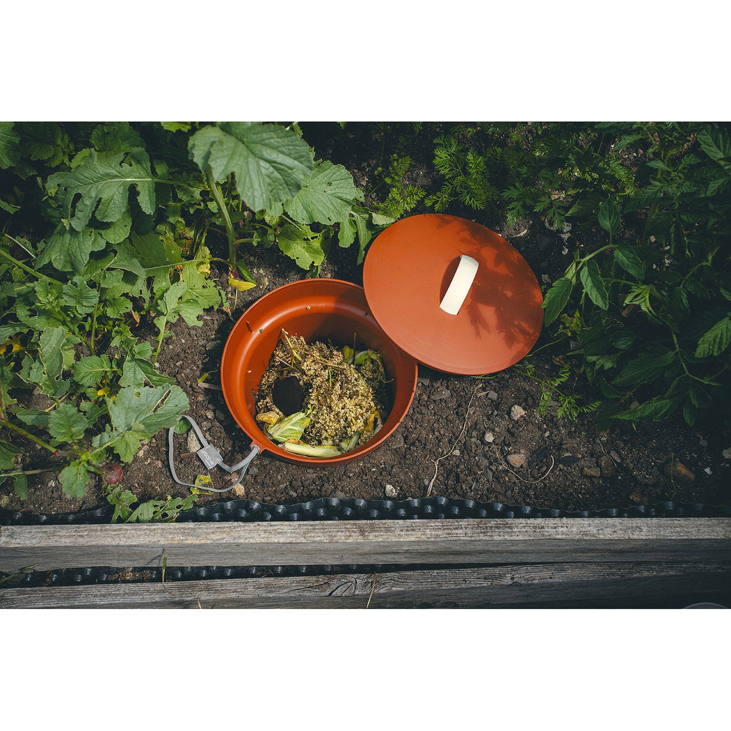 Du gräver ned vermikompostern i marken tills du inte längre ser de översta hålen. Annars kan insekterna inte ta sig in. Fyll den sedan med små bitar matavfall. Mikrolivet, särskilt daggmaskar, lockas då till den och hjälper därefter till att omsätta näringsämnena i jorden.