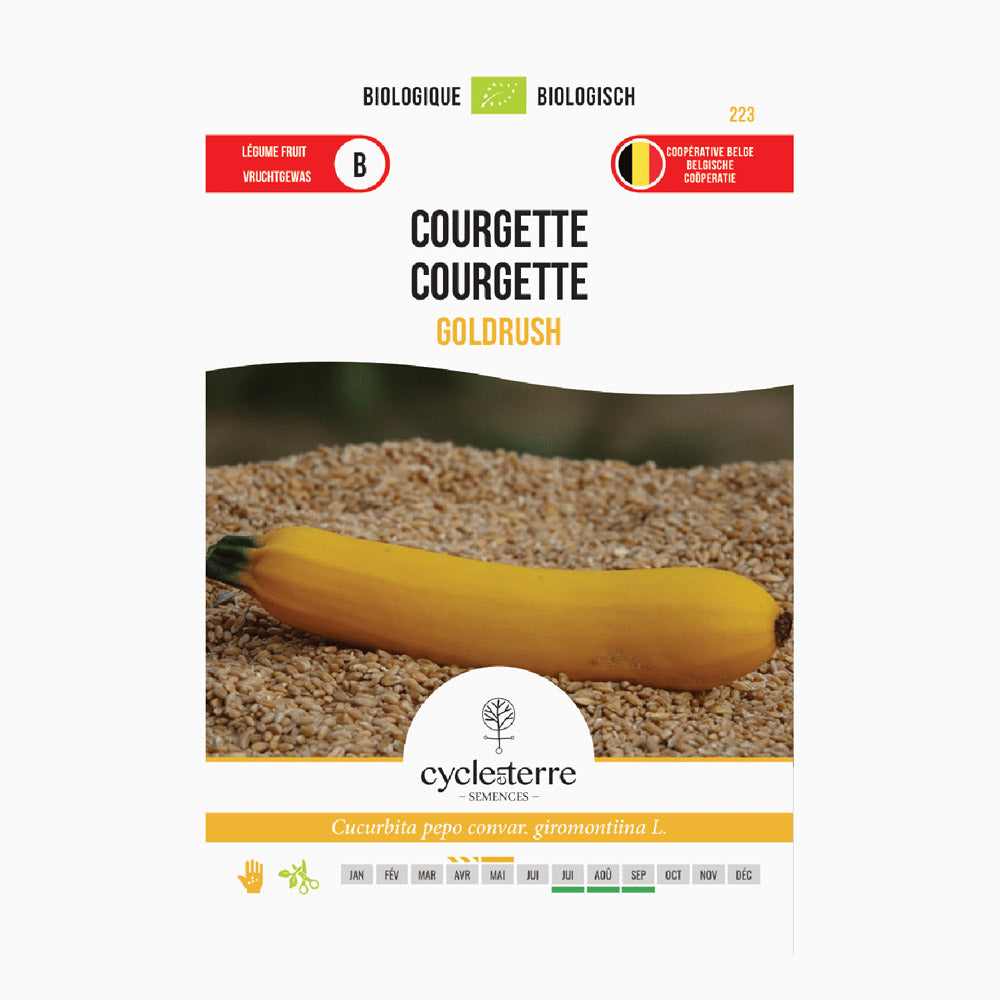 Så Zucchini 'Goldrush' i ett växthus eller på en såbädd från mitten av april (frostfritt), med ett sådjup på 3 cm och en groningstemperatur på 20 till 30°C. Från mitten av maj kan du plantera om de unga plantorna på friland med ett plantavstånd på 1 x 1 meter. Direktsådd i jorden från 15 maj är också ett alternativ, när risken för nattfrost är över. Denna zucchini växer bäst på en solig plats på friland, även om det också går bra att odla den i växthus för en tidig skörd. Skördetiden börjar i juli och kan fortsätta till slutet av sommaren, beroende på väderförhållandena.