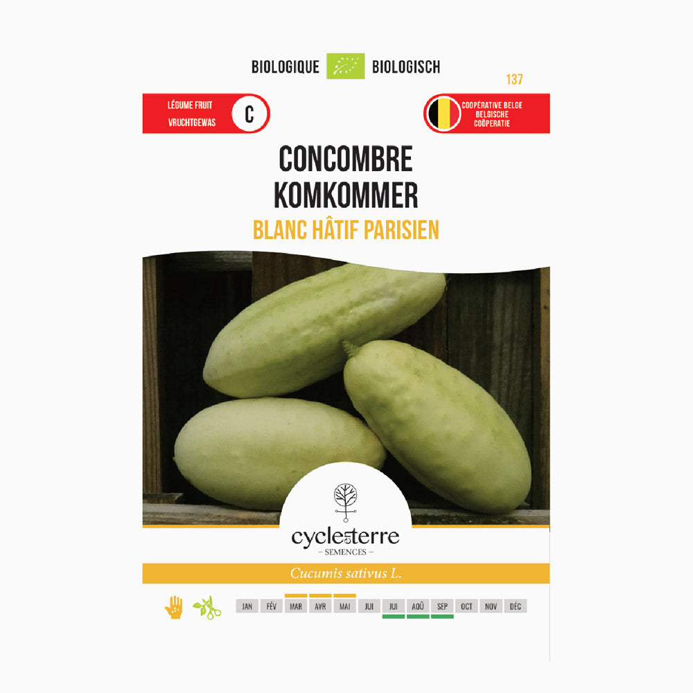 Så 'Parijse Witte Lange' mellan mars och maj i en sålåda på ett djup av 2 cm. När de unga plantorna är tillräckligt kraftiga kan du plantera om dem från mitten av april i ett växthus, eller från mitten av maj på friland. Håll då ett plantavstånd på 40 x 100 cm. Plantorna trivs bäst på en solig, skyddad plats och gynnas av väldränerad, näringsrik jord. Genom att odla i växthus kan du komma igång med produktionen ännu tidigare. Regelbunden vattning är viktig för att frukterna ska förbli saftiga och smakrika.