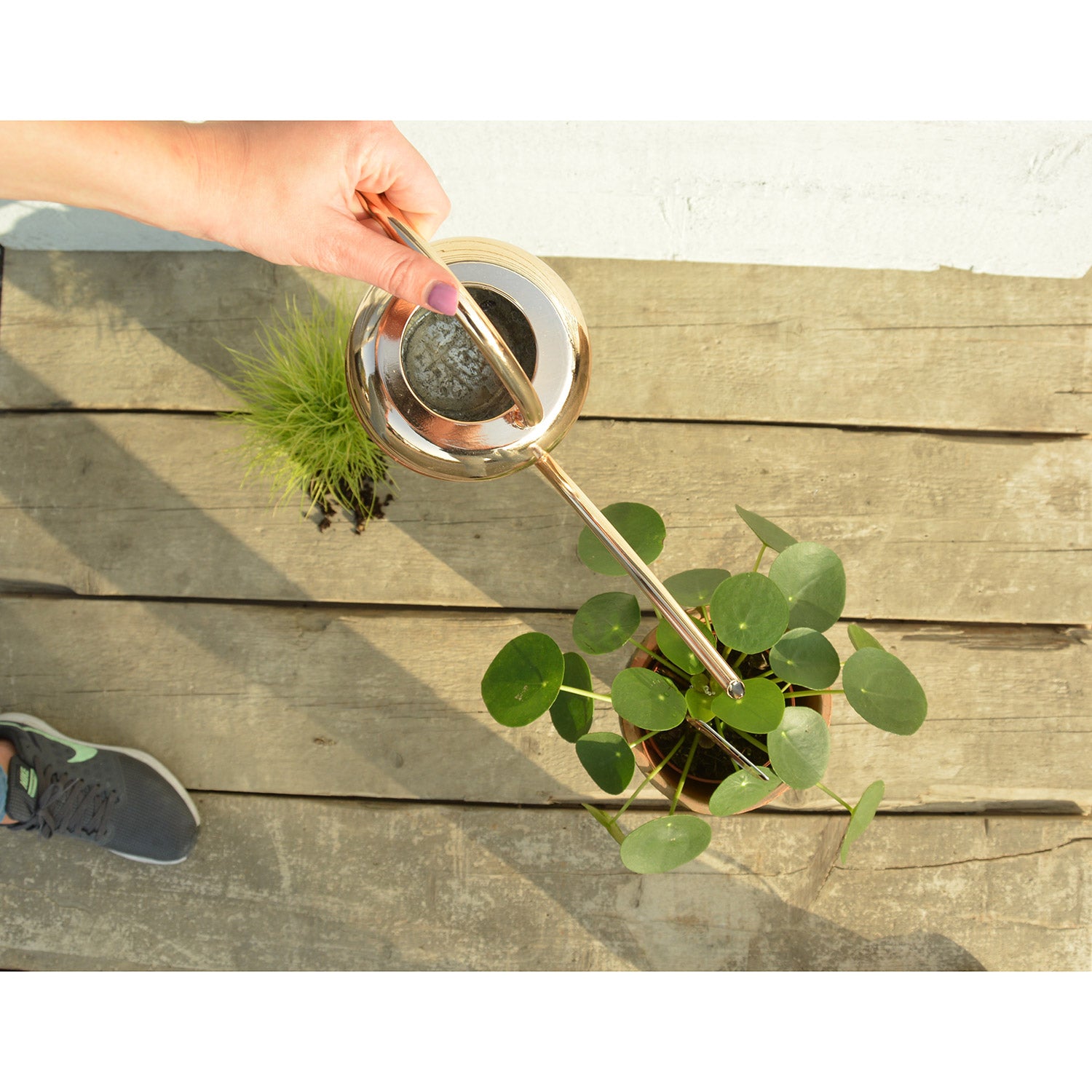 Esschert Design-vattenkannan i guld är en stilren och praktisk hjälp för alla växtälskare. Tillverkad av tåligt rostfritt stål med en elegant guldfärgad finish kombinerar denna vattenkanna funktion med design. Tack vare den smala pipen kan du vattna exakt och kontrollerat, perfekt för krukväxter och små krukor.