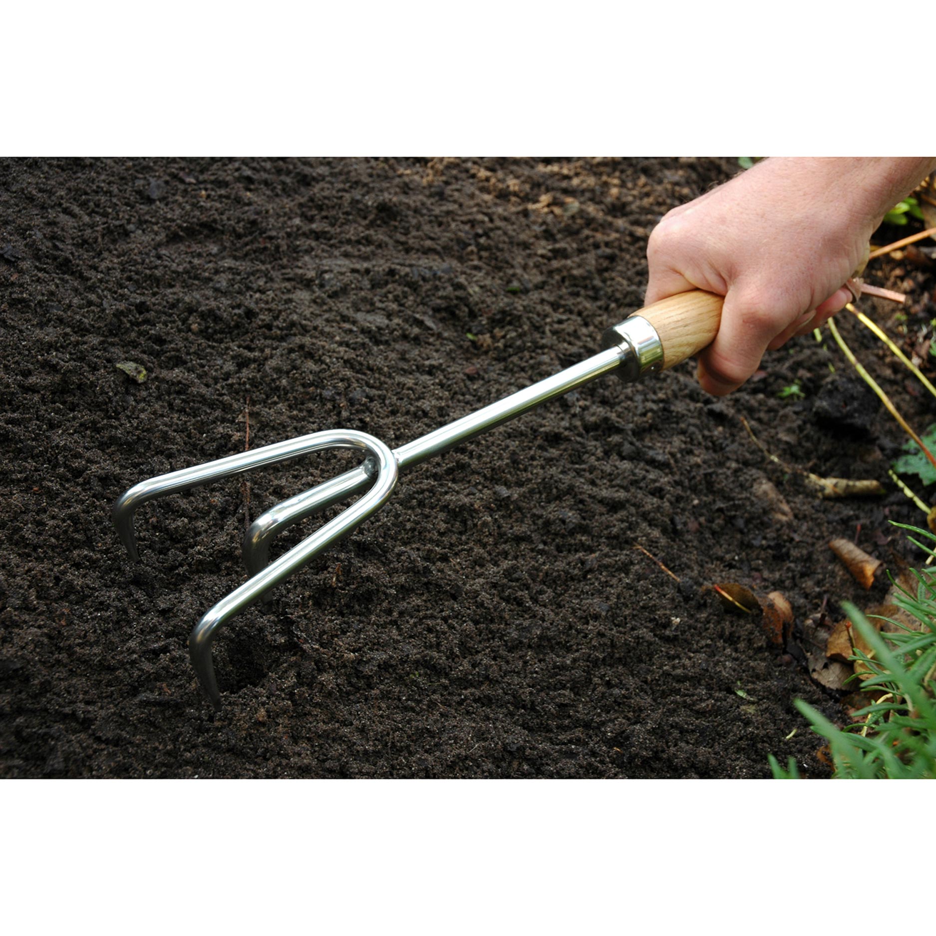 Den här krattan i rostfritt stål är ett traditionellt trädgårdsredskap för alla med gröna fingrar och perfekt för precisionsarbete i krukor, lådor och mindre delar av trädgården. Med den här krattan jämnar du enkelt till en liten yta, krattar ihop lövrester eller luckrar upp det översta jordlagret. Krattan är tillverkad av rostfritt stål med handtag i askträ och har en avslutning i oxläder i form av en läderögla för upphängning. Dessutom levereras den i en öppen presentask, trevlig att ge bort.