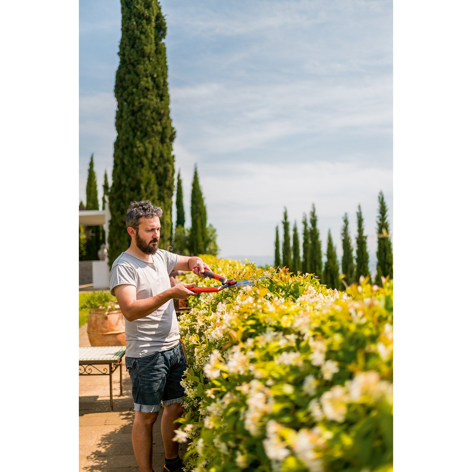 Denna allround häcksax med vågformat skärblad är lämplig för beskärning av alla typer av häckar och träd. Tack vare sin korta längd på 55 cm är häcksaxen smidig och lätt. Skärbladet på denna exklusiva häcksax är dessutom helt förkromat och handtagen är ergonomiskt utformade.