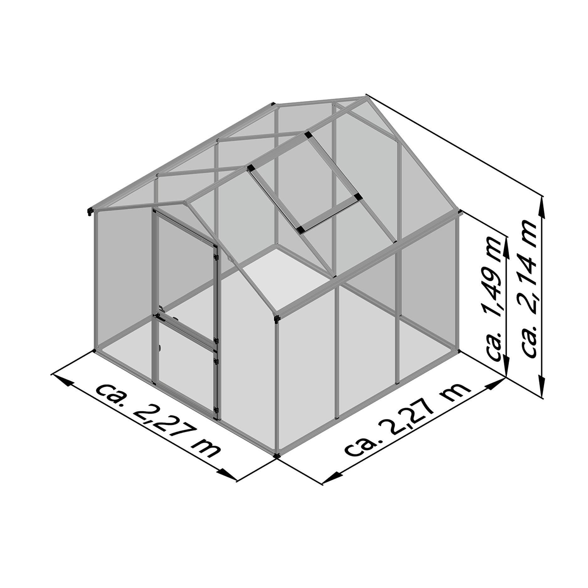 Växthuset är uppbyggt av en stabil aluminiumkonstruktion med 6 mm kanalplastskivor som håller kvar värmen och är UV-skyddade. Den stora slagdörren ger bred åtkomst, medan takfönstret sköter naturlig ventilation och motverkar fuktbildning. Regnvatten leds bort via integrerade hängrännor, så att du enkelt kan samla upp det för återanvändning. I kombination med den valfria grundramen får du en hållbar och underhållssnål lösning som håller i många år, även vid intensiv användning.