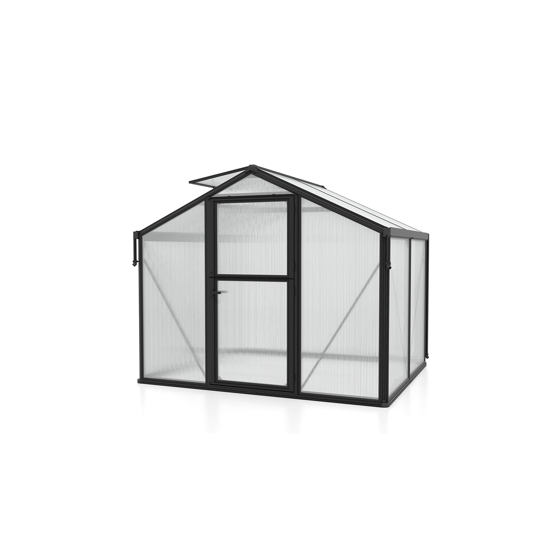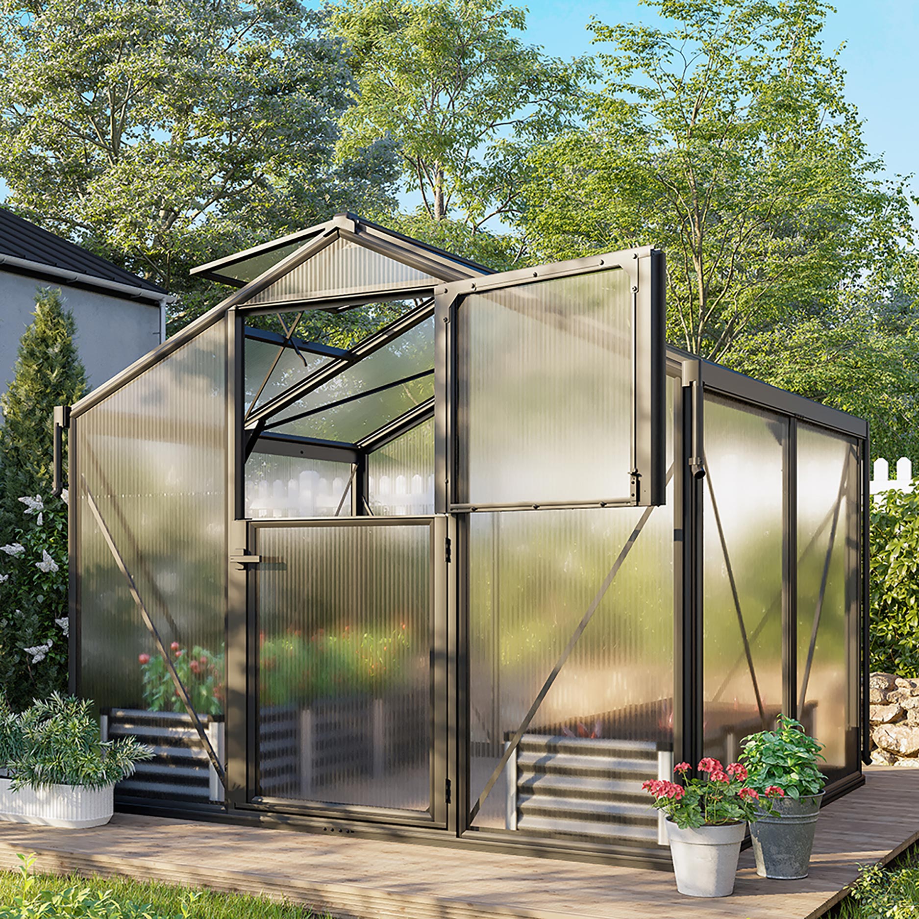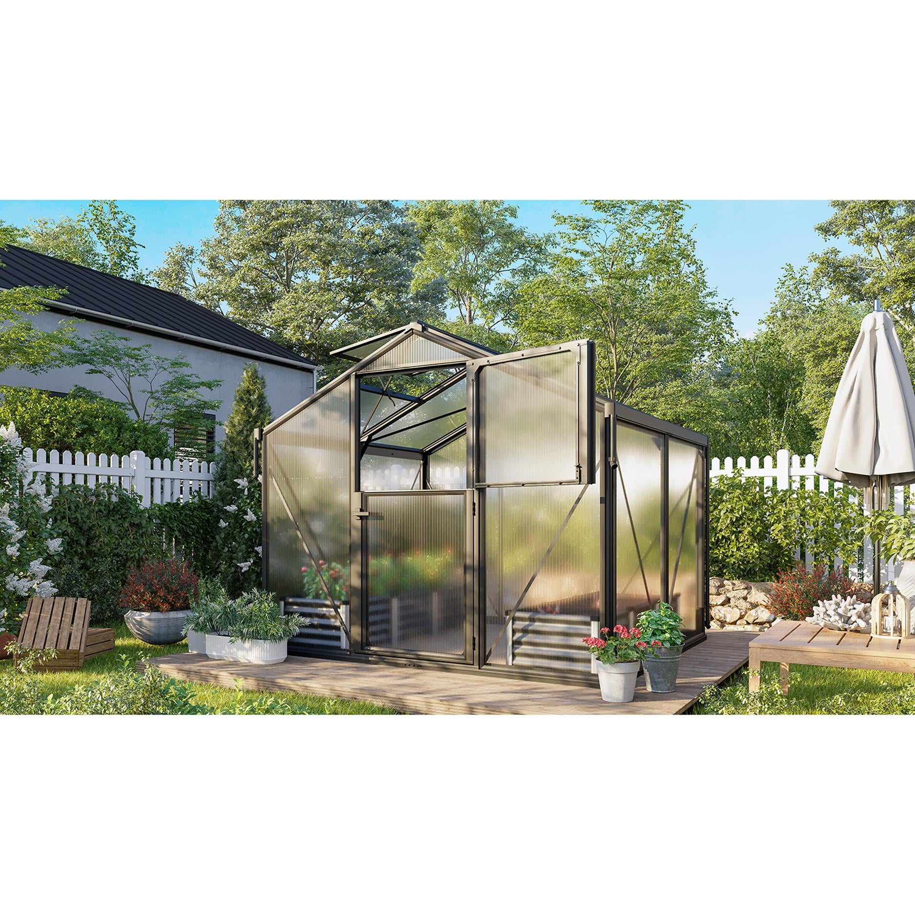 Konstruktionen består av robust aluminium med extra förstärkta profiler och en innovativ montering med aluminiumklämprofiler, där paneler kläms fast mellan lister för att maximalt skydda kanterna mot smuts och slitage. Glasmontaget består av en kombination av 10 mm kanalplast i taket och 3 mm säkerhetsglas i sidoväggarna, vilket ger en optimal balans mellan ljusinsläpp, isolering och hållbarhet. Dessutom levereras växthuset som standard med hängrännor, stuprör och ett takfönster. Tack vare stalldörren är naturlig ventilation enkel, även utan att öppna dörren helt.