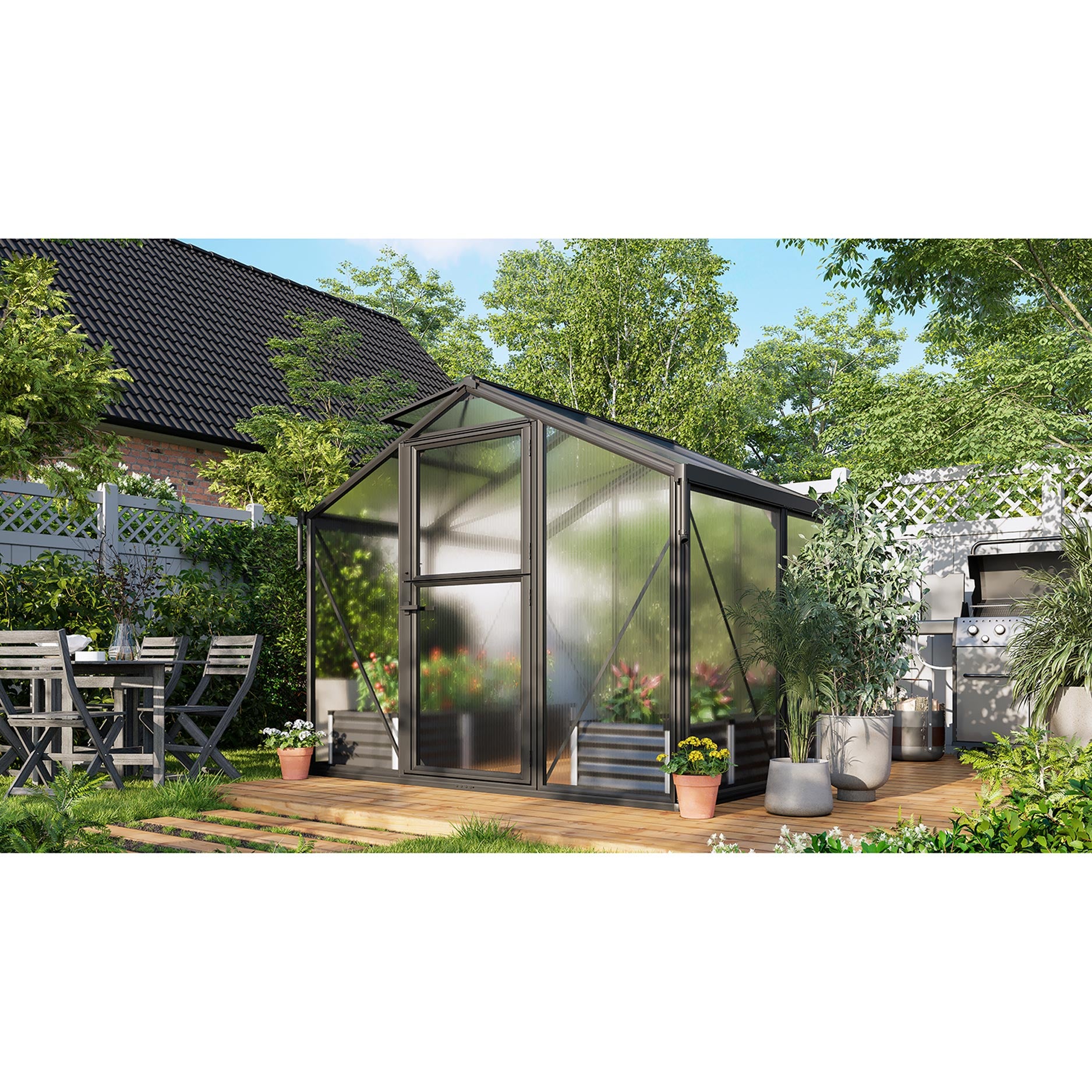 Deimos 5800 passar utmärkt för dig som vill ha gott om utrymme utan att direkt ställa upp ett mycket stort växthus. Med en golvyta på ca 5,8 m² erbjuder detta växthus gott om odlingsutrymme för grönsaker, frukt och prydnadsväxter, samtidigt som det förblir tillräckligt kompakt för den genomsnittliga villaträdgården. Tack vare den smarta stalldörren (övre och nedre del kan öppnas separat) kan du vid varmt väder ordna ventilation utan att oönskade besökare tar sig in i växthuset. Formen är stram och elegant, vilket gör detta växthus till ett verkligt tillskott i varje trädgård.