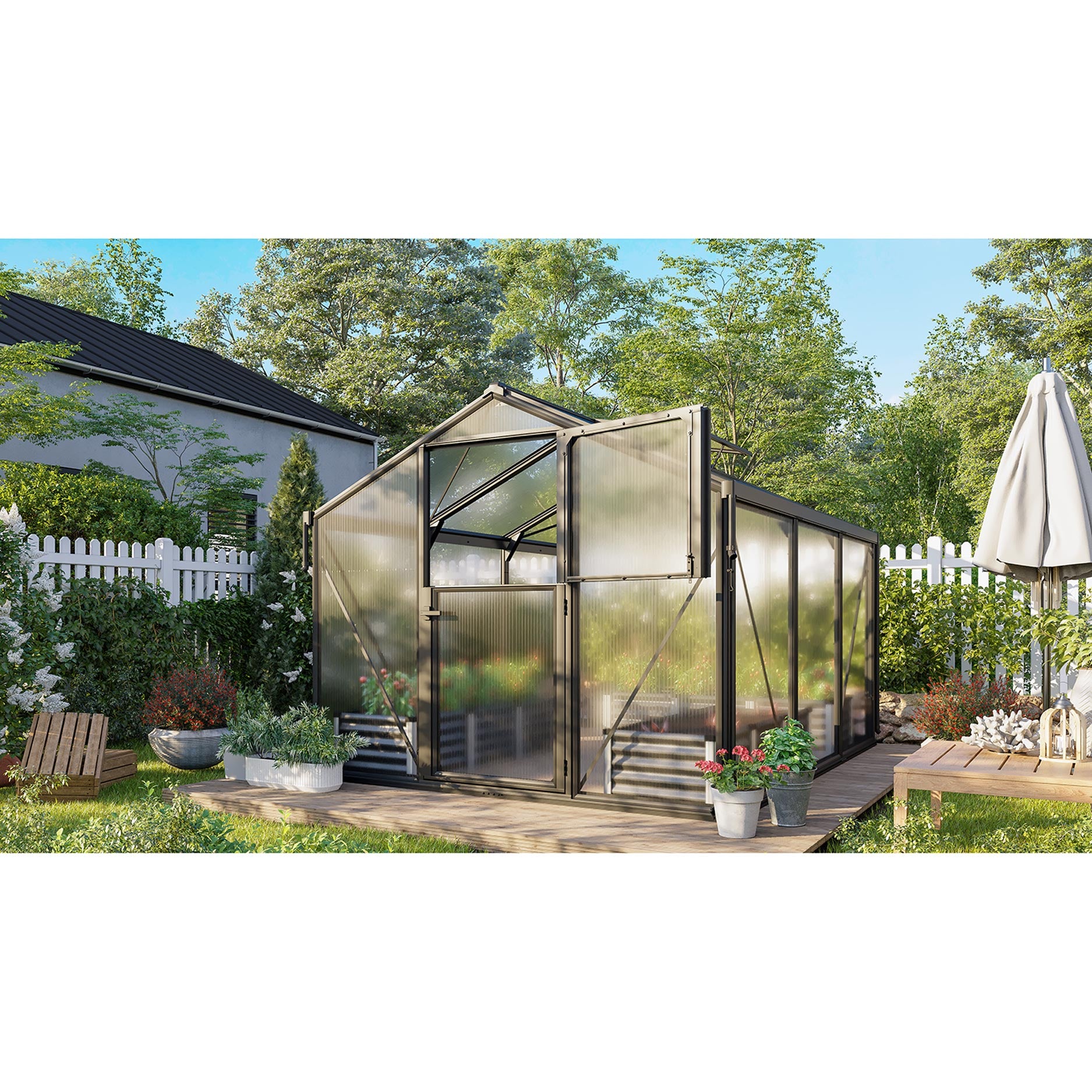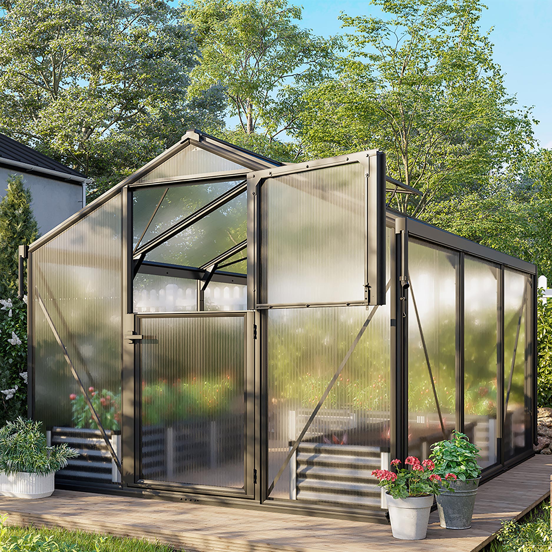 Deimos 8500 är idealisk för odlare som söker en rymlig modell med särskilt goda ventilationsmöjligheter. Med 8,5 m² odlingsyta och en bekväm höjd kan du få plats med både grönsaker, frukt och prydnadsväxter. Det som gör modellen extra speciell är stalldörren med delbar över- och underdel: du öppnar överdelen för frisk luft, medan underdelen förblir stängd för att hålla oönskade besökare ute. Dessutom ger den strama designen ett stilrent intryck i trädgården, samtidigt som du får den funktionalitet du behöver.