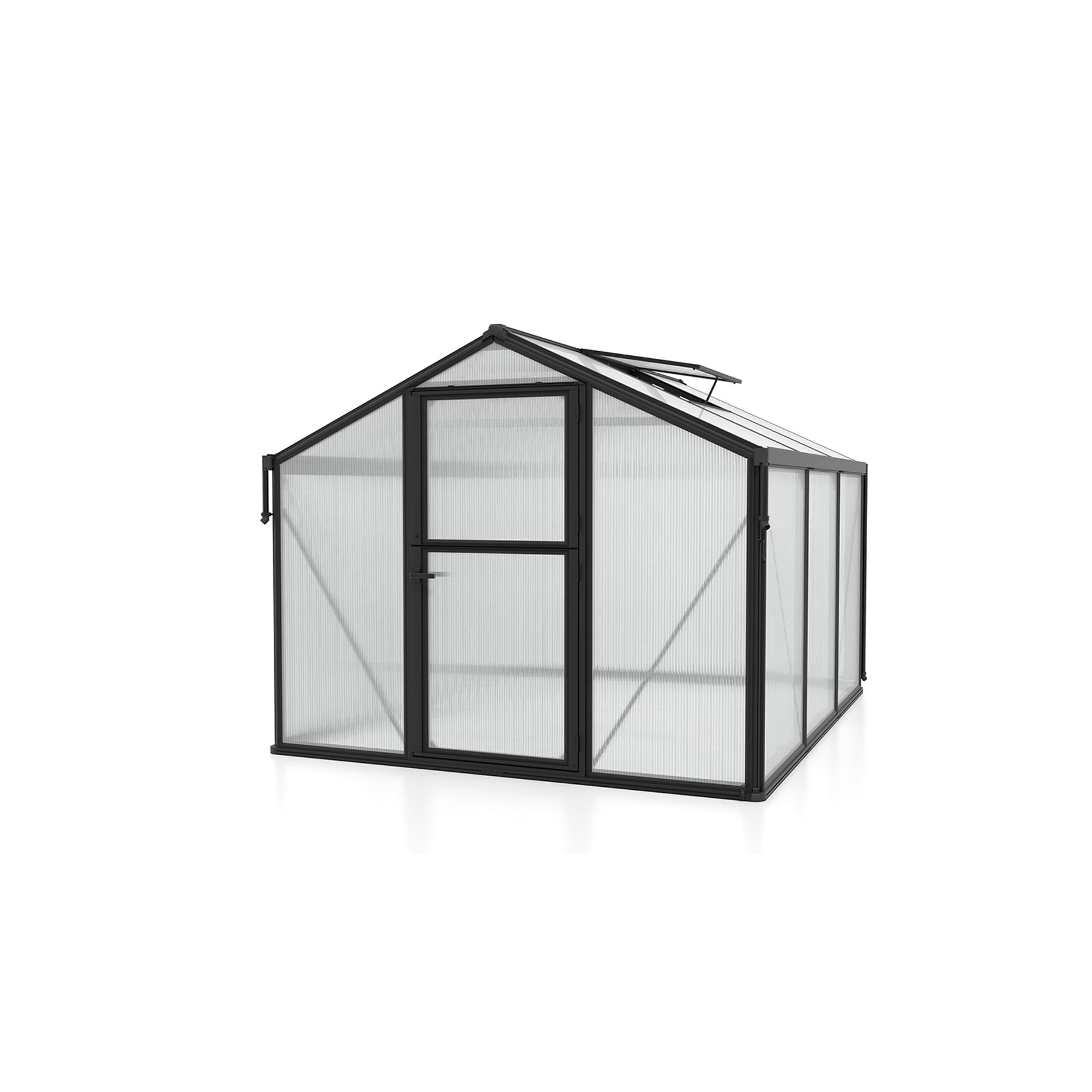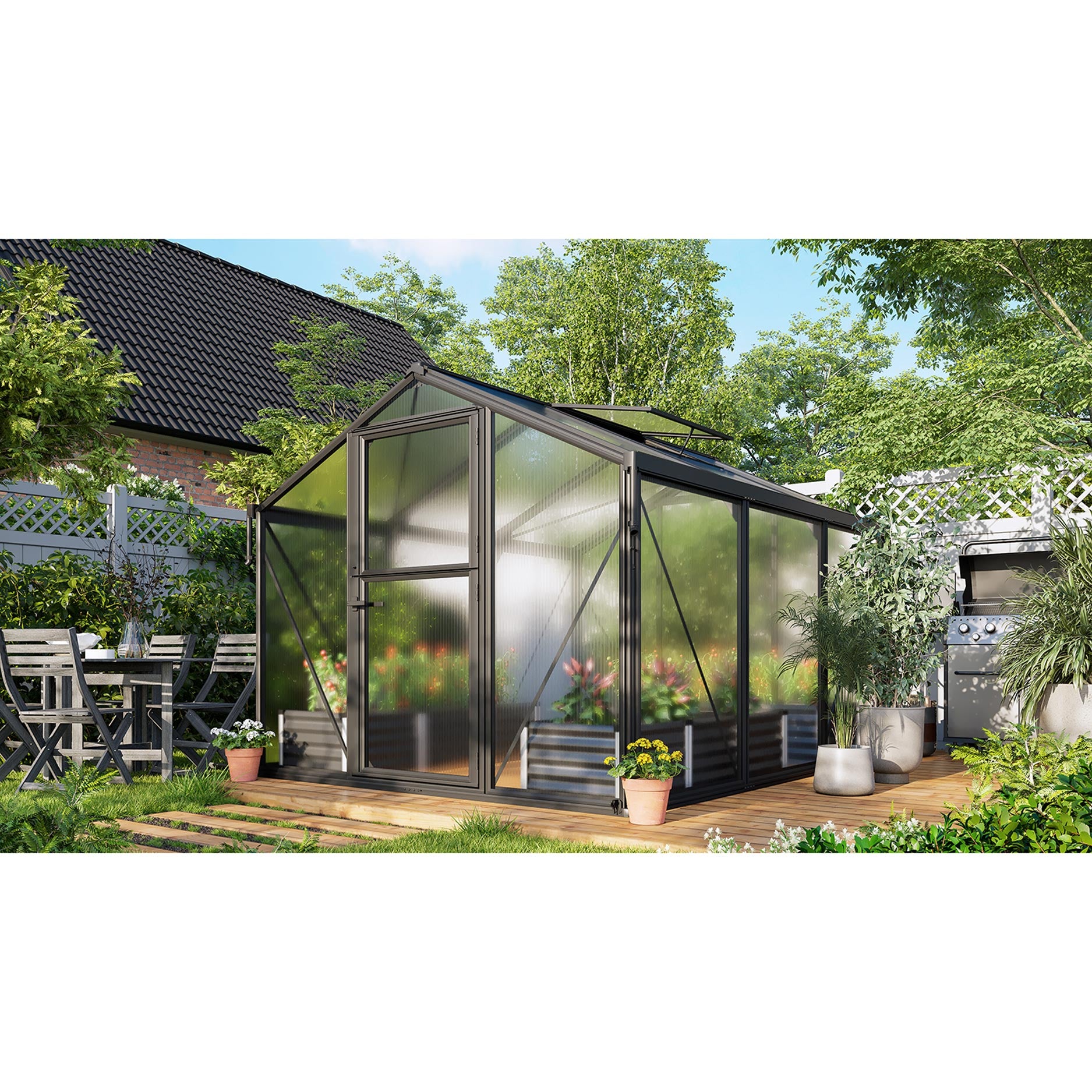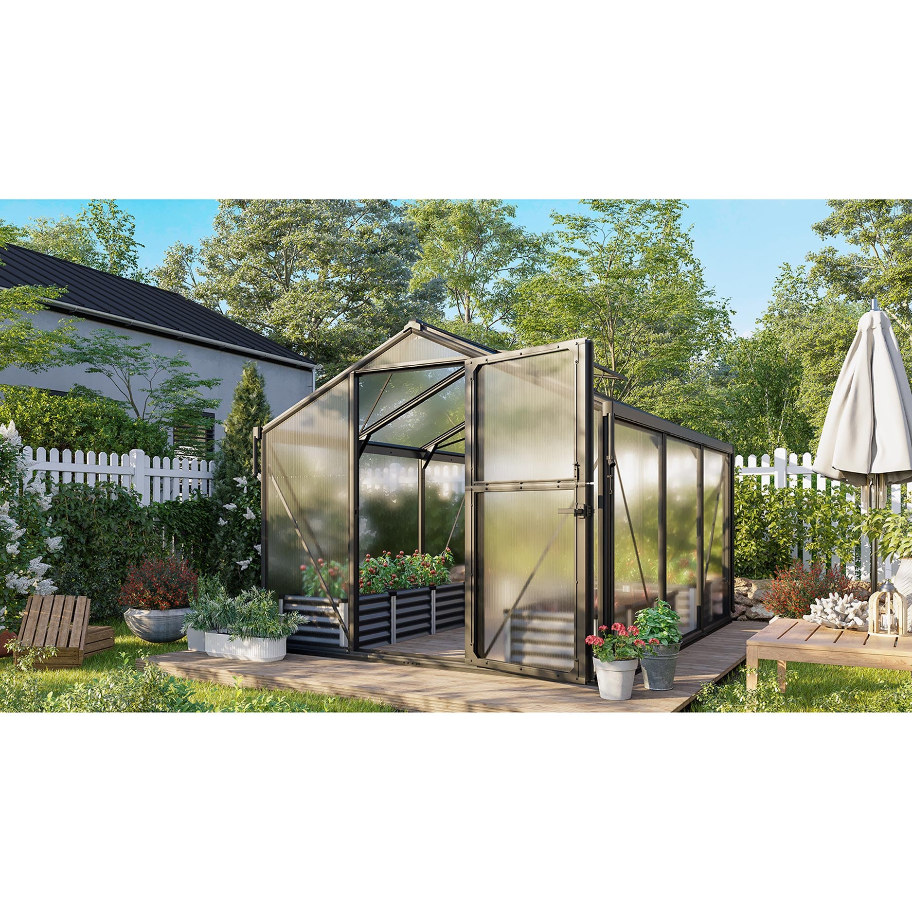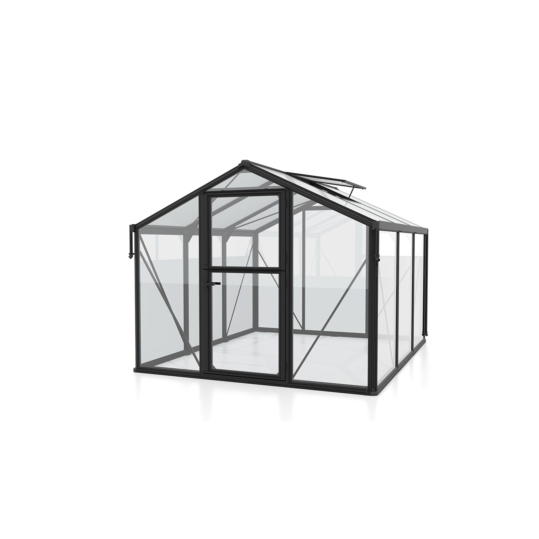Växthuset har en robust aluminiumkonstruktion, kombinerad med innovativ montering via aluminium klämprofiler: panelerna kläms fast mellan lister, vilket ger kanterna extra skydd mot smuts och slitage. Glasningen är en kombination av 10 mm kanalplast i taket och 3 mm säkerhetsglas i väggarna — en stark kombination för både ljusinsläpp och stabilitet. Som standard har växthuset hängrännor, stuprör och ett takfönster, och stalldörren stödjer naturlig ventilation utan att du behöver öppna en dörr helt.