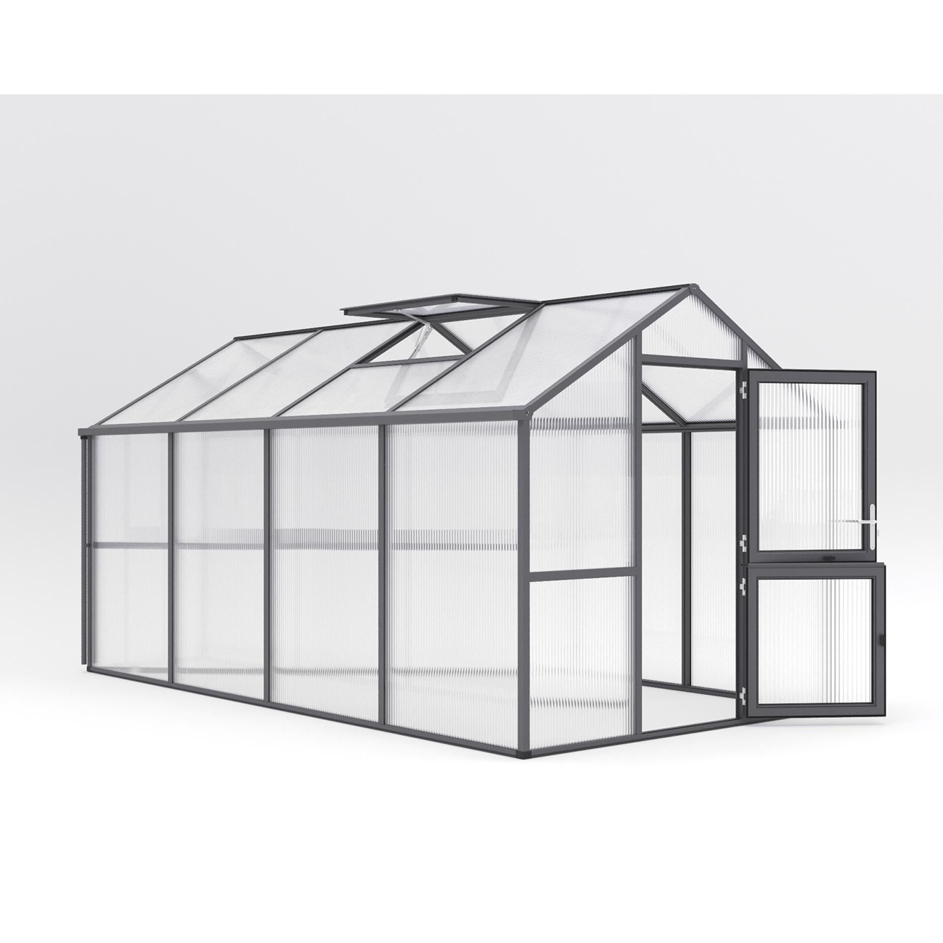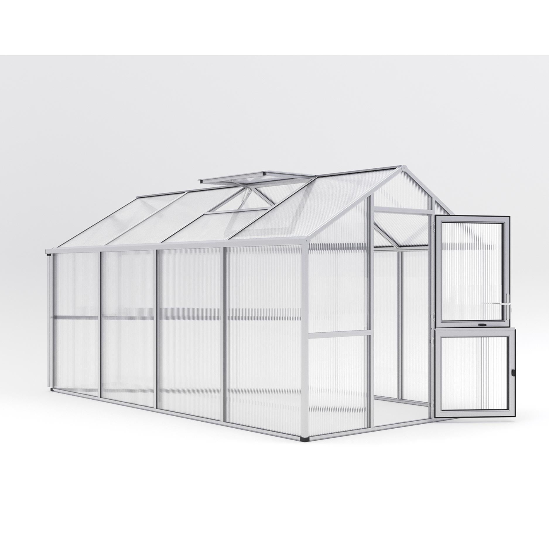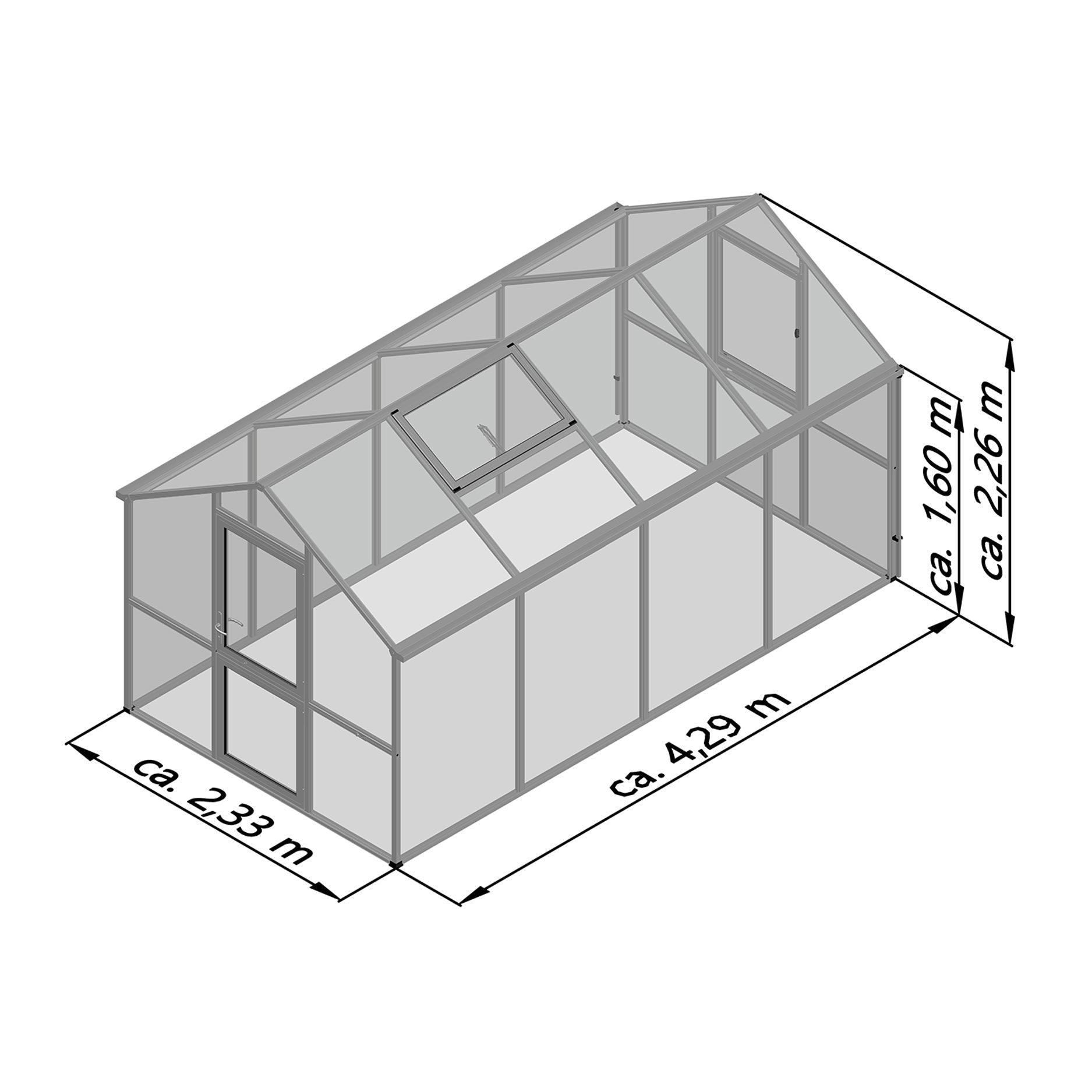 Konstruktionen är uppbyggd av en robust aluminiumram med 16mm kanalplastskivor som ger det högsta isoleringsvärdet inom KGT-sortimentet. Skivorna är UV-skyddade, släpper igenom diffust ljus och är i stort sett okrossbara. Iris IV är utrustad med en bred slagdörr, ett automatiskt takfönster, ett manuellt bakre fönster och dubbla hängrännor för avrinning eller uppsamling av regnvatten. Med den valfria grundramen står växthuset bergfast, även vid hård vind och långvarig belastning.