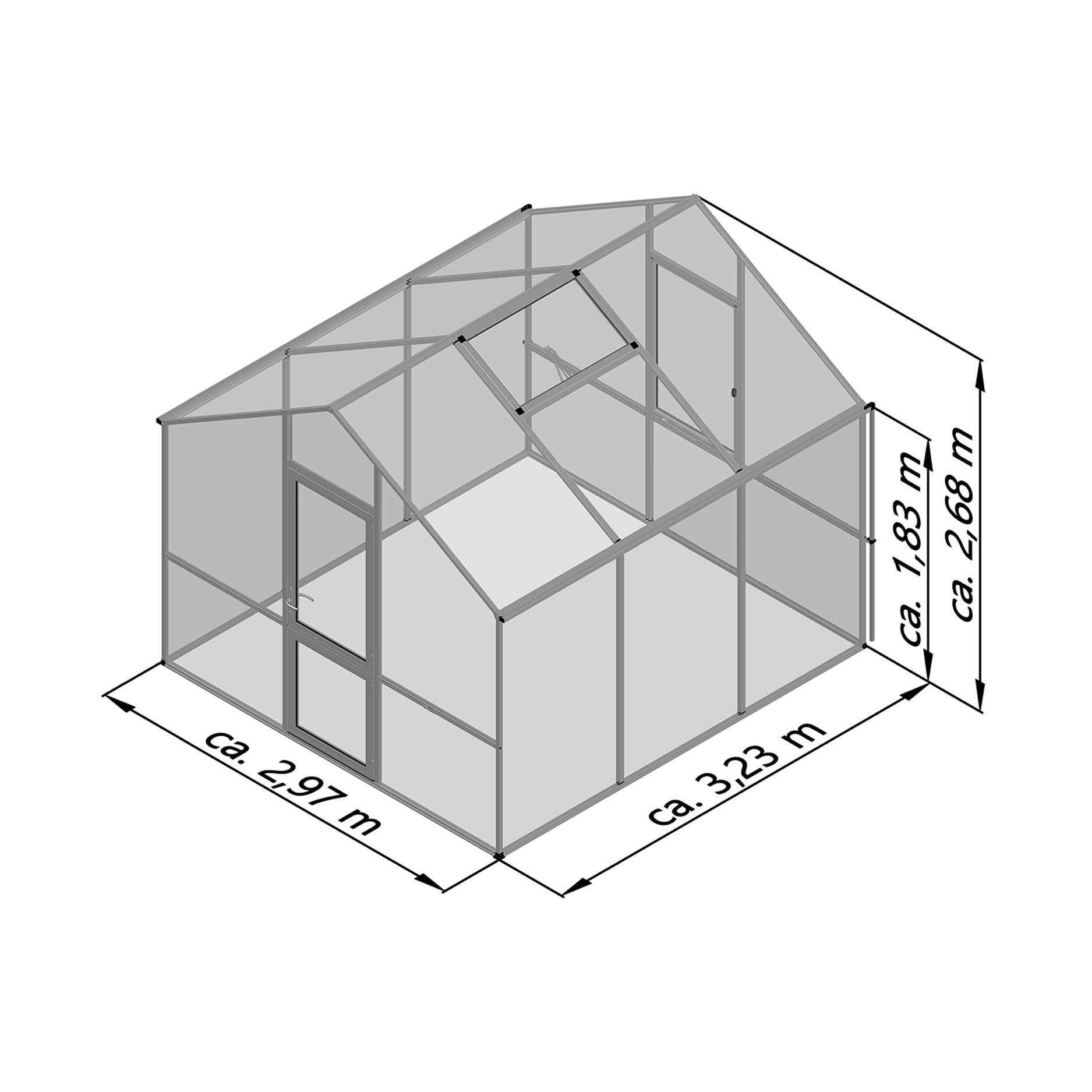 Konstruktionen består av en robust, underhållsfri aluminiumkonstruktion med 10 mm kanalplast som garanterar utmärkt isolering och ljusspridning. Skivorna är UV-skyddade, vilket gör att de förblir klara i många år och att dina växter inte bränns vid stark sol. Tack vare goda isolervärden håller sig temperaturen inne stabil längre, vilket förlänger odlingssäsongen avsevärt. Växthuset är utrustat med en bred svängdörr, ett takfönster med automatisk öppnare och ett manuellt bakre fönster för luftcirkulation. Hängrännor på båda sidor leder bort nederbörd eller möjliggör anslutning till ett uppsamlingssystem. Med den valfria grundramen står växthuset stadigt förankrat, även vid vindbelastning eller mjukt underlag.