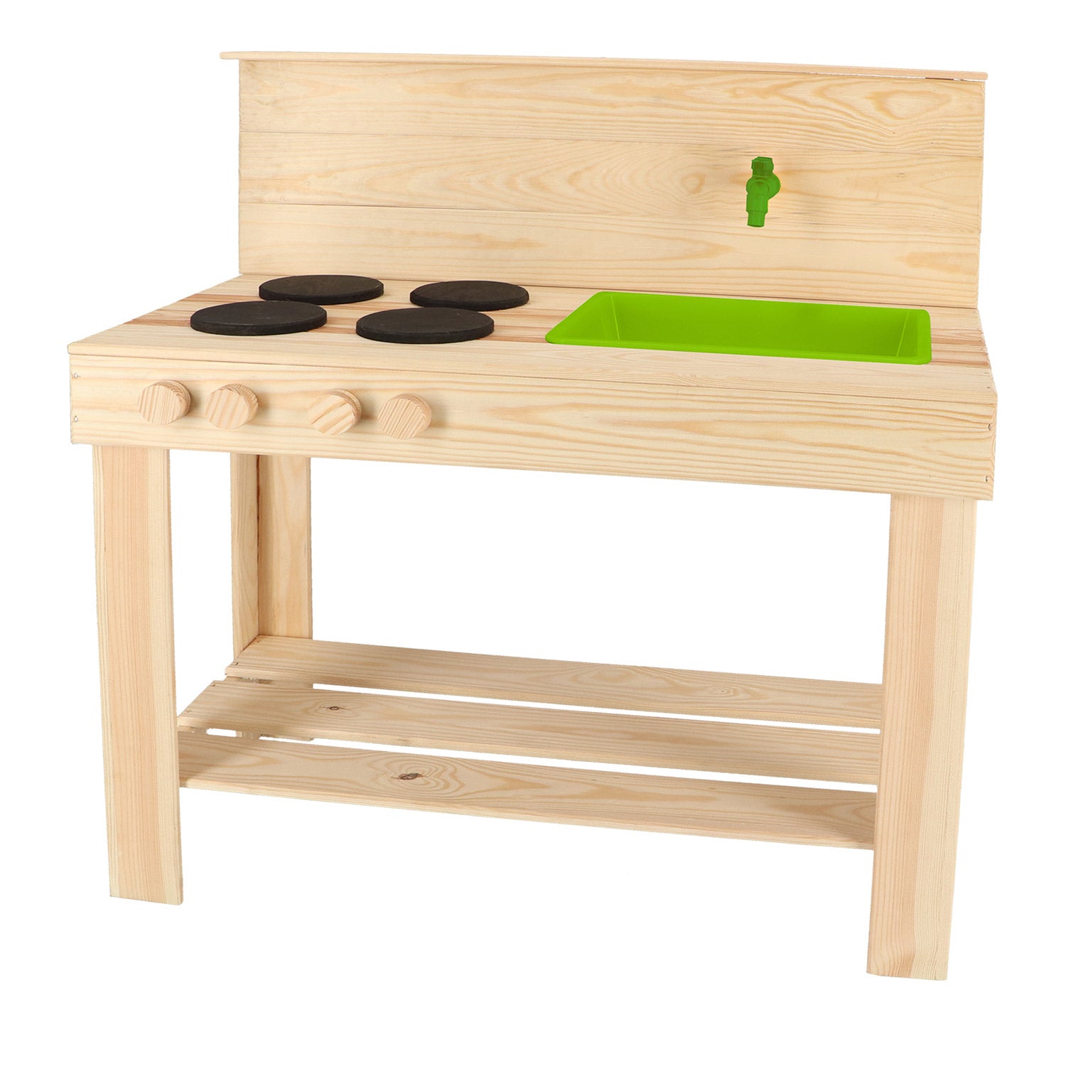 Modderkeuken M uppmuntrar barnen att experimentera med lera, vatten och sand. Detta robusta kök är tillverkat av FSC-certifierat furu och har en praktisk plastbalja för enkel rengöring och för att blanda material. Den inbyggda kranen kan anslutas till en trädgårdsslang, så att barnen kan få uppleva riktig vattenlek.