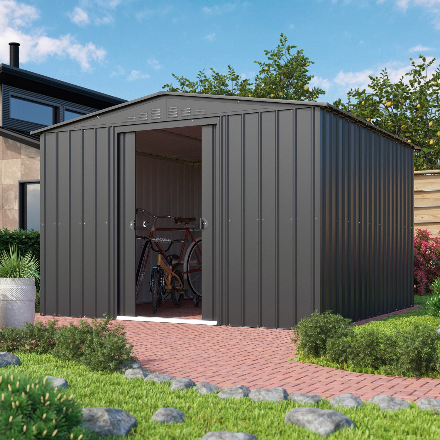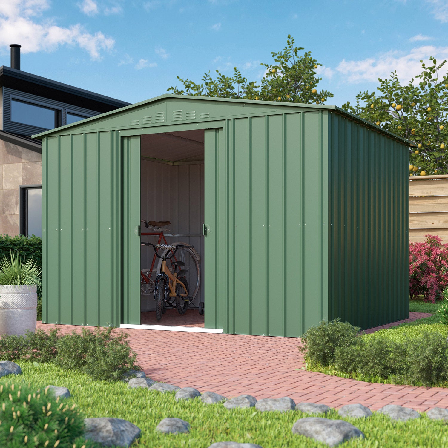 Dream 1010 är kanske Globels bästa stora allround-förråd. Med en yta på 8,82m² får du gott om plats för cyklar, hyllställ och arbetsbänkar. Den behagliga nockhöjden på 202 cm gör att (de flesta) kan stå upprätt. Detta fina metallförråd finns i 3 färger. Alla utvändiga delar är emaljerade och varmförzinkade. Denna behandling ger inte bara ett utmärkt skydd mot väder och vind, den är också mycket reptålig och stöttålig. Dream har en dubbel skjutdörr, med en sammanlagd bredd på 105 cm.