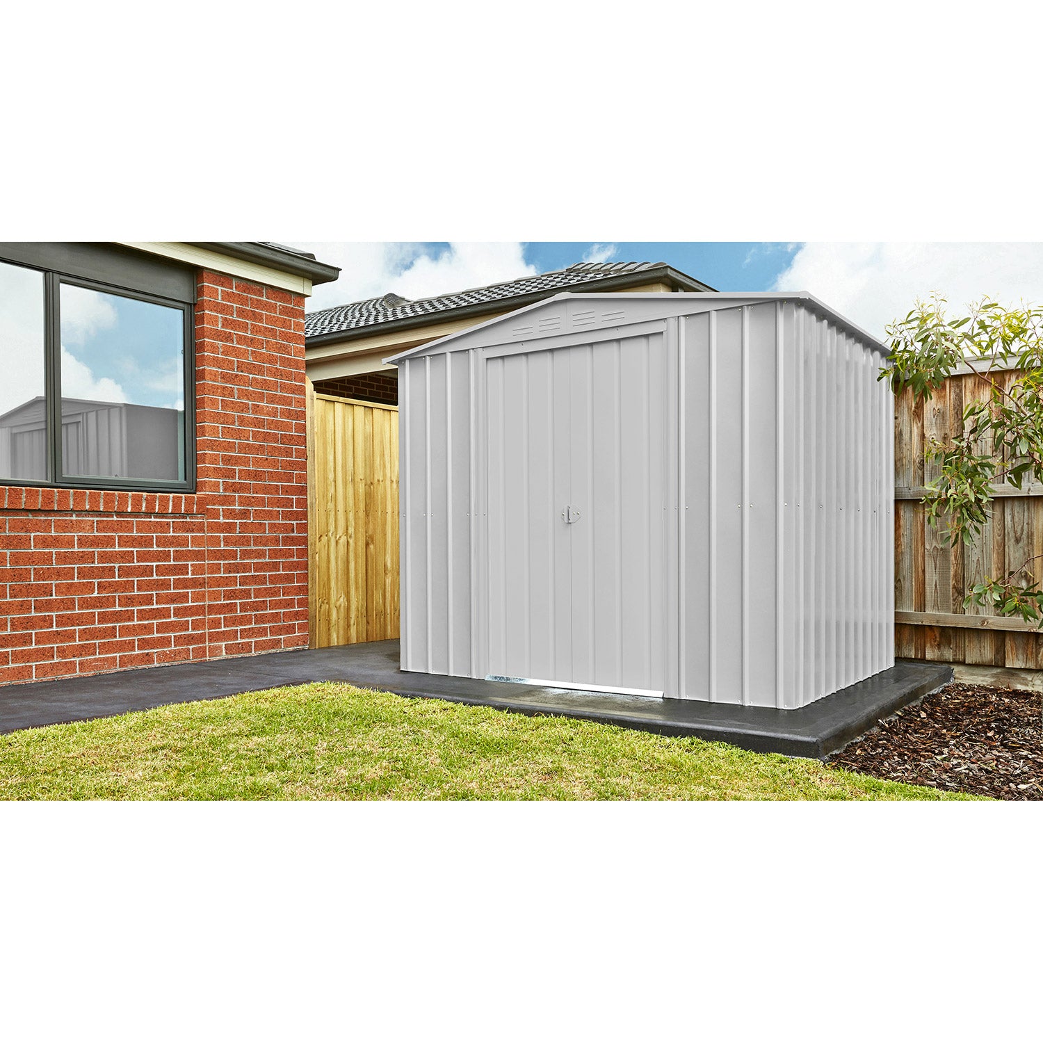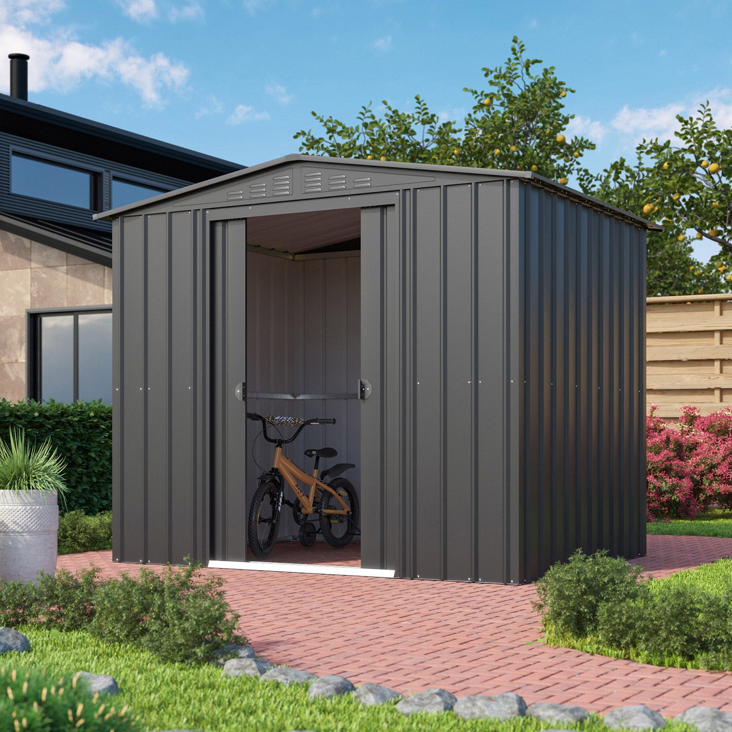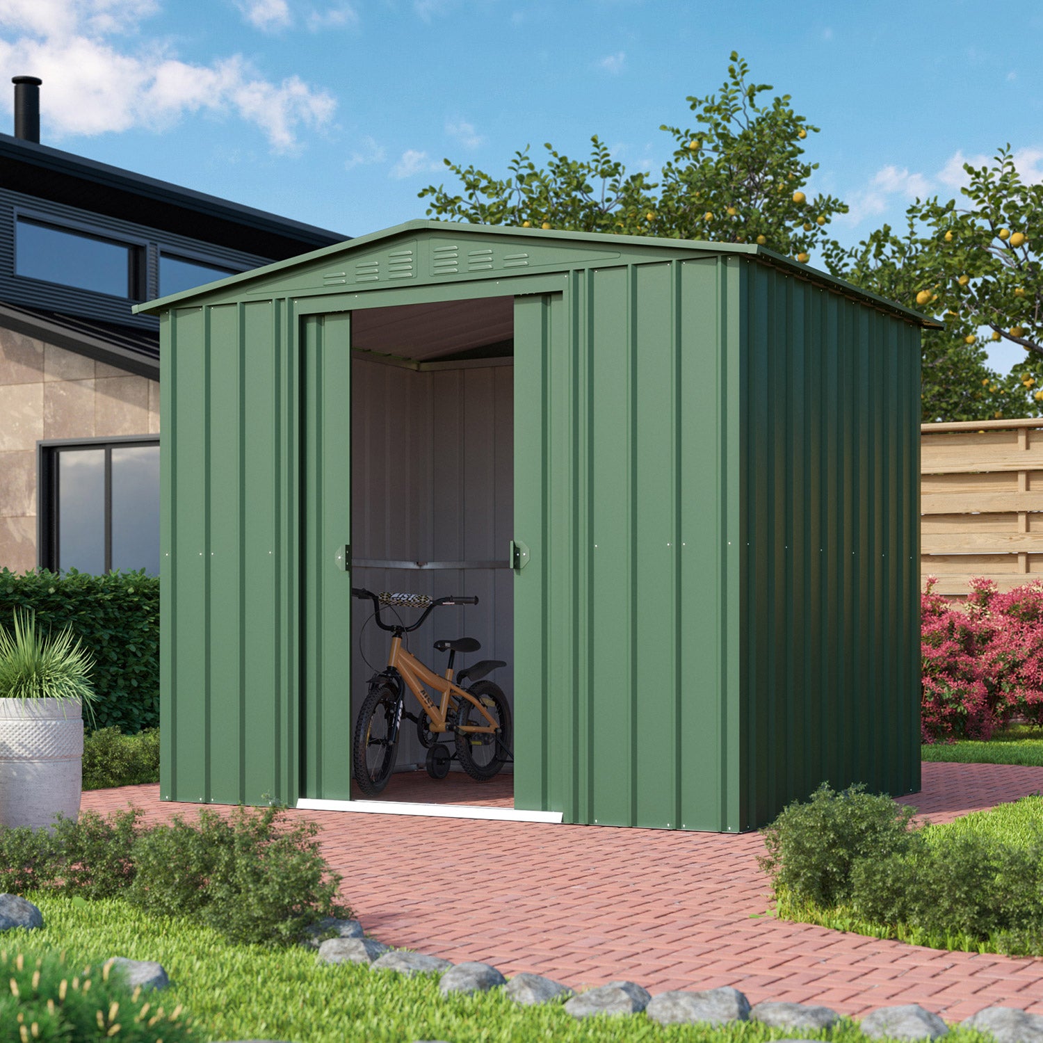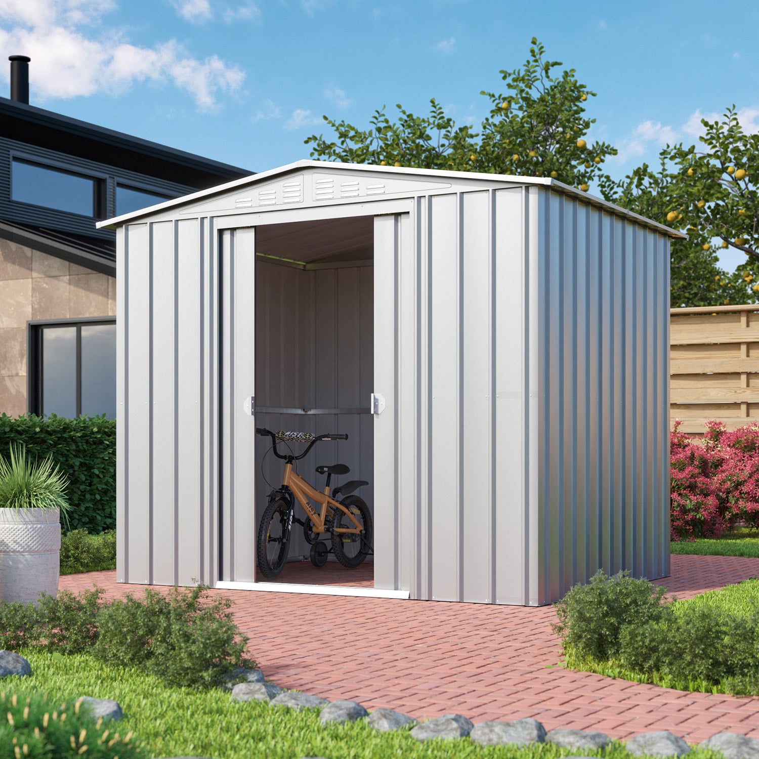 Dream 86 är kanske Globels bästa allround-förråd. Med en yta på 4,1m2 får du utan problem plats med cyklar, hyllställ och en arbetsbänk. Den behagliga nockhöjden på 198cm gör att (de flesta) kan stå upprätt. Detta fina metallförråd finns i 3 färger. Alla ytterdelar är emaljerade och termiskt galvaniserade. Denna behandling ger inte bara ett utmärkt skydd mot väder och vind, den är också mycket rep- och stöttålig. Dream har en dubbel skjutdörr med en sammanlagd bredd på 105cm.
