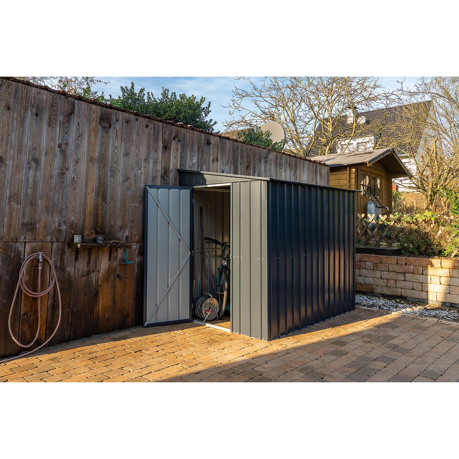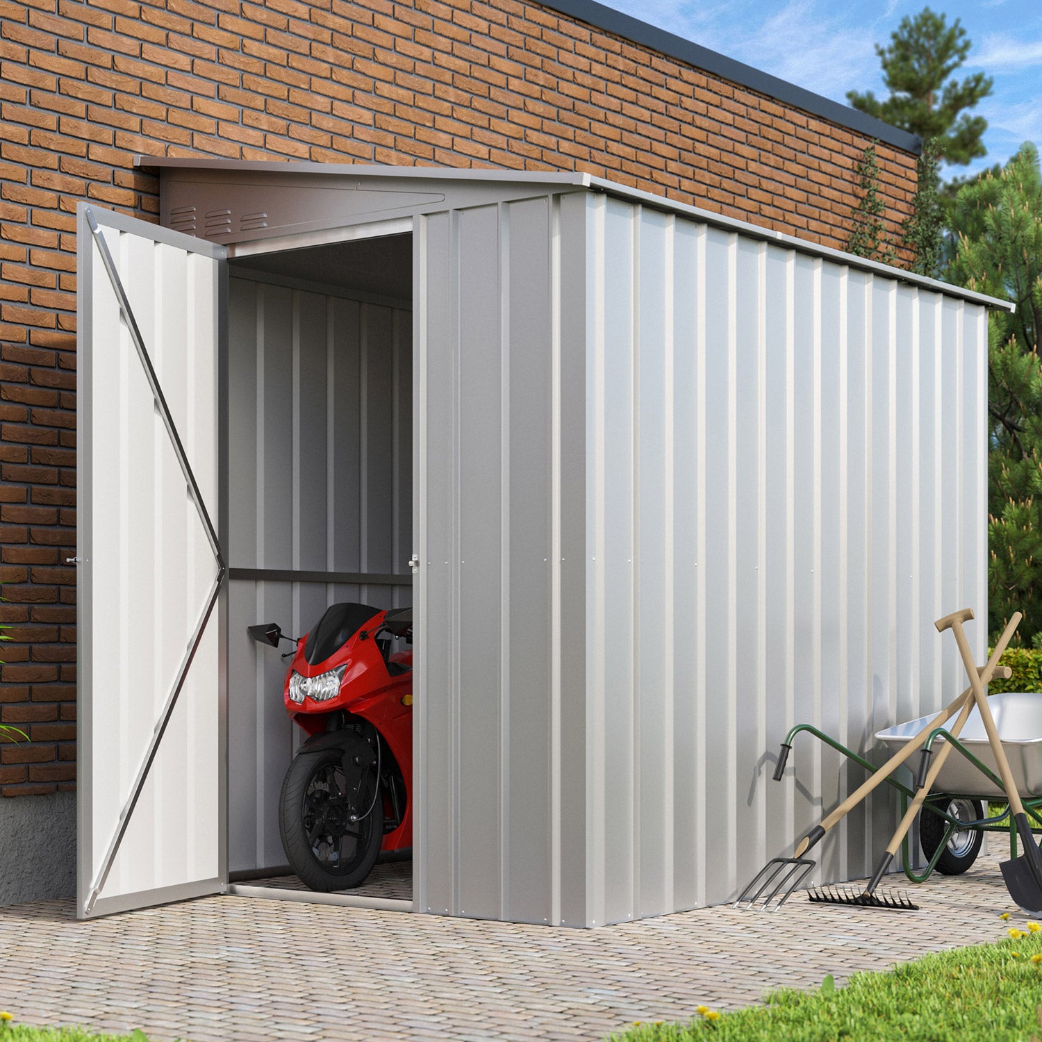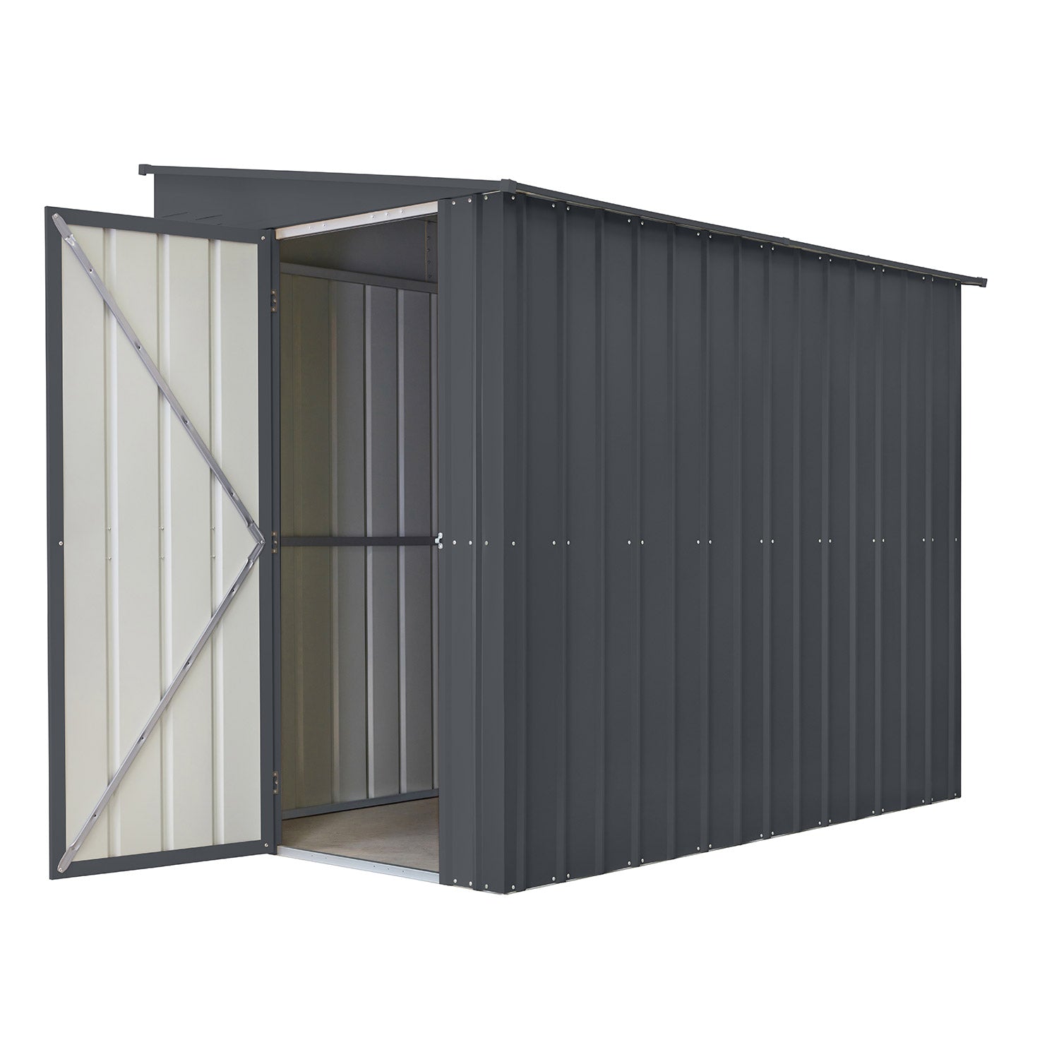 De Lean-To 58 är ett unikt förråd med ett modernt utseende. Detta förråd är perfekt för placering, på längden, mot en lång vägg. Med en yta på 3,37m2 får du gott om plats för cyklar, hyllsystem och arbetsbänkar. Detta rymliga metallförråd finns i 3 färger. Alla utvändiga delar är emaljerade och termiskt varmförzinkade. Denna behandling ger inte bara ett utmärkt skydd mot väder och vind, den är också mycket reptålig och slagtålig. Lean-to har en enkel slagdörr med en bredd på 67cm, som kan monteras så att den öppnas från fram- eller baksidan.