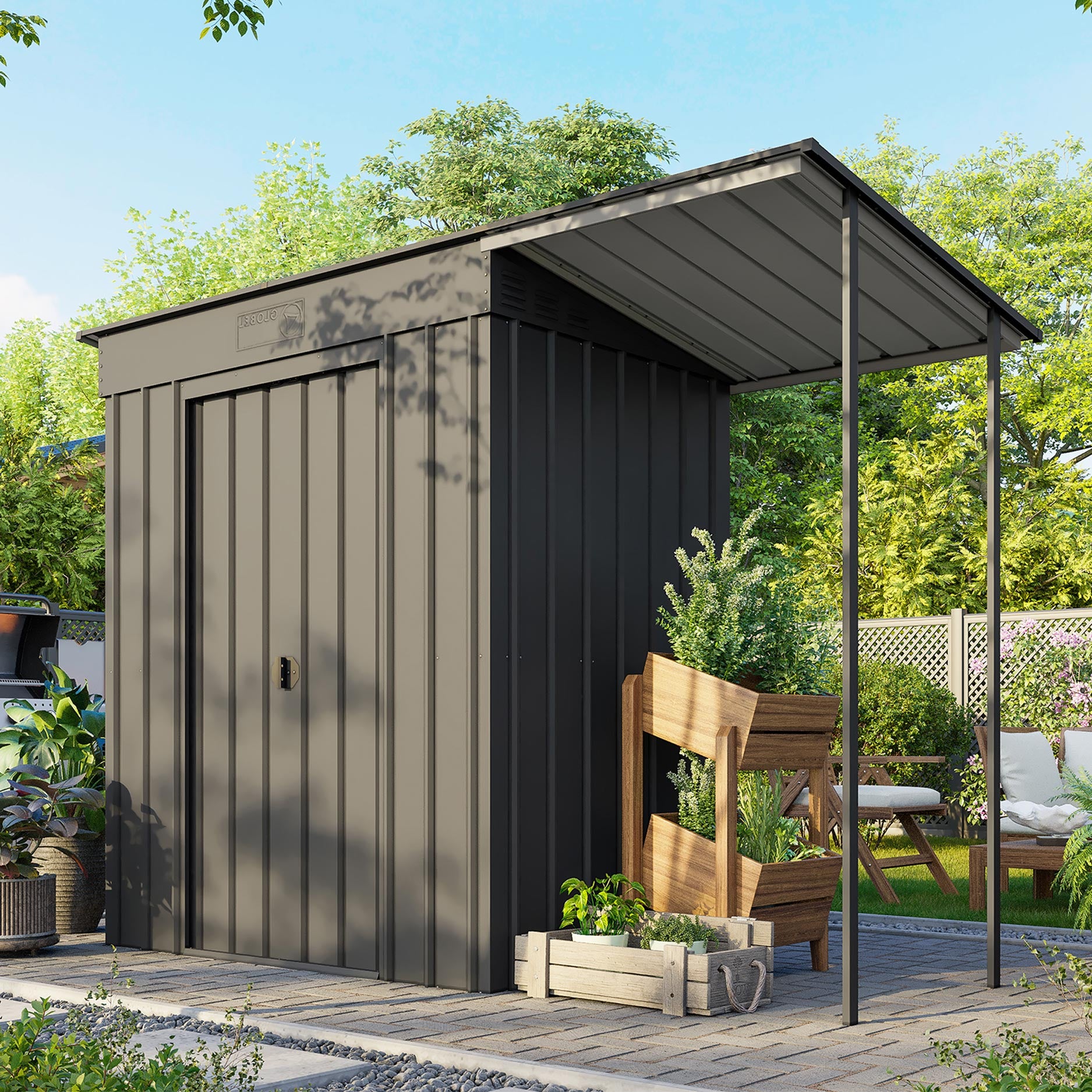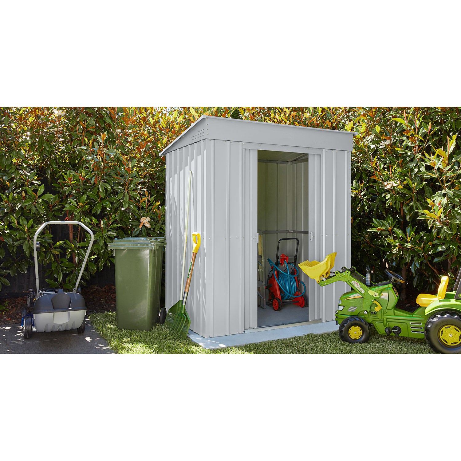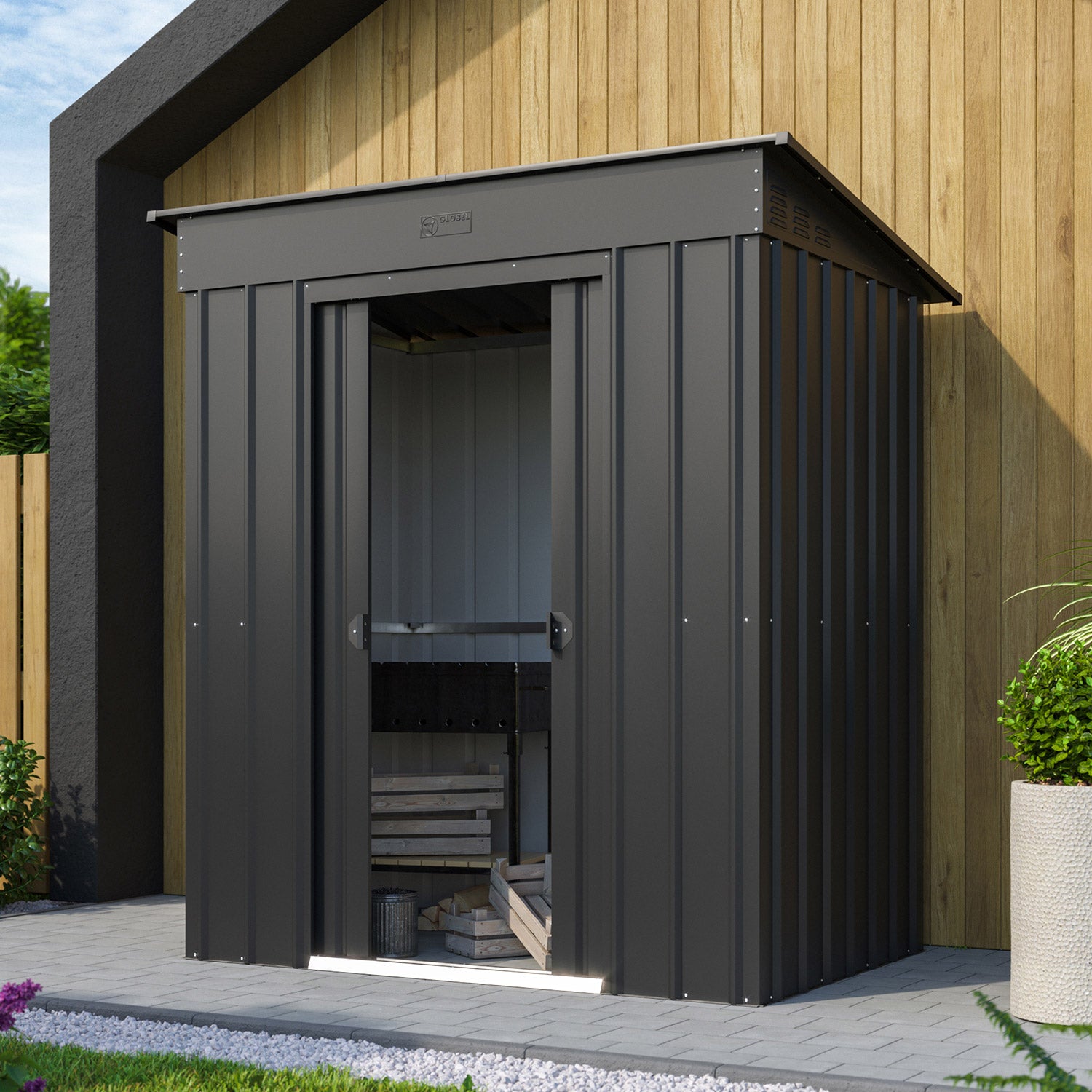 De Skillion 64 är ett kompakt förråd med ett modernt uttryck. Detta förråd är perfekt att placera, på bredden, mot en lång vägg. Med en yta på 1,93m² får du utan problem plats med en cykel, hyllsystem eller en arbetsbänk. Detta fina metallförråd finns i 2 färger. Alla utvändiga delar är emaljerade och varmförzinkade. Denna behandling ger inte bara ett utmärkt skydd mot väder och vind, den är också mycket rep- och stöttålig. Skillion har en dubbel skjutdörr, med en sammanlagd bredd på 64 cm. Och vill du hellre förvara något utomhus? Med utbyggnadsmodulen kan du fästa ett extra tak på Skillion-förrådet och på så sätt skapa en snygg takkonstruktion.