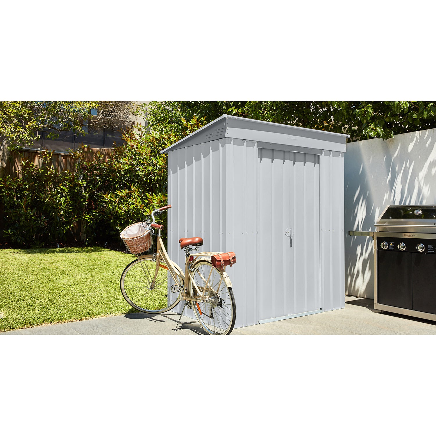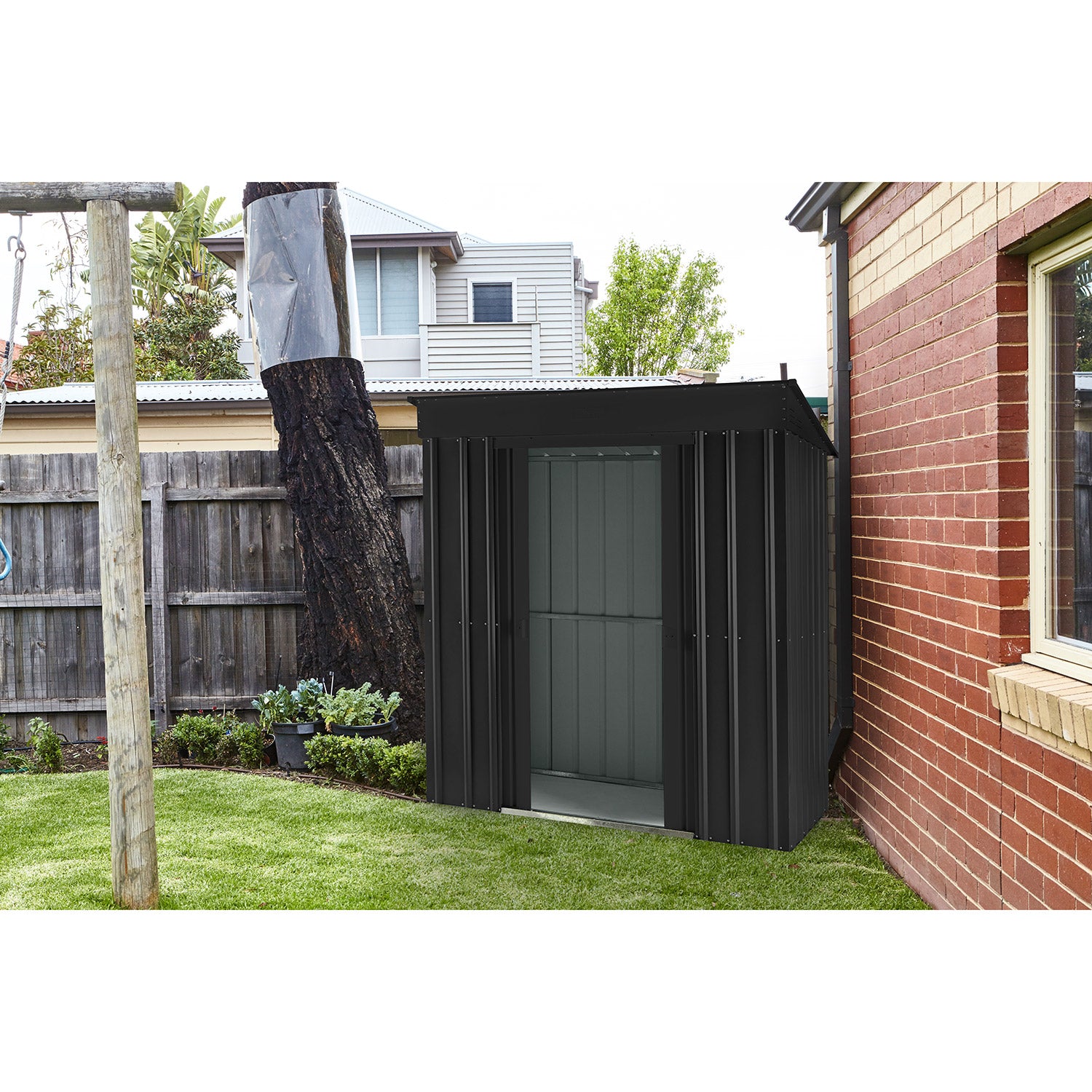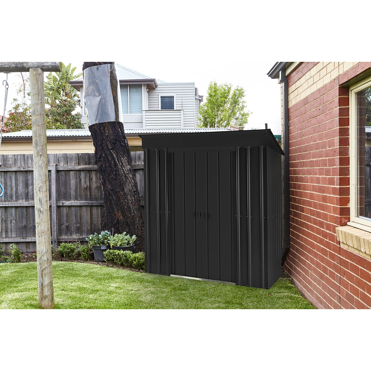 De Skillion 64 är ett kompakt förråd med ett modernt uttryck. Detta förråd är perfekt att placera, på bredden, mot en lång vägg. Med en yta på 1,93m² får du utan problem plats med en cykel, hyllsystem eller en arbetsbänk. Detta fina metallförråd finns i 2 färger. Alla utvändiga delar är emaljerade och varmförzinkade. Denna behandling ger inte bara ett utmärkt skydd mot väder och vind, den är också mycket rep- och stöttålig. Skillion har en dubbel skjutdörr, med en sammanlagd bredd på 64 cm. Och vill du hellre förvara något utomhus? Med utbyggnadsmodulen kan du fästa ett extra tak på Skillion-förrådet och på så sätt skapa en snygg takkonstruktion.
