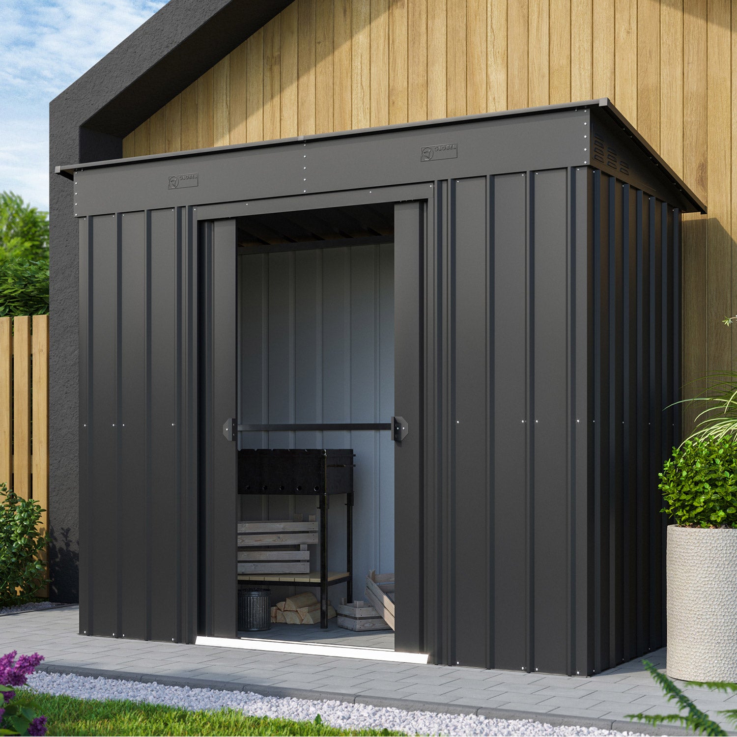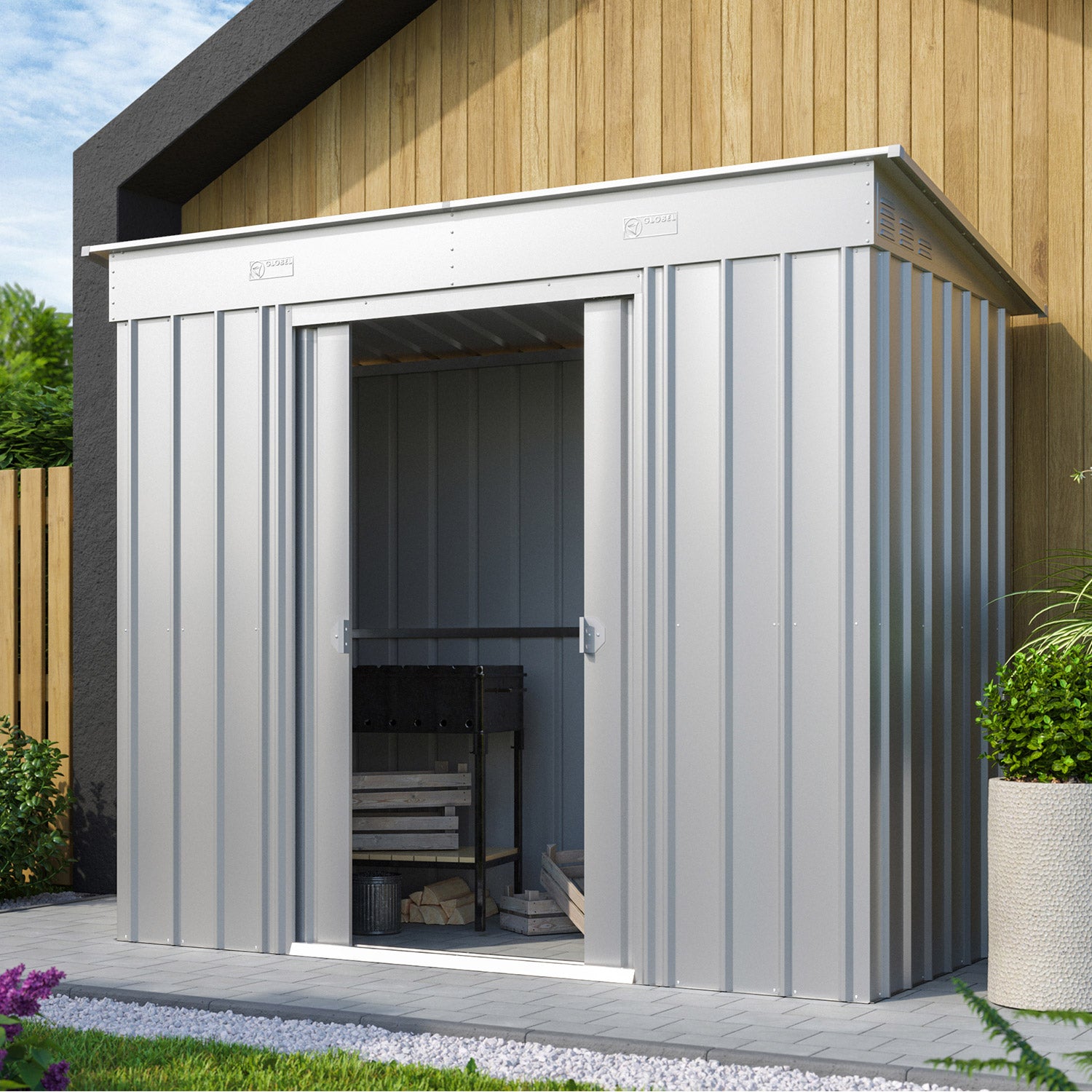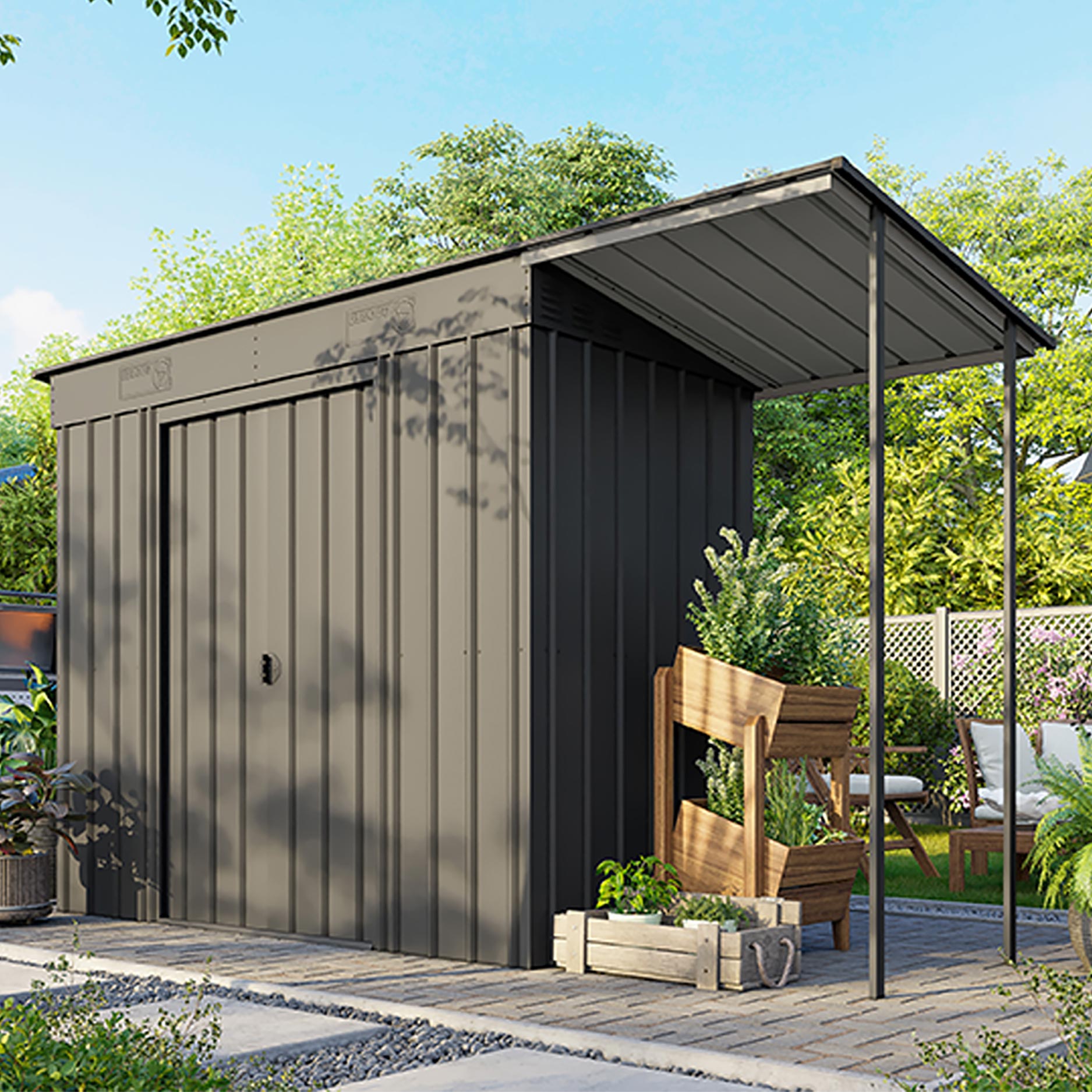 De Skillion 84 är ett kompakt förråd med ett modernt uttryck. Detta förråd är perfekt för placering, på bredden, mot en lång vägg. Med en yta på 2,64m² får du utan problem plats med en cykel, hyllställ eller en arbetsbänk. Detta fina metallförråd finns i 2 färger. Alla utvändiga delar är emaljerade och termiskt förzinkade. Denna behandling ger inte bara ett utmärkt skydd mot väder och vind, utan är också mycket rep- och stöttålig. Skillion har en dubbel skjutdörr, med en sammanlagd bredd på 105cm. Vill du hellre förvara något utomhus? Med utbyggnadsmodulen kan du fästa ett extra tak på Skillion-förrådet och på så sätt skapa ett snyggt takskydd.