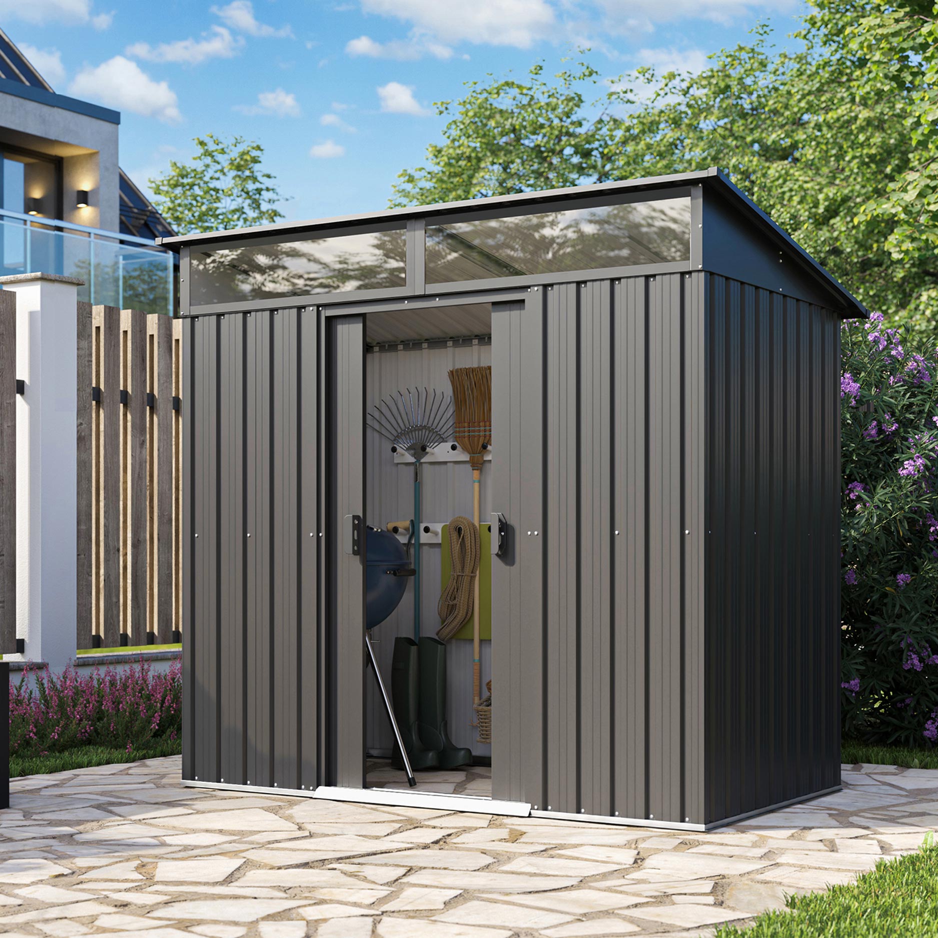Detta praktiska och moderna förråd utnyttjar utrymmet optimalt.