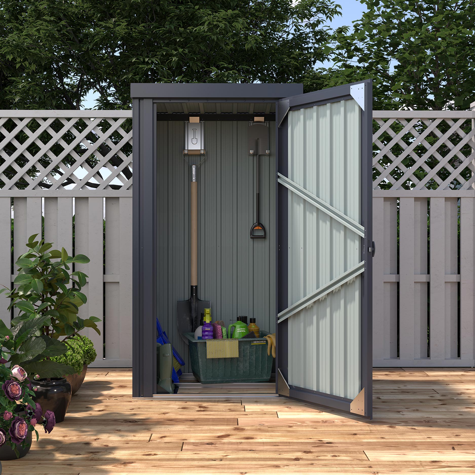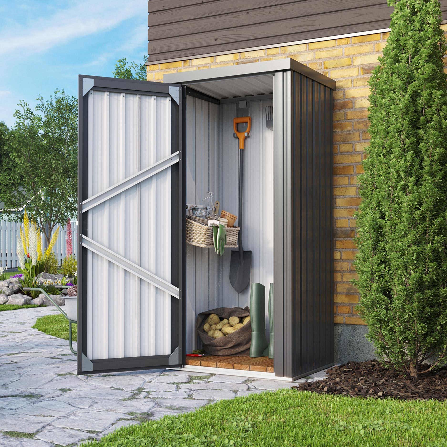 Letar du efter ett litet trädgårdsskjul? Marburg kan du placera var som helst. Med en yta på 0,75m2 förvarar du dina trädgårdsredskap prydligt och torrt. Ett praktiskt och smidigt, (nästan) kvadratiskt trädgårdsskjul.