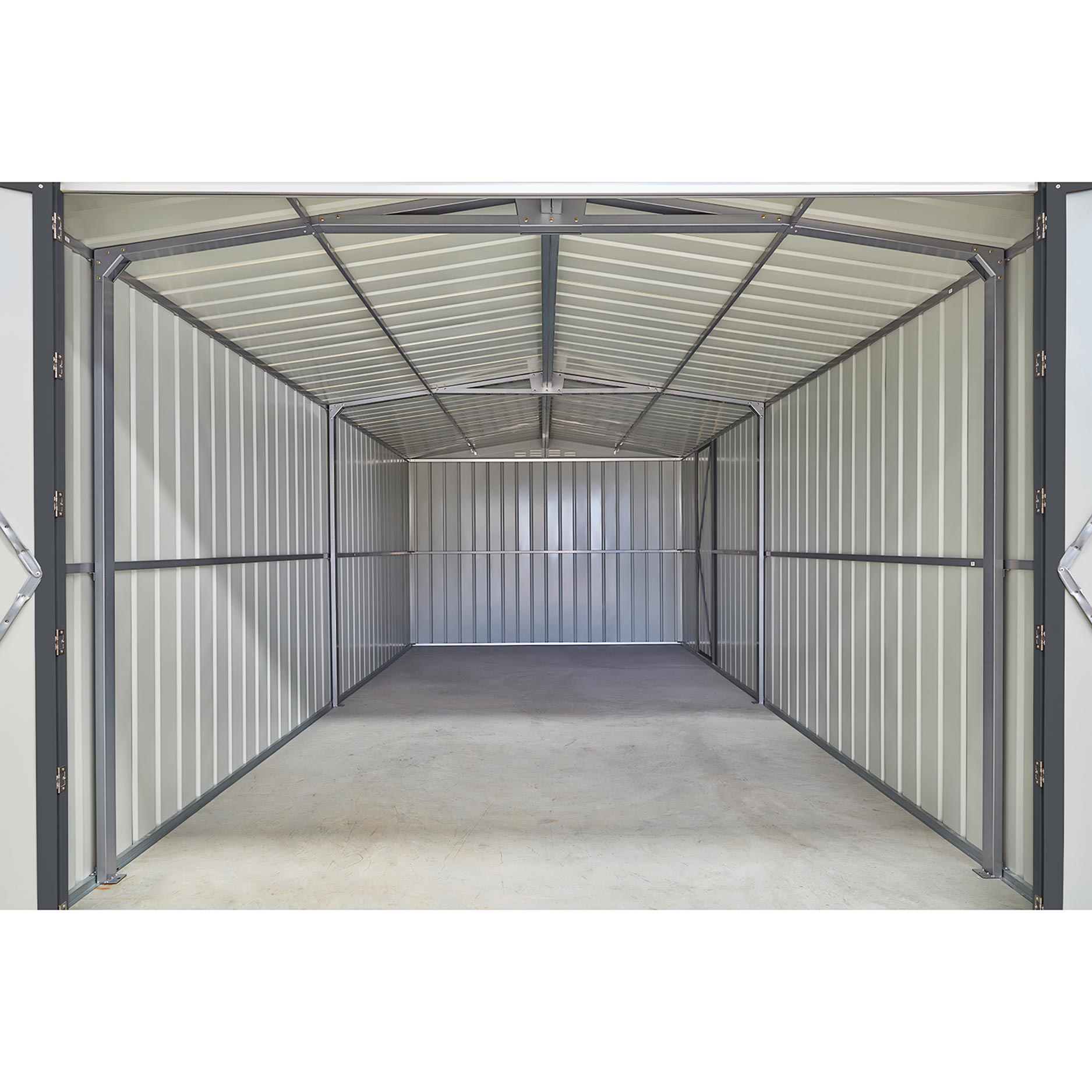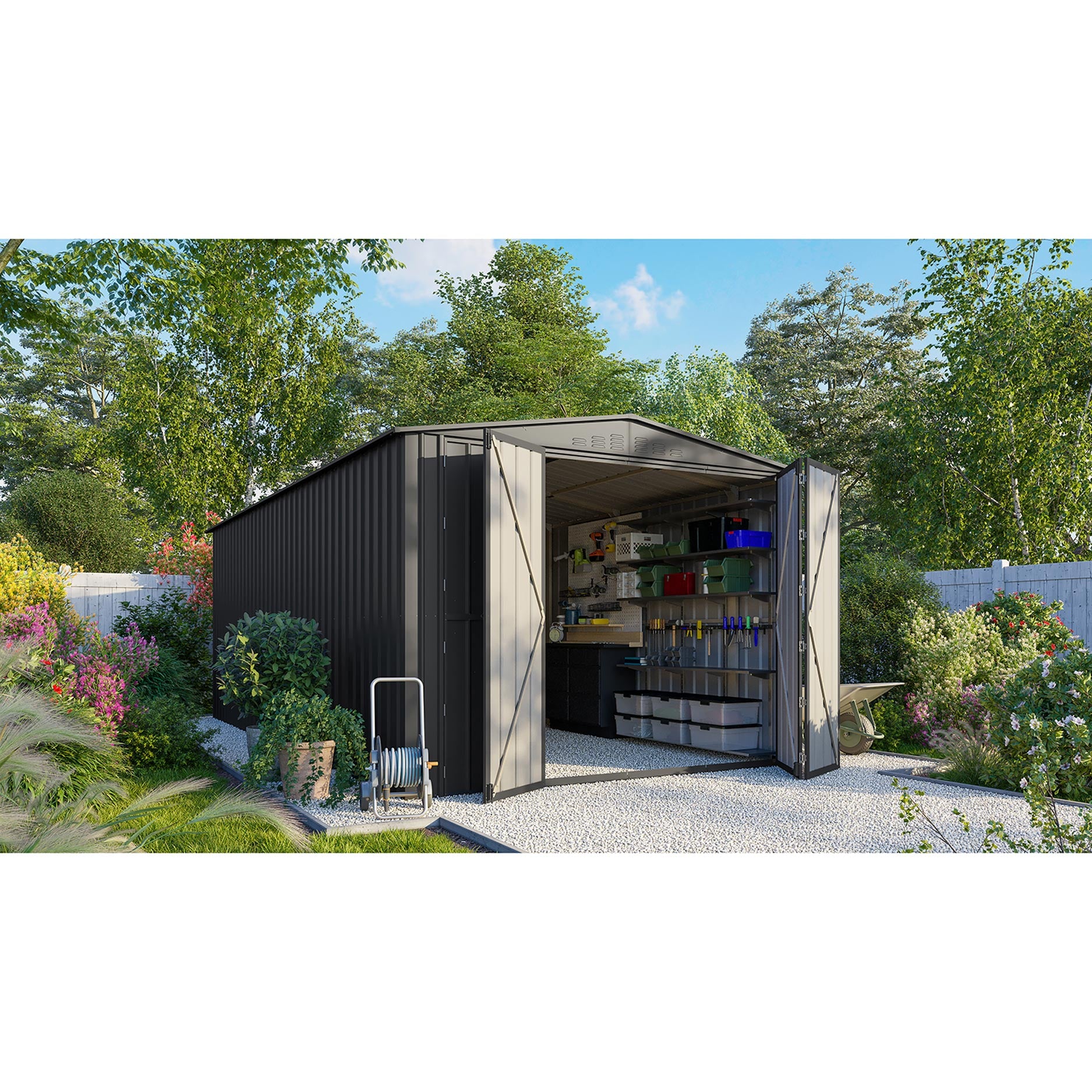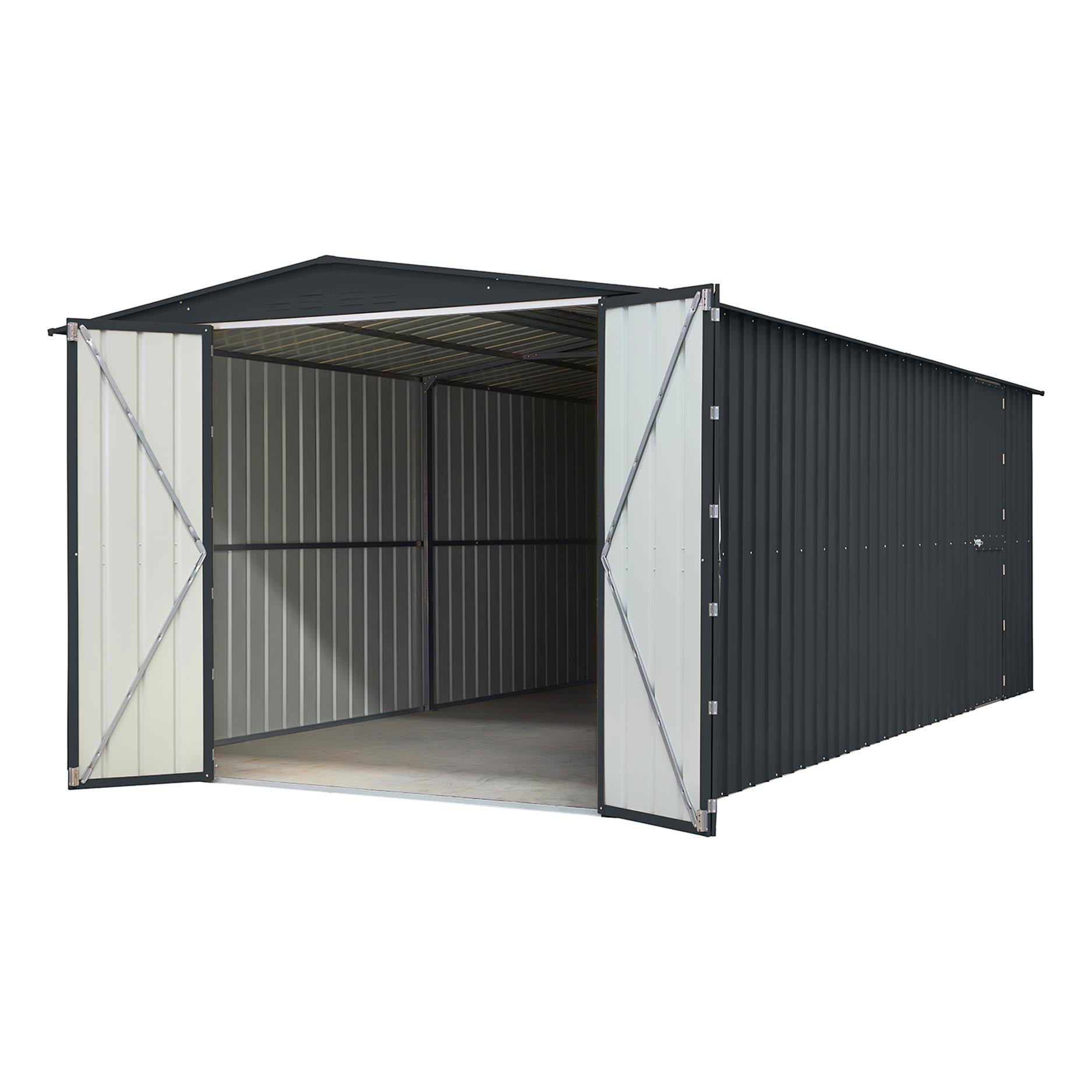 Parker – en riktig allroundmodell. Med de dubbla slagdörrarna får du gott om utrymme att komma in i din verkstad. Strikt taget är den inte avsedd för bilar, men det går! Tack vare de dubbla slagdörrarna som du kan öppna ännu mer. Och även om du bara vill hämta verktyg, är den extra gångdörren till hjälp. Men det är inte allt; med en standard golvyta på ca 13,39m2 saknar du inget. Parker har en nockhöjd på 225cm, sidoväggarna är 201cm. Skapa med utbyggnadsmodulen ytterligare 3,7m2 golvyta för ännu mer plats.
