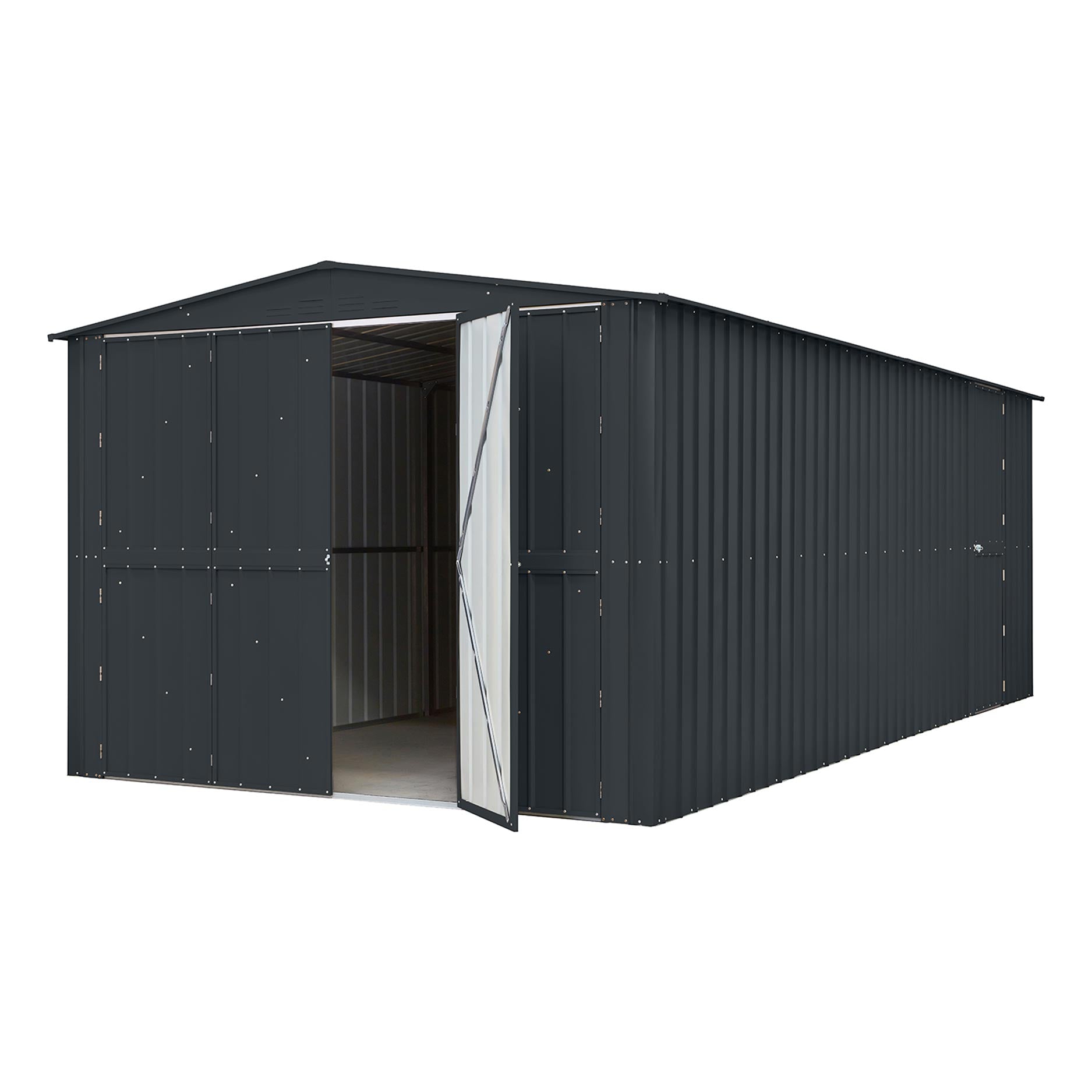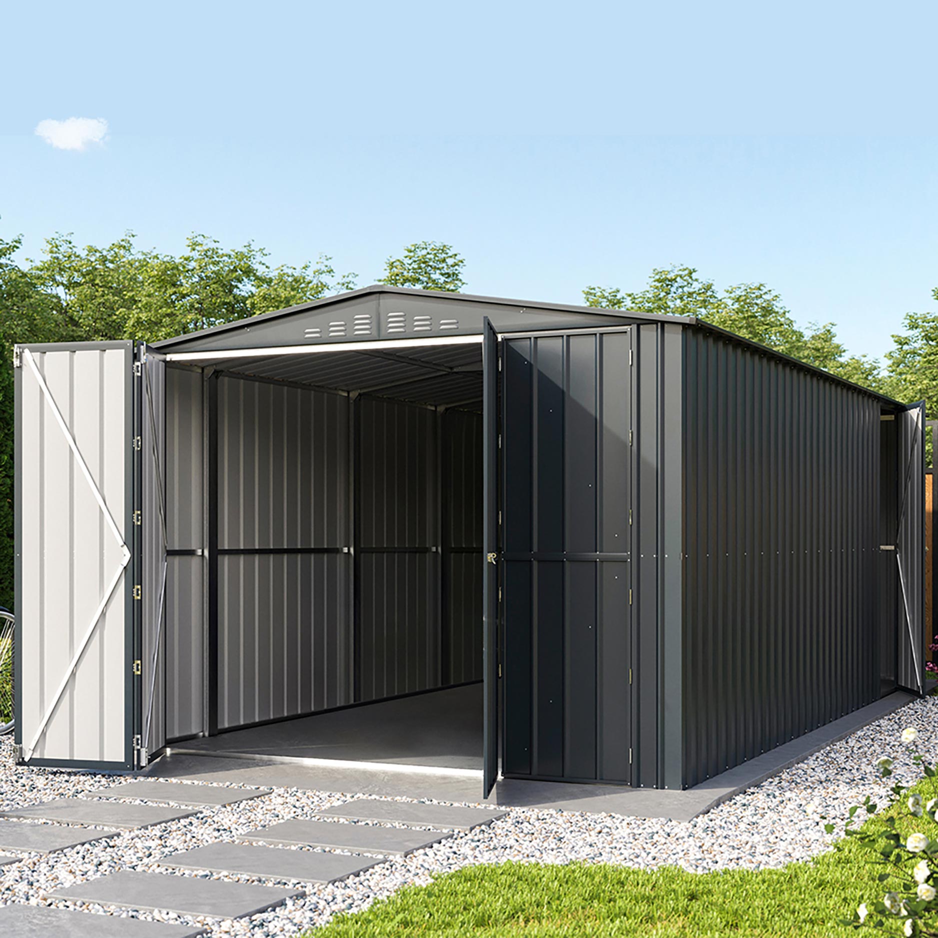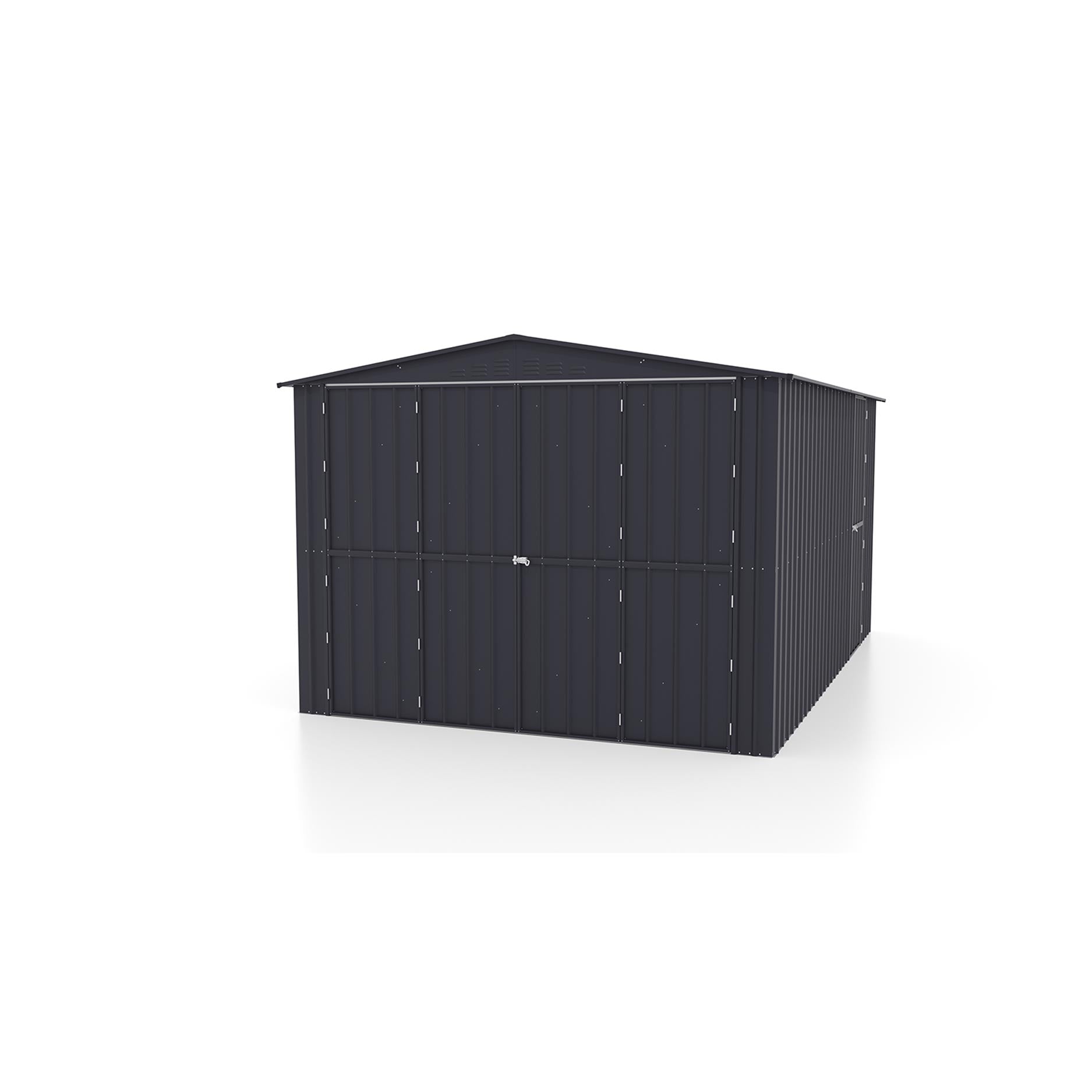 Parker – en riktig allroundmodell. Med de dubbla slagdörrarna får du gott om utrymme att komma in i din verkstad. Strikt taget är den inte avsedd för bilar, men det går! Tack vare de dubbla slagdörrarna som du kan öppna ännu mer. Och även om du bara vill hämta verktyg, är den extra gångdörren till hjälp. Men det är inte allt; med en standard golvyta på ca 13,39m2 saknar du inget. Parker har en nockhöjd på 225cm, sidoväggarna är 201cm. Skapa med utbyggnadsmodulen ytterligare 3,7m2 golvyta för ännu mer plats.