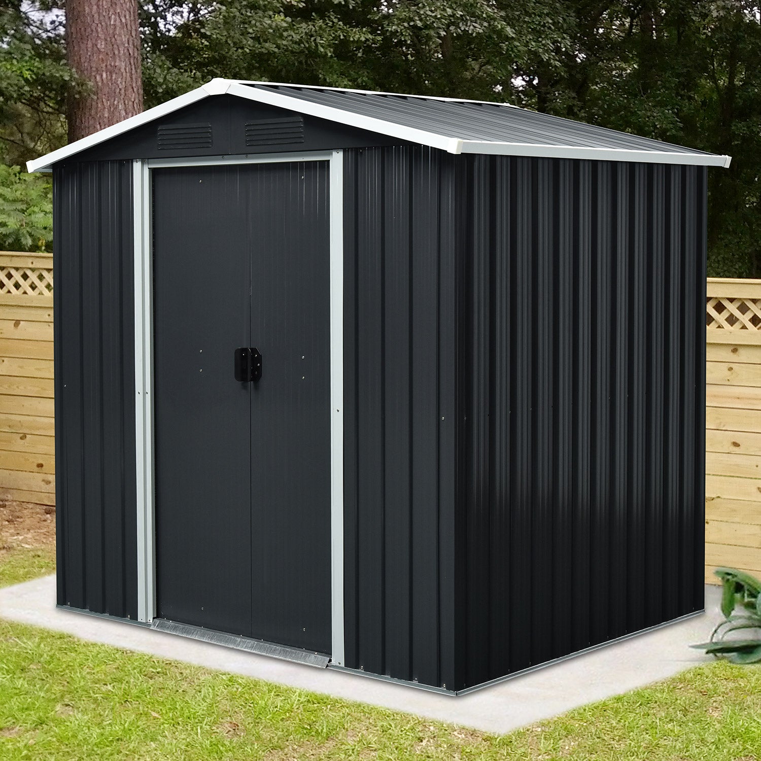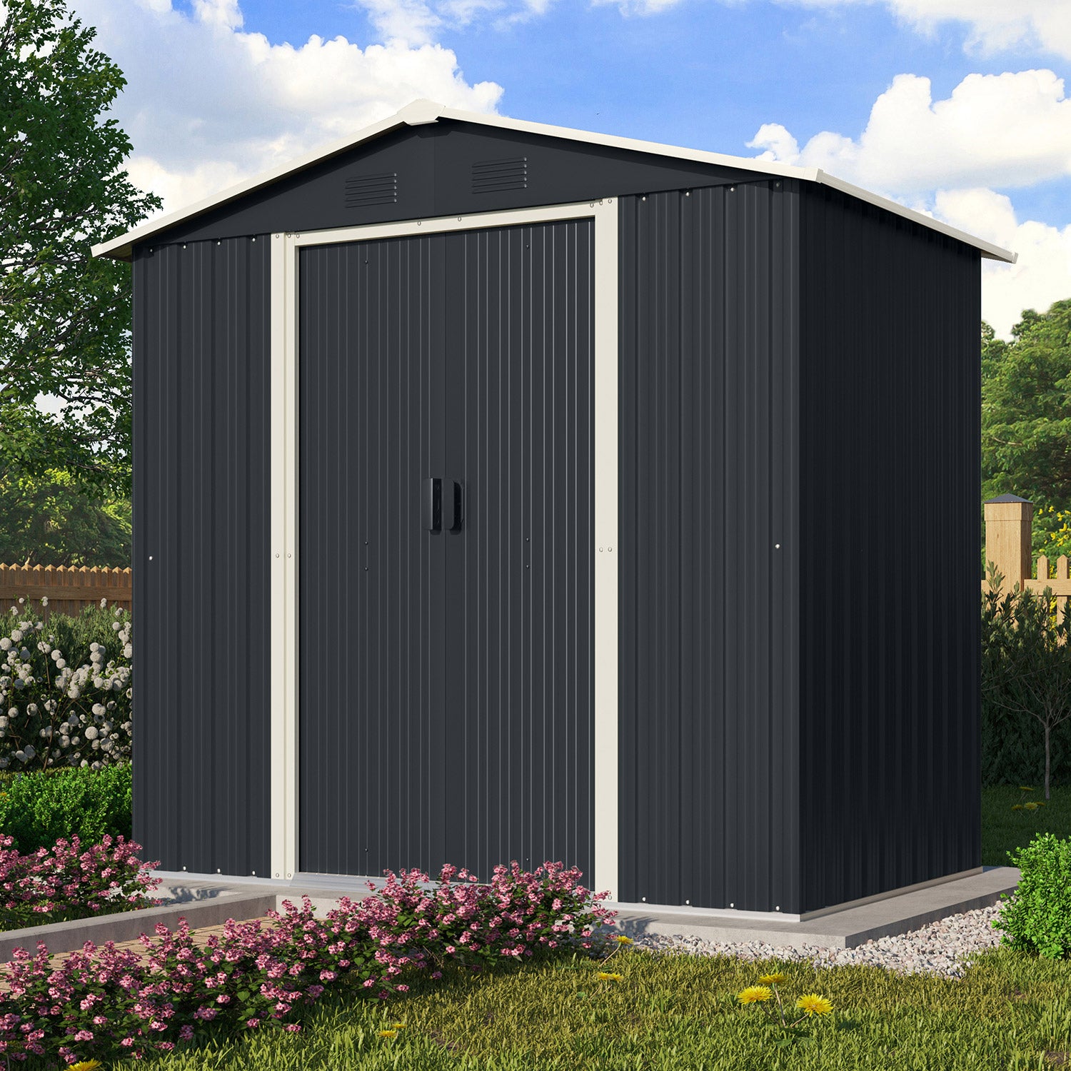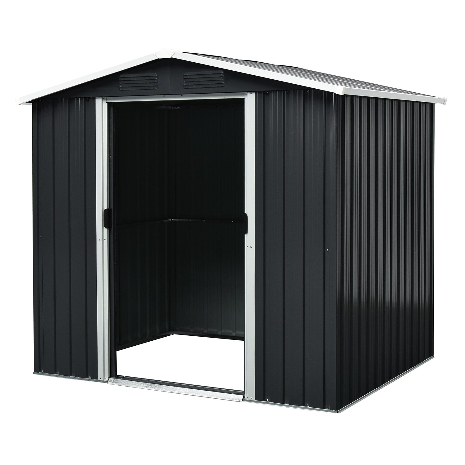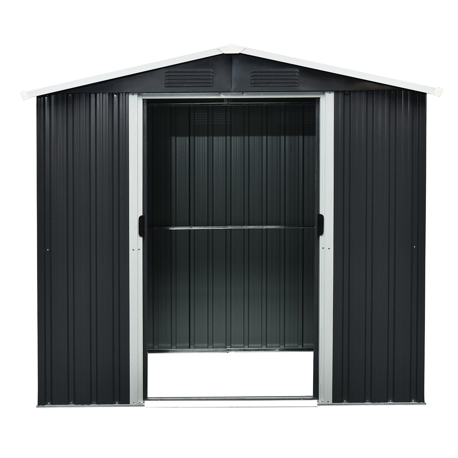 Düsseldorf II 65 är ett verkligt allround-trädgårdsförråd. Med en yta på 2,19m2 kan du enkelt förvara alla dina trädgårdsredskap, men också till exempel ställa in en arbetsbänk eller en hyllenhet. Detta metallförråd levereras i en stilren antracitgrå utförande med vita accenter. Alla ytterdelar är av galvaniserat stål och ger ett utmärkt skydd mot väder och vind. Med 2 kompakta skjutdörrar, med en (sammanlagd) bredd på 82cm, kommer du utan besvär åt alla dina trädgårdsredskap.