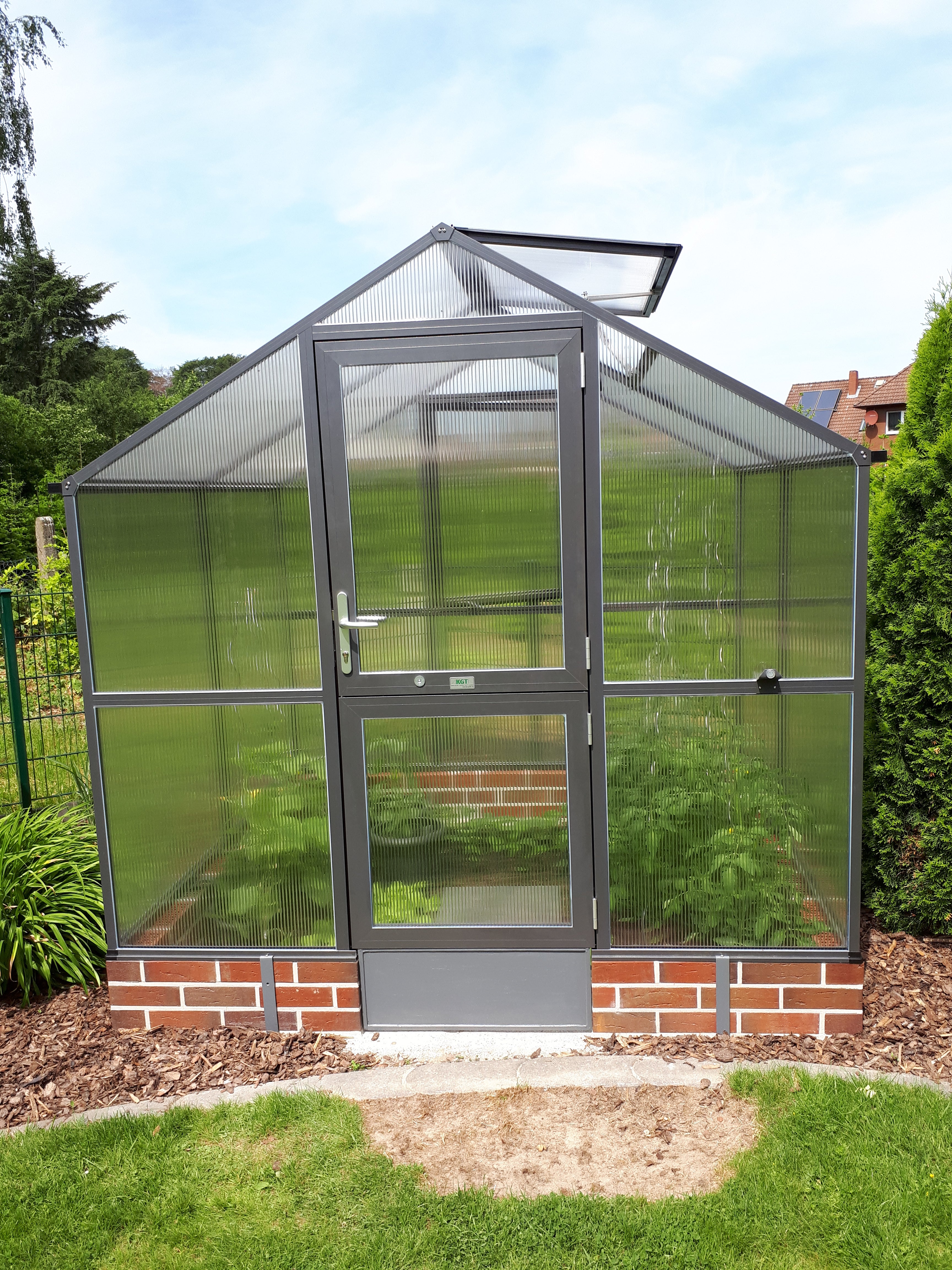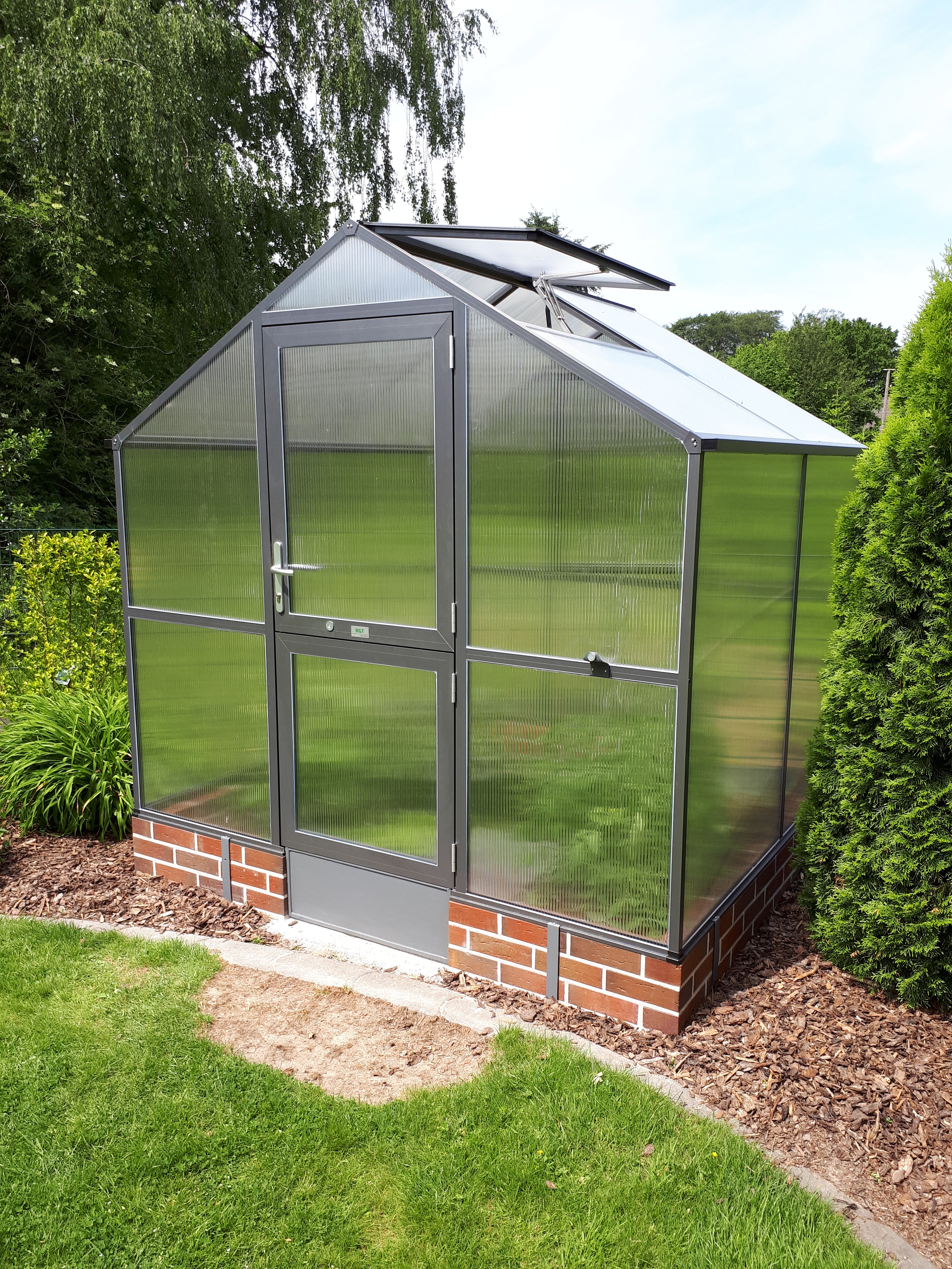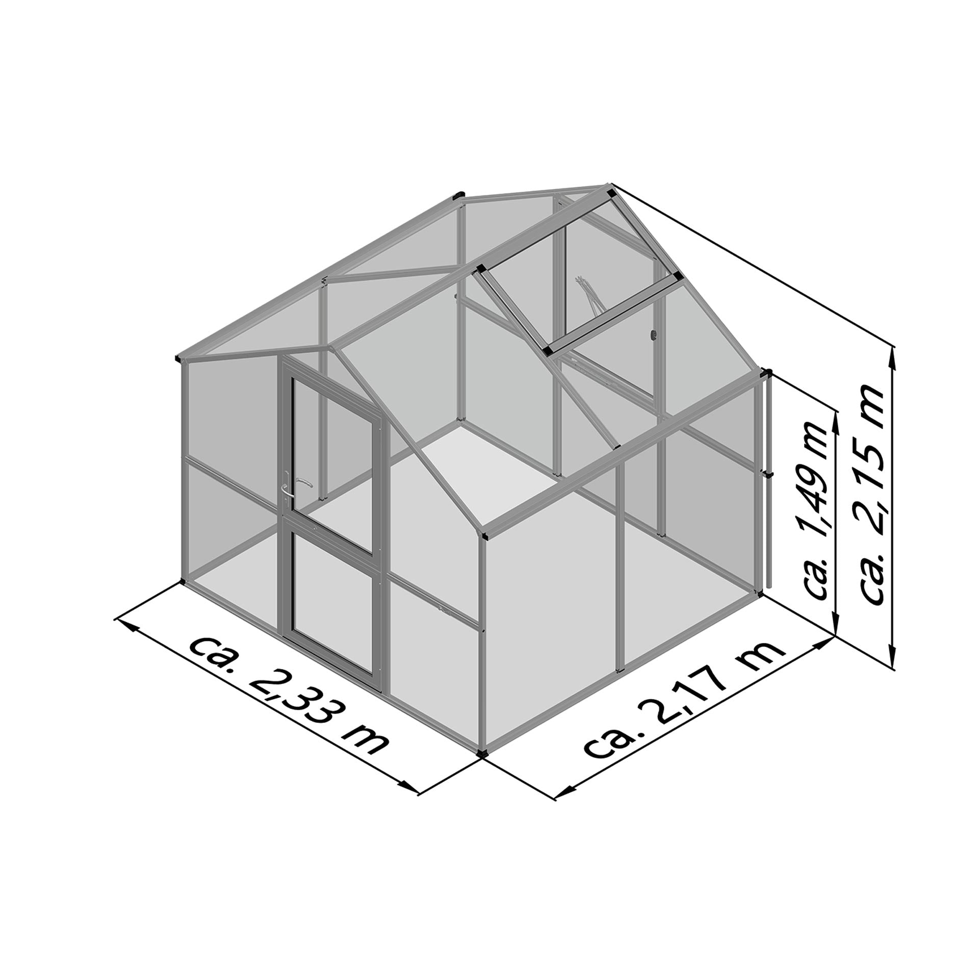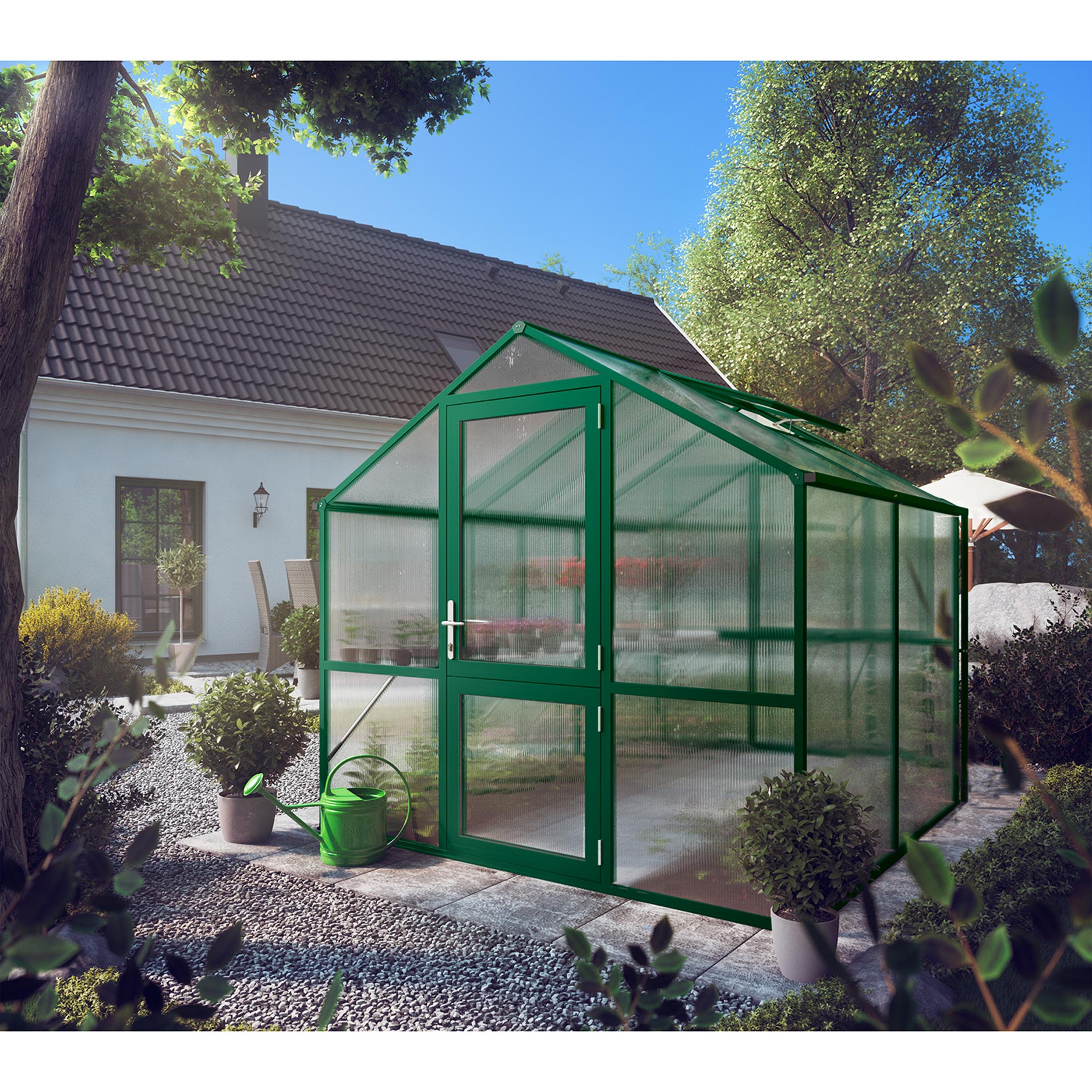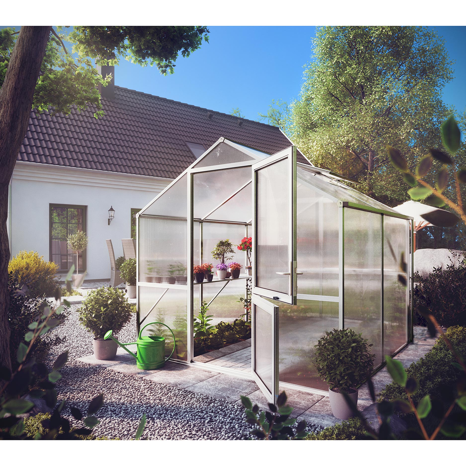 Aluminiumkonstruktionen är robust och underhållsfri, utformad för många års intensiv användning. Inglasningen består av 10mm kanalplattor, som ger en utmärkt balans mellan ljusinsläpp, värmebevarande och styrka. Det gör Rose II lämplig för att driva upp unga plantor, odla tomater eller chili, eller skydda känsliga grödor på hösten. Svängdörren och takfönstret ger en behaglig luftcirkulation, medan hängrännor leder bort vattnet effektivt. Med den valfria grundramen står växthuset perfekt stabilt och i våg.