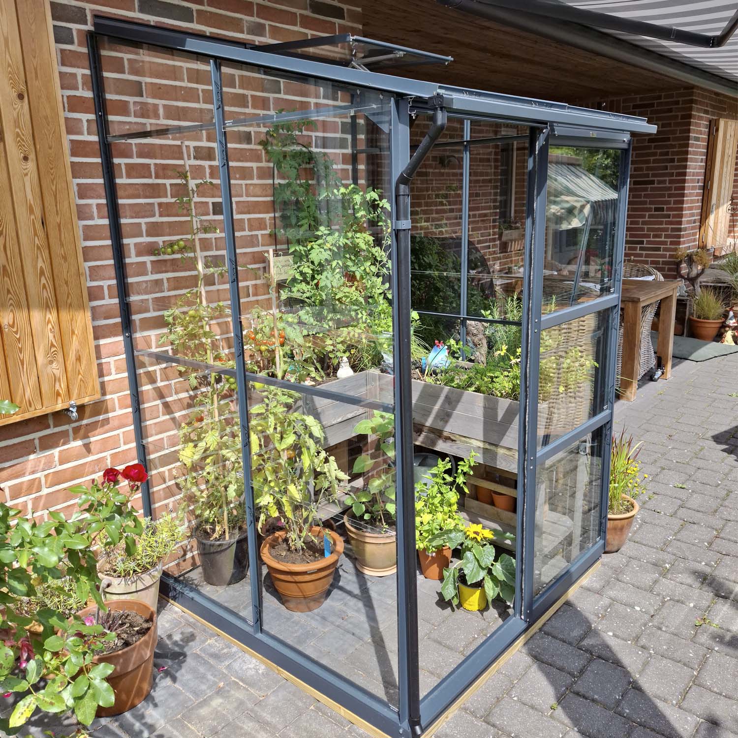 Aluminiumkonstruktionen med säkerhetsglas är hållbar och underhållsfri. Skjutdörren löper smidigt och takfönstret ger frisk luft. Grundramen och regnvattenavledningen ingår, så att växthuset är klart att använda direkt. Praktiskt, hållbart och fint i varje trädgård.