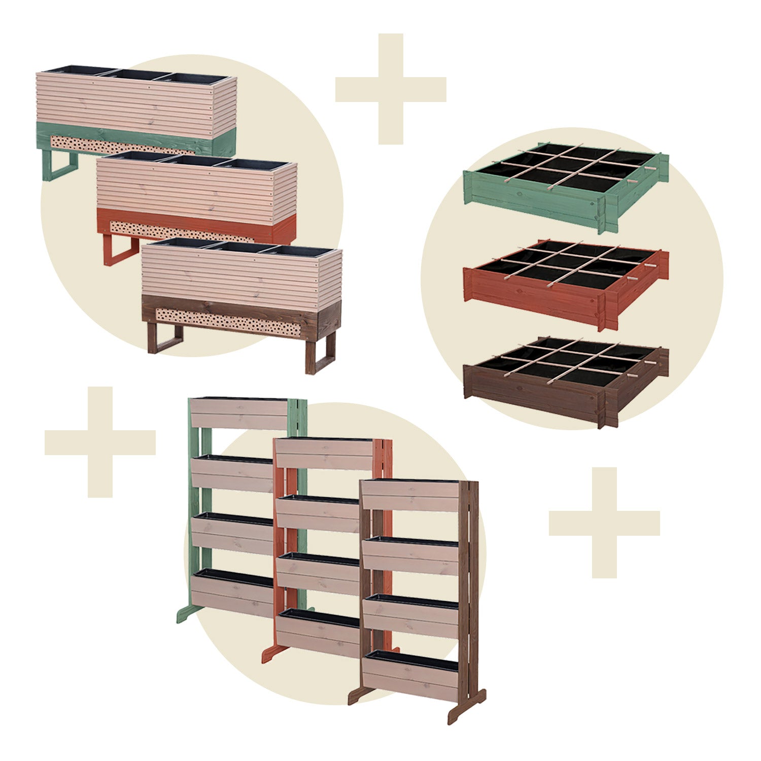 Mix & Match din egen Köksträdgård. Perfekt för dig som precis har börjat odla. Med det här setet odlar du en stor variation av grödor. I odlingsbordet får 3 stora växter plats, den vertikala odlingslådan är idealisk för flera kryddörter eller jordgubbar. Den kvadratiska Köksträdgård-lådan på en kvadratmeter kan du dela upp i 9 fack. Tillsammans blir detta en komplett Köksträdgård som du kan använda på många olika sätt.