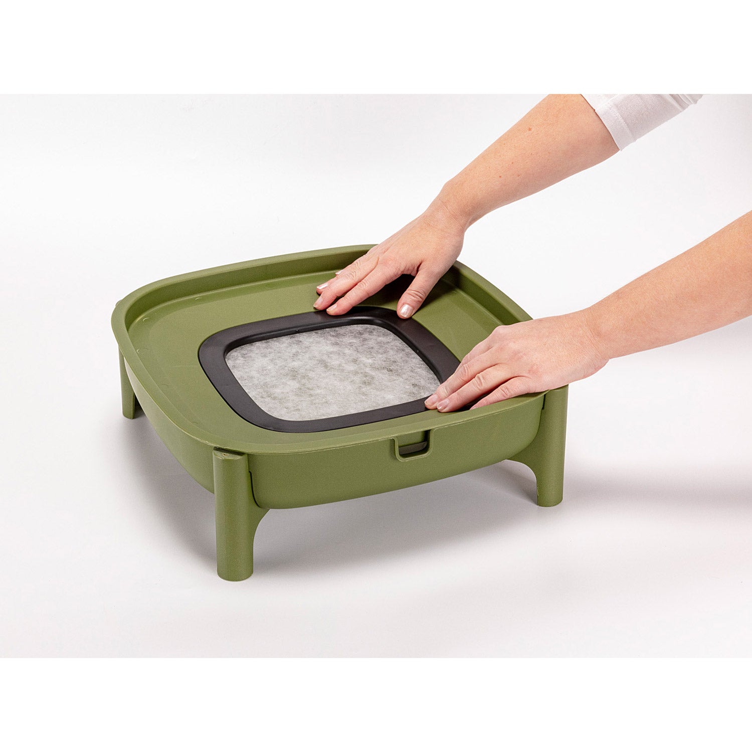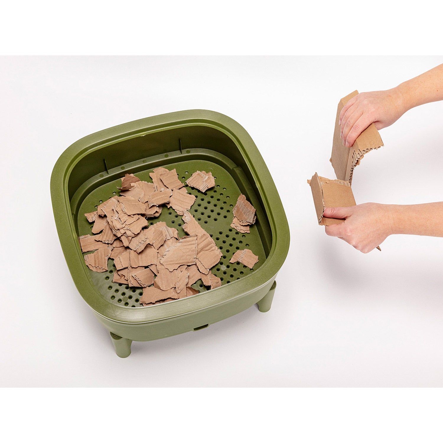 För att använda den börjar du med att lägga strömaterial (t.ex. en bit kartong, strimlat papper, lite jord) i behållaren, därefter tillsätter du kompostmaskar.