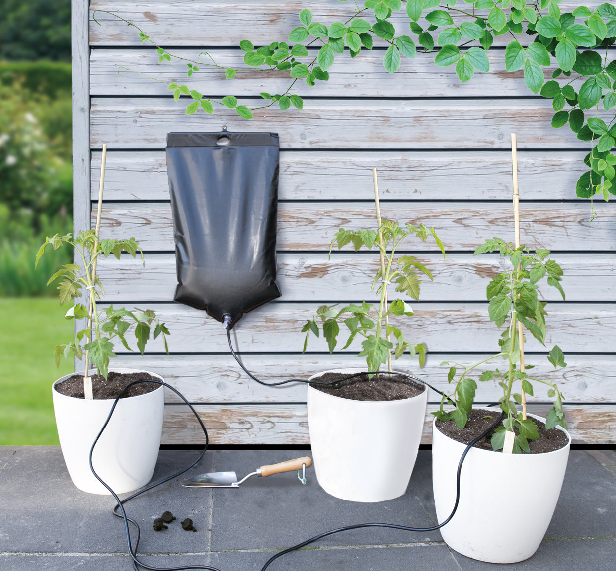 I användning är systemet enkelt: fyll vattenbehållaren och häng upp den något högre med den medföljande S-kroken. Lägg droppslangen längs växterna och placera droppmunstyckena på önskade platser. Med de justerbara droppmunstyckena bestämmer du hur mycket vatten som ges till varje växt. På så sätt hålls plantor och växter väl hydrerade under varma dagar eller när du är borta några dagar. Systemet är flexibelt att ställa upp och enkelt att anpassa till krukor, lådor eller odlingsbäddar.