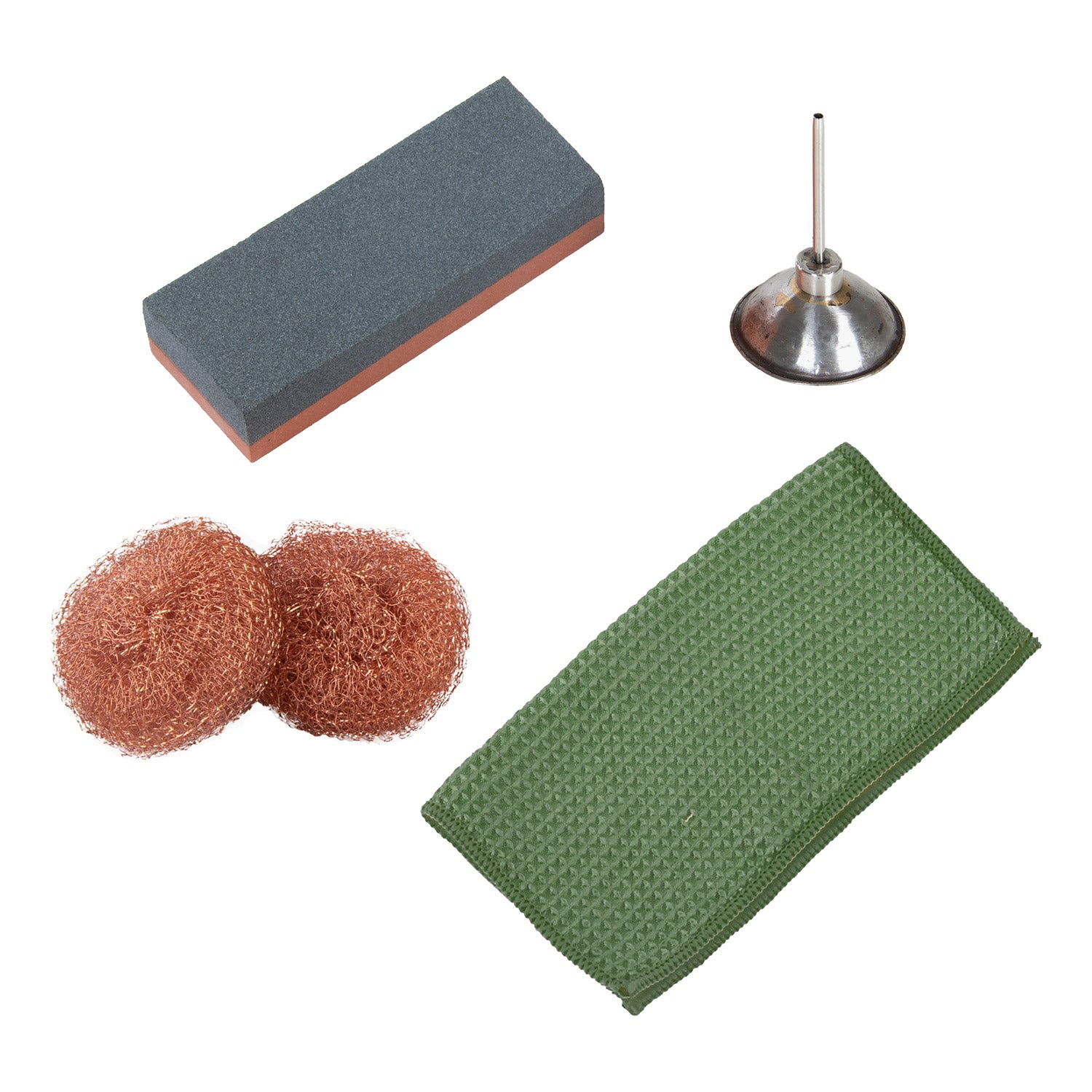 Få trädgårdsredskap att hålla längre genom att underhålla dem med detta set. Setet består av en slipsten, kopparull, en oljekanna och en duk.
