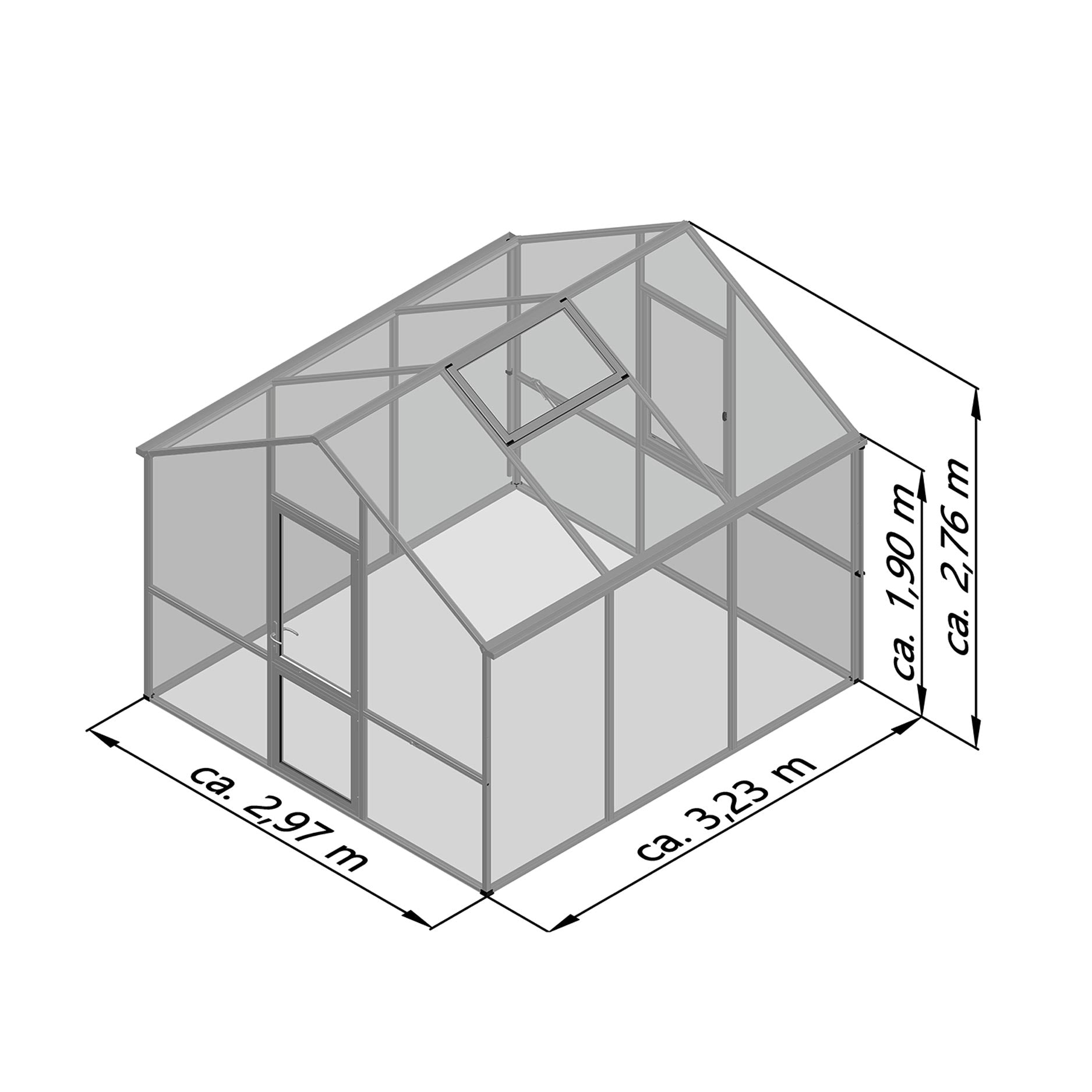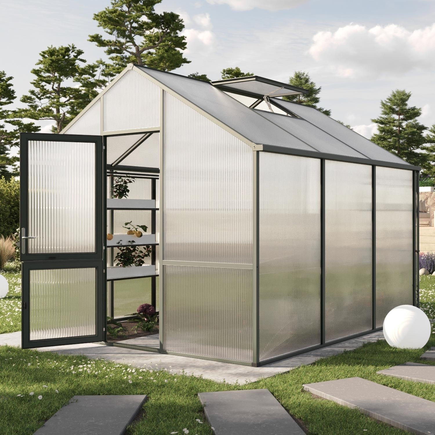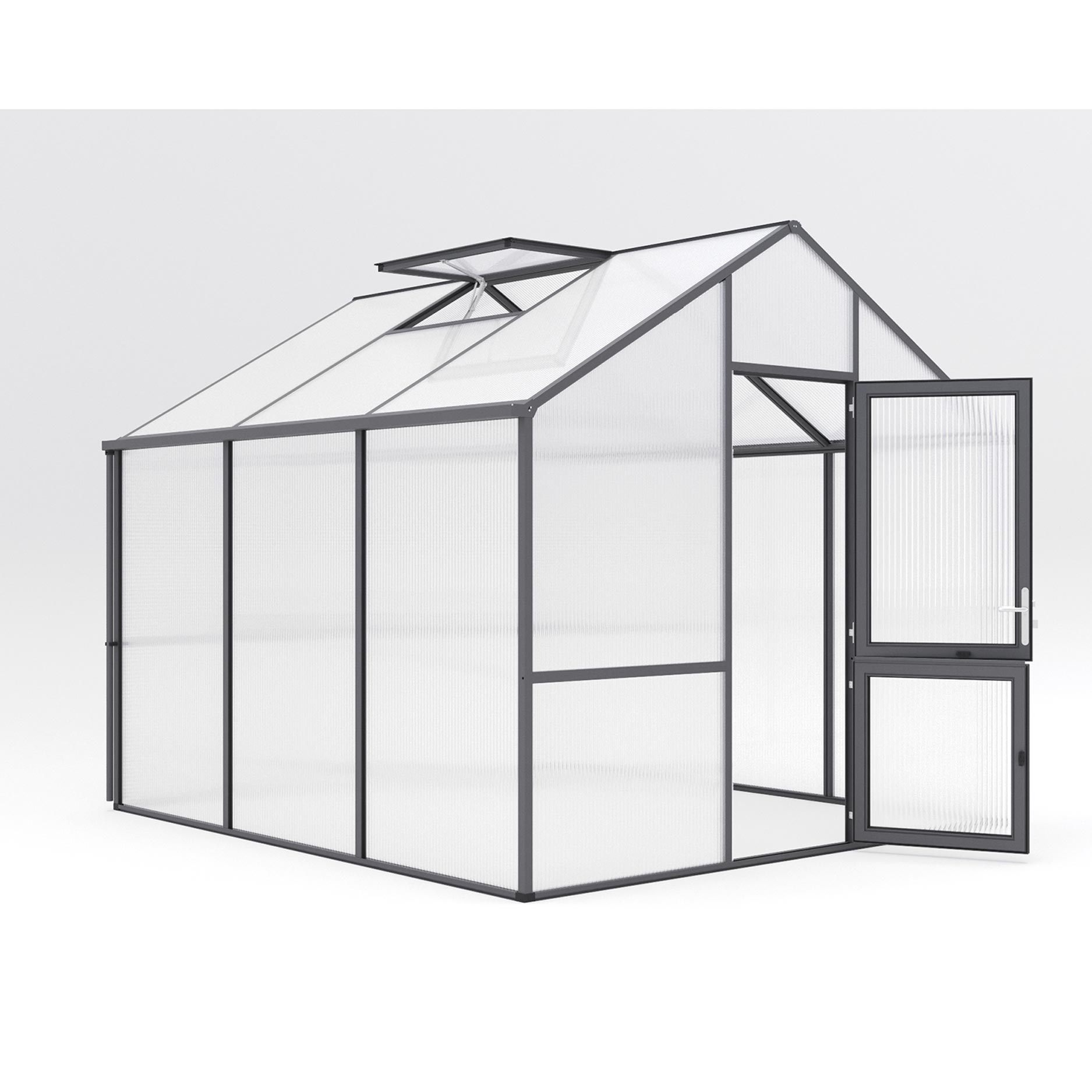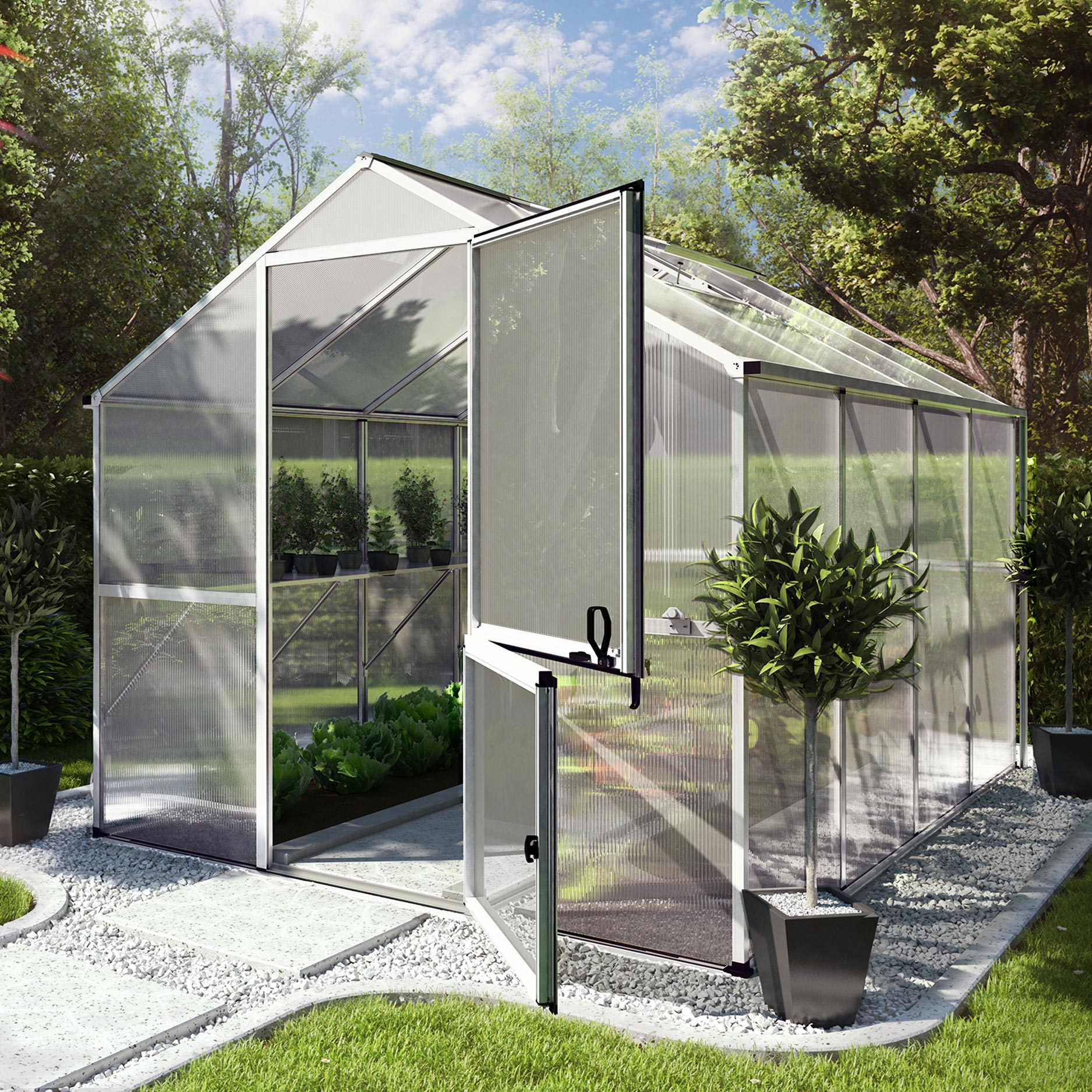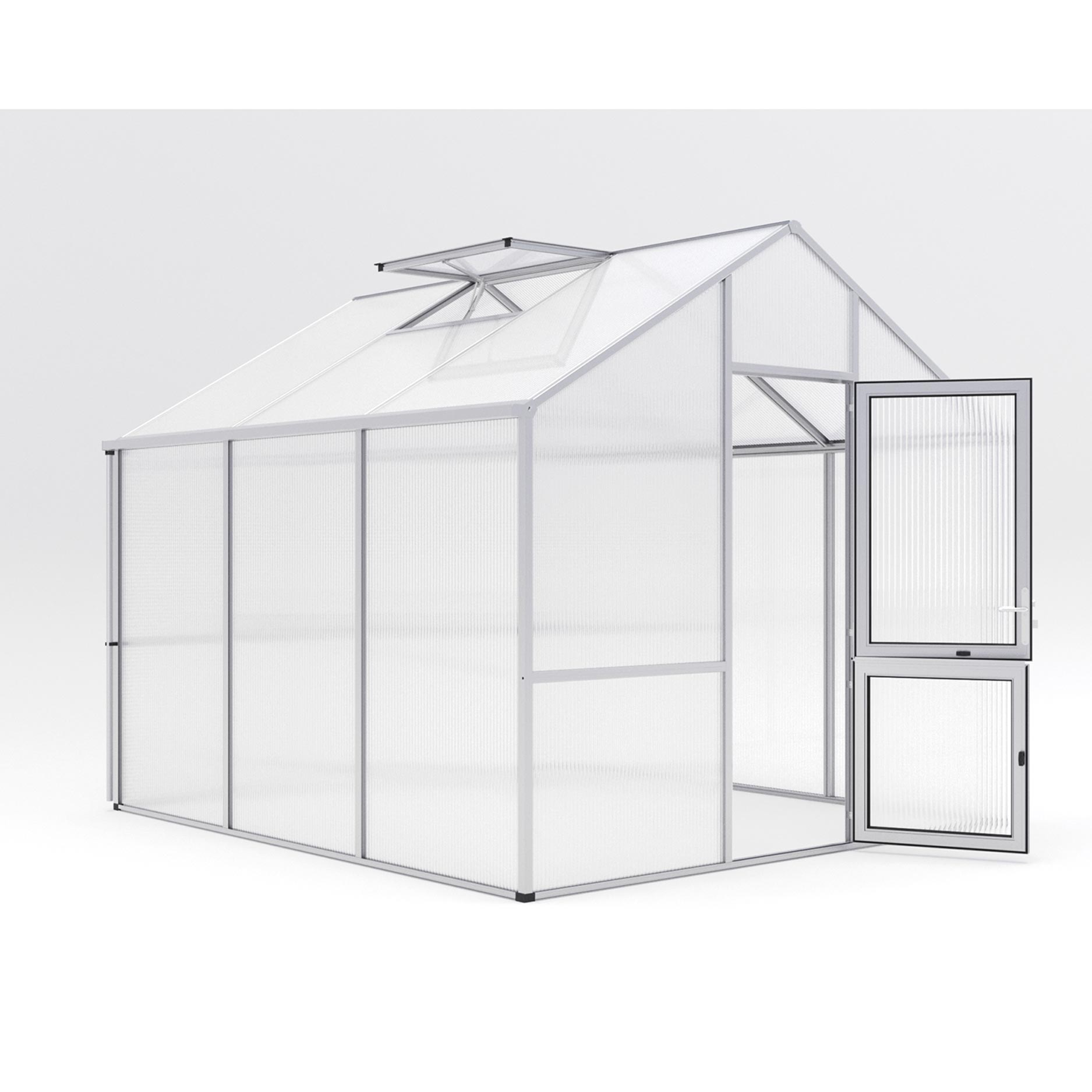 Konstruktionen är tillverkad av hållbar aluminium med 16mm kanalplastskivor som ger maximal isolering och optimal ljusfördelning. Skivorna är UV-skyddade, vilket gör att de förblir klara och att växterna skyddas mot överdriven sol. Växthuset är utrustat med en bred svängdörr, ett automatiskt takfönster, ett manuellt bakfönster och dubbla regnrännor för effektiv avrinning. Med den valfria grundramen står växthuset stadigt och i våg, även på mindre jämnt underlag.