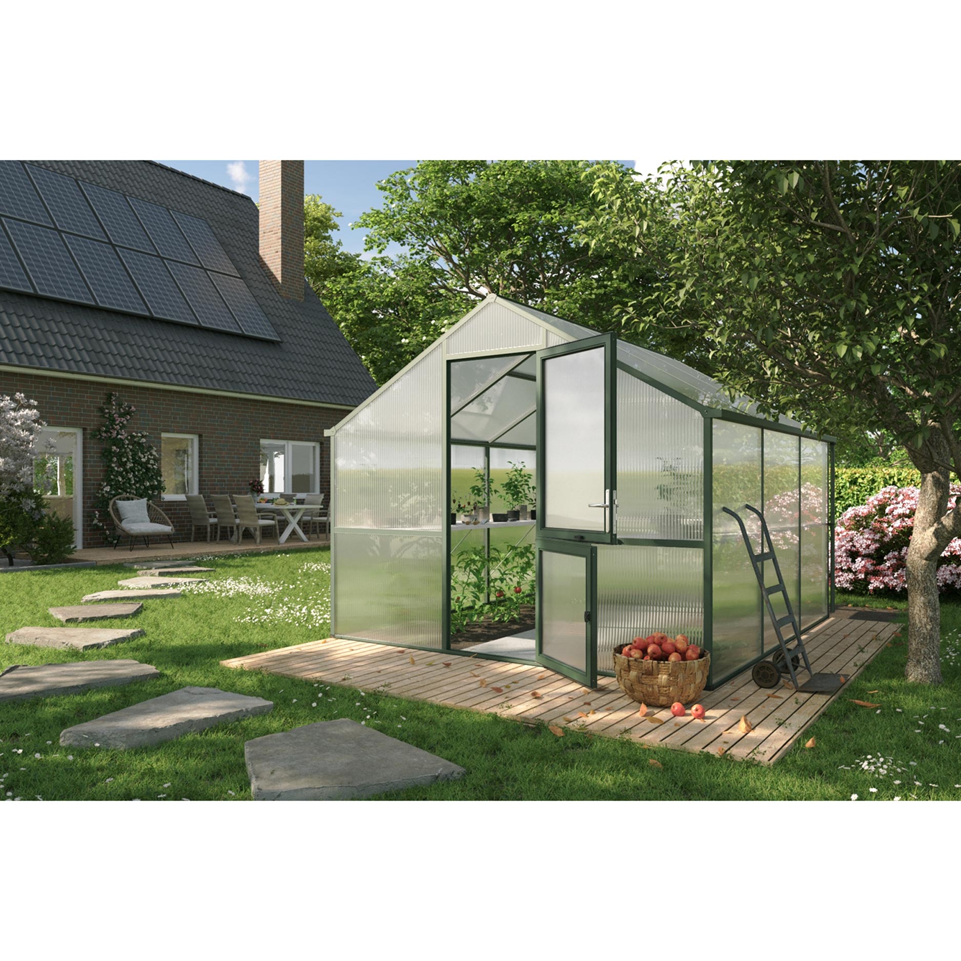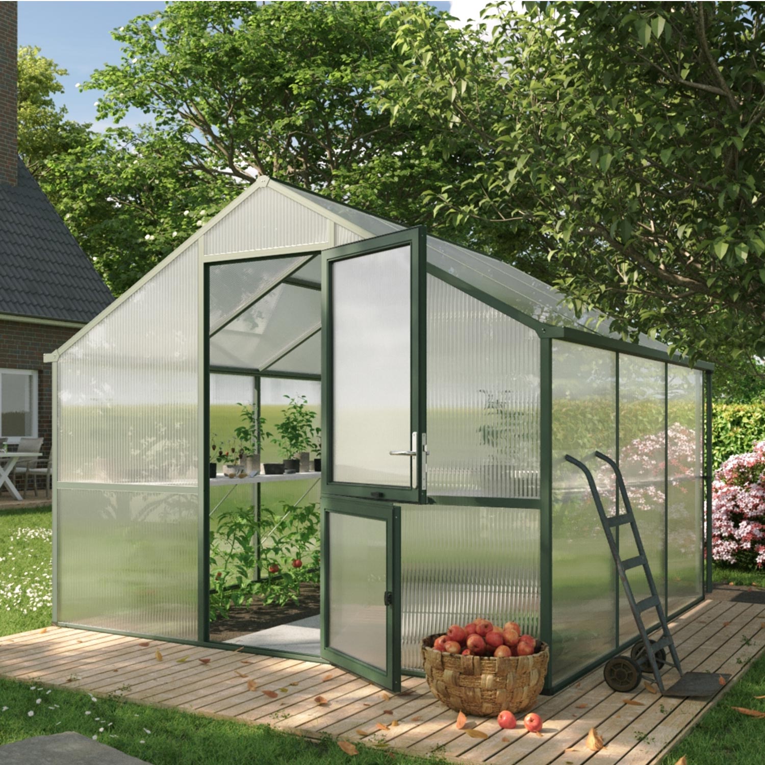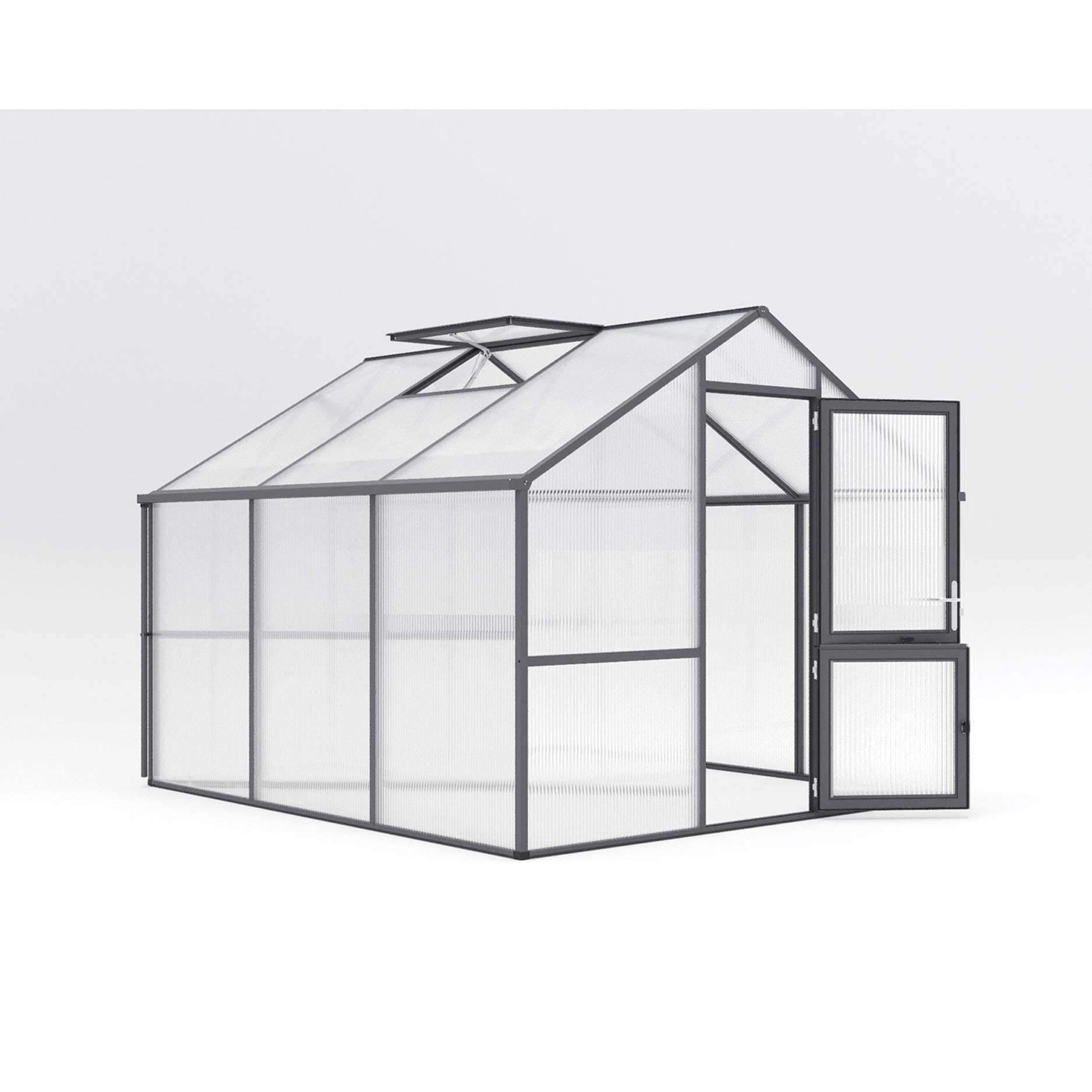 Konstruktionen består av en stark aluminiumgrund med 16mm kanalplast som isolerar exceptionellt bra och sprider ljuset jämnt. Detta begränsar temperatursvängningar och förebygger att grödor bränns. Nelke III är utrustad med en bred slagdörr, ett automatiskt takfönster och ett manuellt bakre fönster för naturlig ventilation. Integrerade regnrännor leder bort vatten effektivt eller kan kopplas till ett uppsamlingssystem. Med den valfria grundramen står växthuset stabilt och i våg, även vid hård vind.