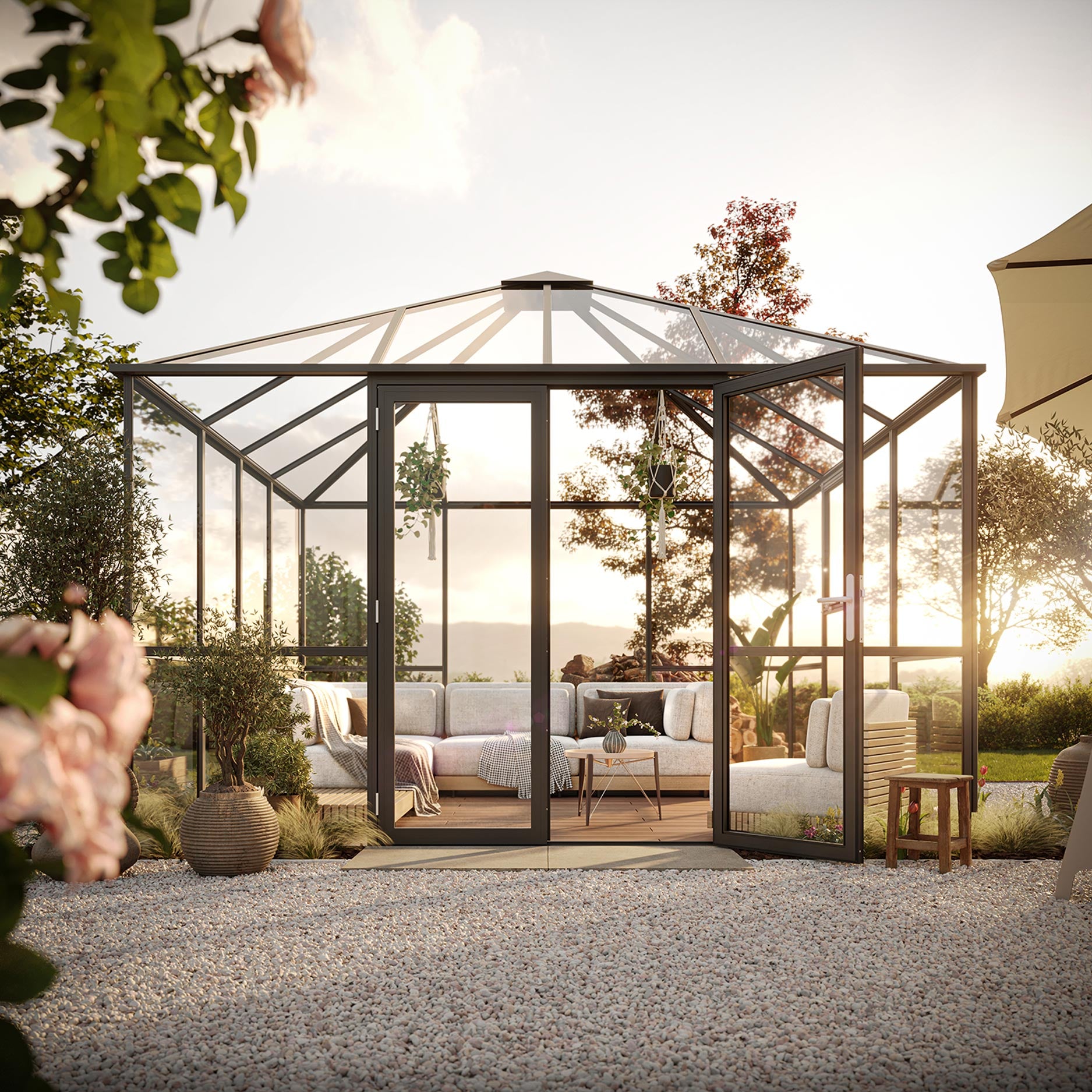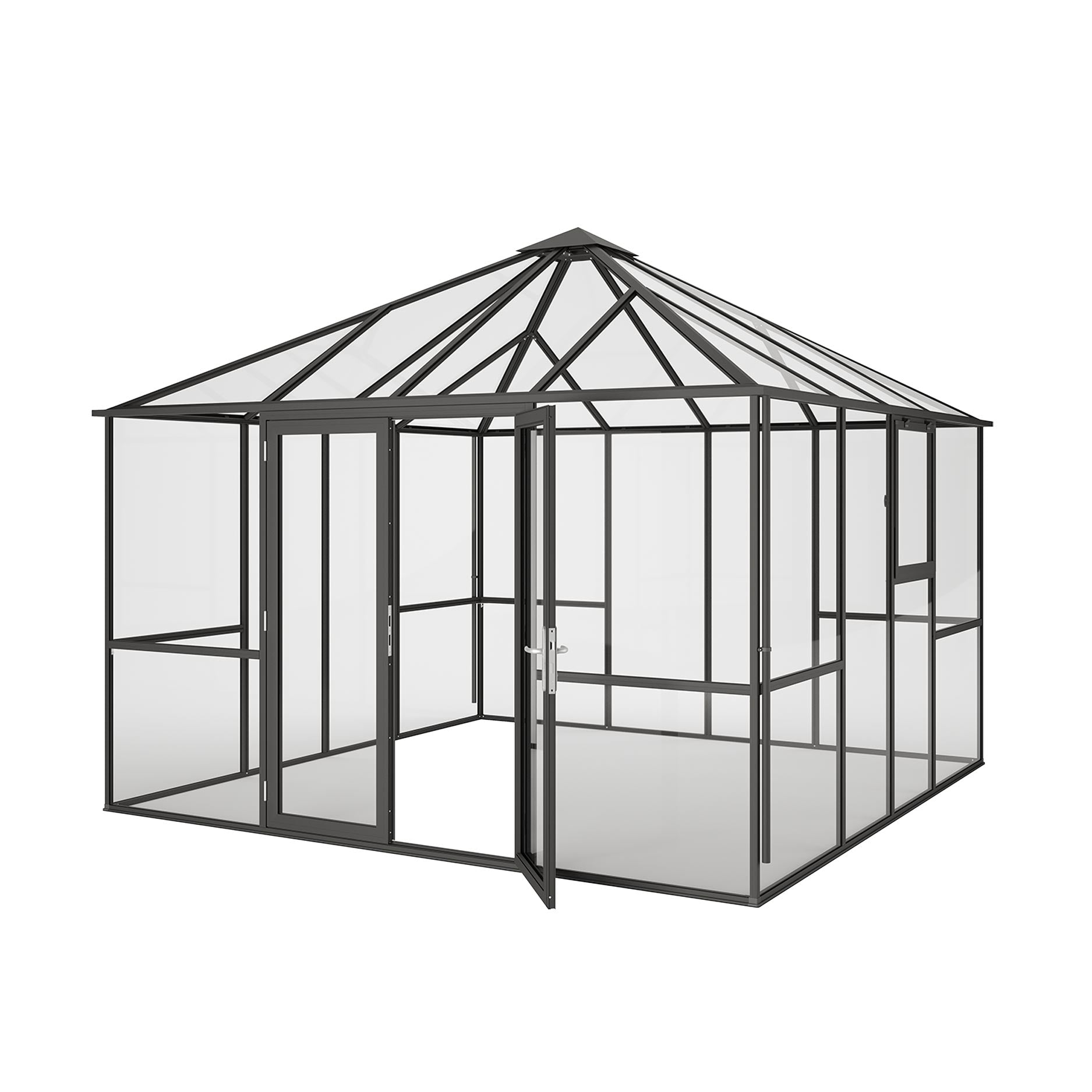 Konstruktionen är tillverkad av pulverlackerad aluminium i antracitgrått och kan utföras med 4mm säkerhetsglas eller 10mm kanalplast i taket. Glasväggarna ger maximalt ljusinsläpp, medan taket reglerar värmen och ger skydd mot väderpåverkan. Per sida kan man välja dubbeldörrar eller sidofönster, beroende på önskad planlösning. PaviLux II kombinerar komfort, hållbarhet och elegans – ett idealiskt val för dig som vill uppleva ditt växthus som en del av utelivet.