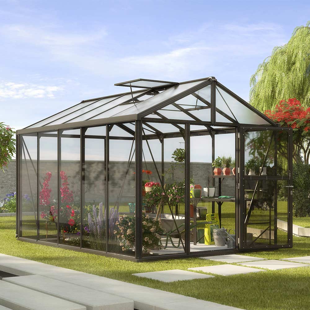 Vitavia Zeus 10000 är växthuset för dig som vill odla seriöst i en större hemmamiljö. Det passar i trädgårdar där det finns utrymme för ambition: rader av tomater, stapelhyllor med örter eller en arbetsbänk för sticklingar. Med 10m² golvyta och en nockhöjd på 2,50m får du en öppen, rymlig odlingsyta där du också kan röra dig upprätt. Designen utmärker sig med sina rejäla mått, professionella utseende och valfriheten i fråga om glasning och stomkonstruktion.