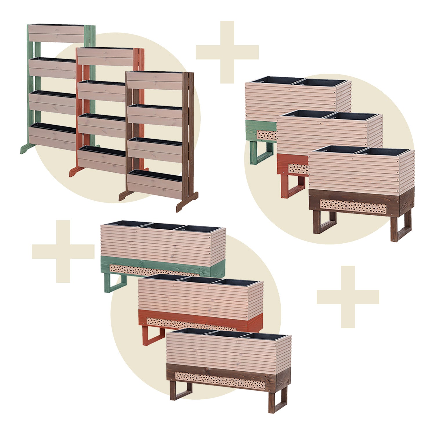 Mix & Match din balkongköksträdgård. Perfekt för balkong eller terrass. Ytan för den här uppsättningen är mindre än en kvadratmeter (0,76m²), men erbjuder möjligheten att odla 5 stora växter och många kryddor. De 2 köksträdgårdslådorna har dessutom båda ett inbyggt insektshotell. Då kan det kanske bli ganska livligt på din balkong eller terrass.