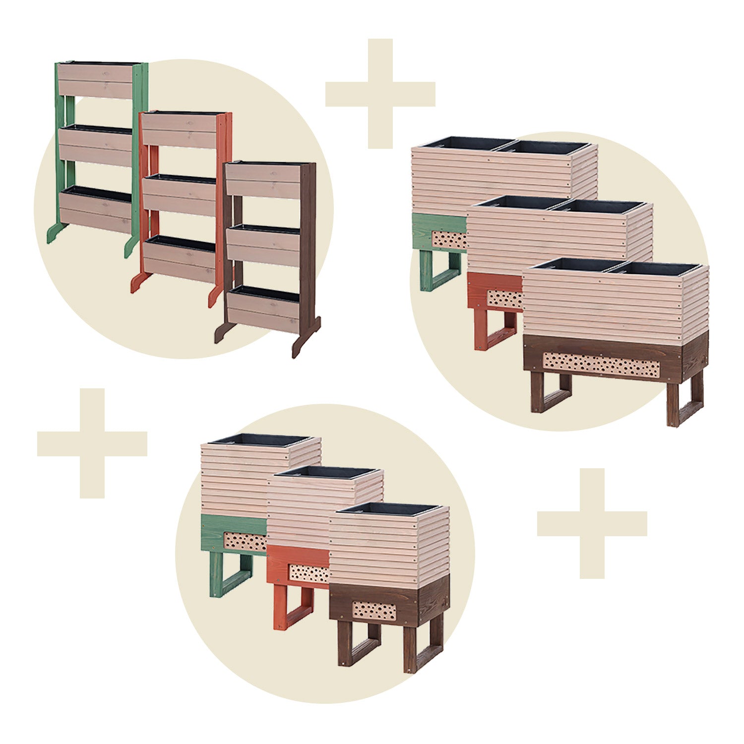 Mix & Match din mini-köksträdgård. Perfekt för en liten balkong eller terrass. Den här uppsättningen tar bara en halv kvadratmeter (0,48m²) i anspråk, men ger möjlighet att odla 3 stora växter och flera kryddor. De 2 köksträdgårdsodlingslådorna har dessutom båda ett inbyggt insektshotell. Då kan det kanske bli riktigt livligt på din balkong eller terrass.