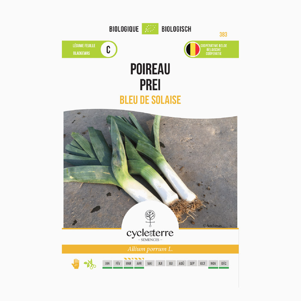 Blå purjolök från Solaise sås i mars eller april i en odlingsbädd, på 2 cm djup. Efter 6 till 14 dagar gror plantorna, som efter cirka tre månader, när stjälken har nått ungefär blyertstjocklek, gallras och planteras ut på sin slutliga växtplats med ett avstånd på 35 x 10 cm. Purjolöken odlas utomhus på friland och behöver inget växthus. Se till att jorden är väldränerad och näringsrik, och tillsätt kompost eller stallgödsel för en sund tillväxt. Tack vare sin köldtålighet kan denna purjolök stå kvar långt in på vintern.