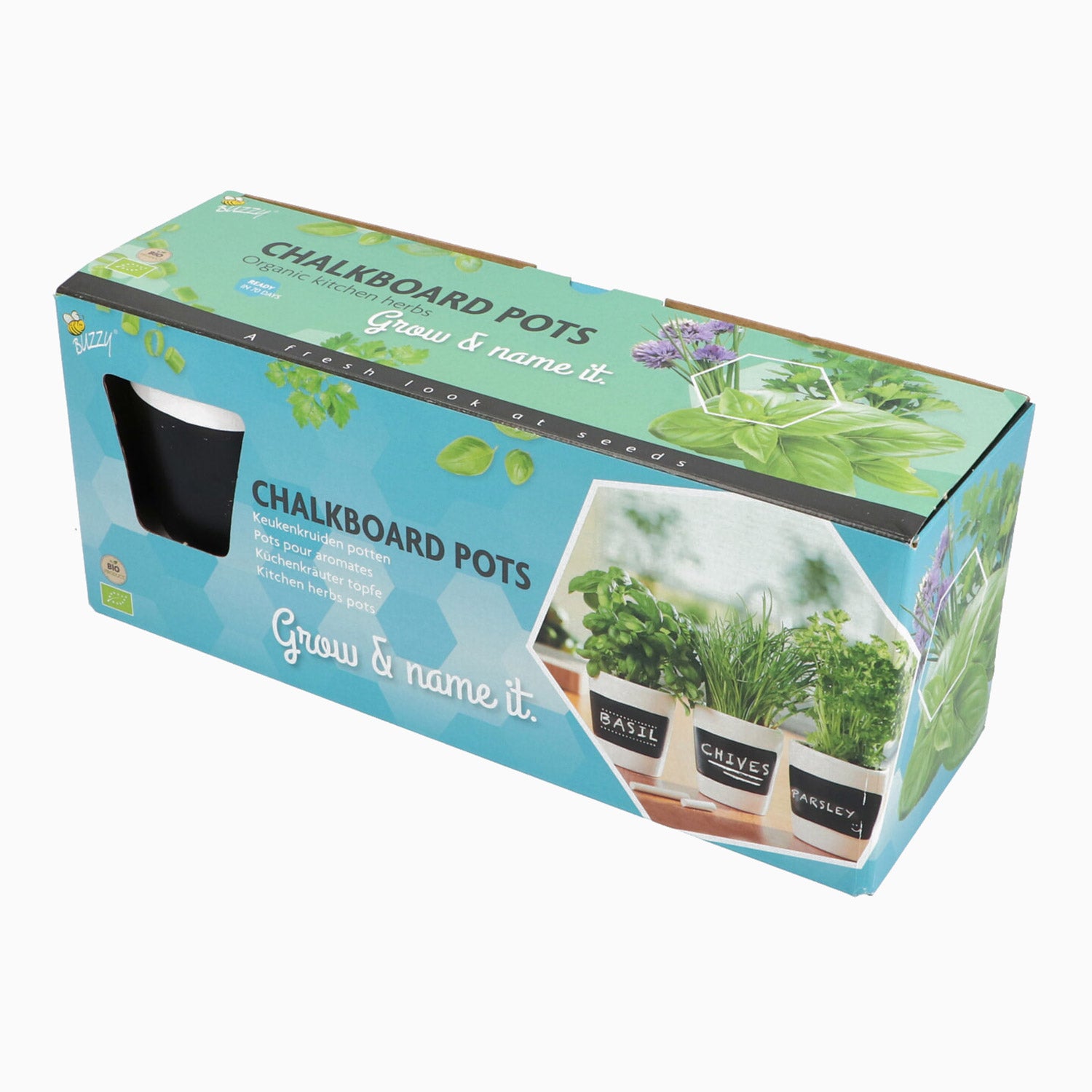 Örtset med tre vita kritkrukor och en krita. Detta dekorativa set med köksörter kommer med 3 påsar ekologiska örtsfrön av: basilika, persilja och gräslök. SKAL-certifierat. Med bifogad bruksanvisning och odlingsmedium kan ni komma igång direkt med att odla era egna färska köksörter.