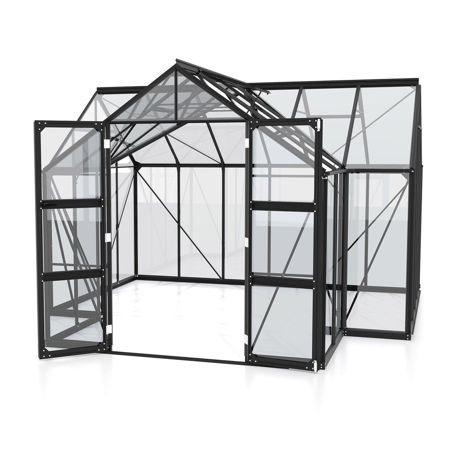 Die Aluminiumkonstruktion ist robust und wartungsarm. Die Verglasung besteht aus 3mm Sicherheitsglas (ESG), klar, lichtdurchlässig und sicher. Die Glasscheiben werden in einer stabilen Rahmenkonstruktion montiert, wobei das Glas vollständig von Aluminiumprofilen umschlossen wird. Das sorgt für hohe Windstabilität, eine saubere Verarbeitung und langfristigen Schutz der Kanten. Vier Dachfenster sorgen für natürliche Luftzirkulation, während die doppelten Flügeltüren einen breiten Zugang bieten und die Belüftung verstärken.