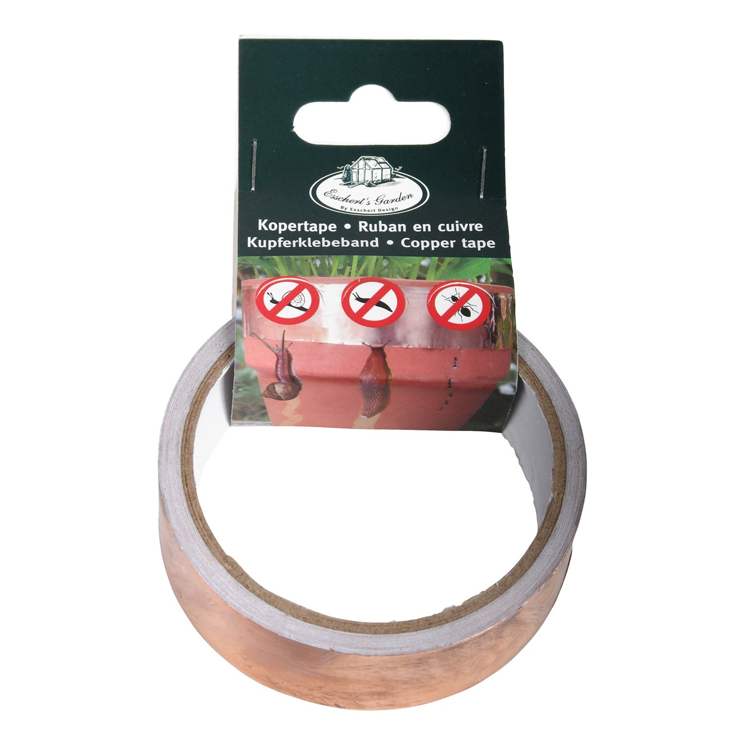 Denna självhäftande koppartejp från Esschert Design är utformad för att skydda växter i krukor, lådor eller rabatter mot sniglar och myror. Tejpen är tillverkad av högkvalitativ koppar och har en naturlig verkan: den skapar en fysisk barriär som håller oönskade besökare på avstånd utan användning av kemikalier. Med en bredd på cirka tre centimeter och en längd på fem meter passar tejpen för olika användningsområden i trädgården eller på balkongen.