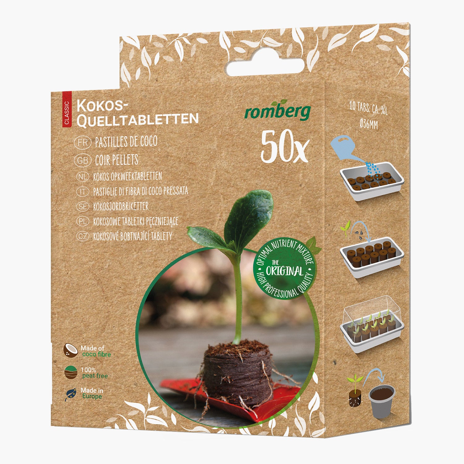 Dessa kokosbriketter för sådd och sticklingar med en diameter på 36 mm är 100 % torvfria och innehåller specialanpassad startgödsel. De levereras i förpackning om 50 st.