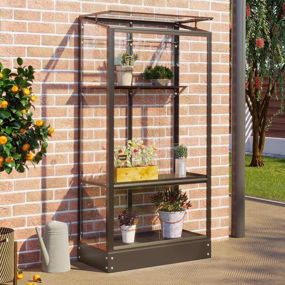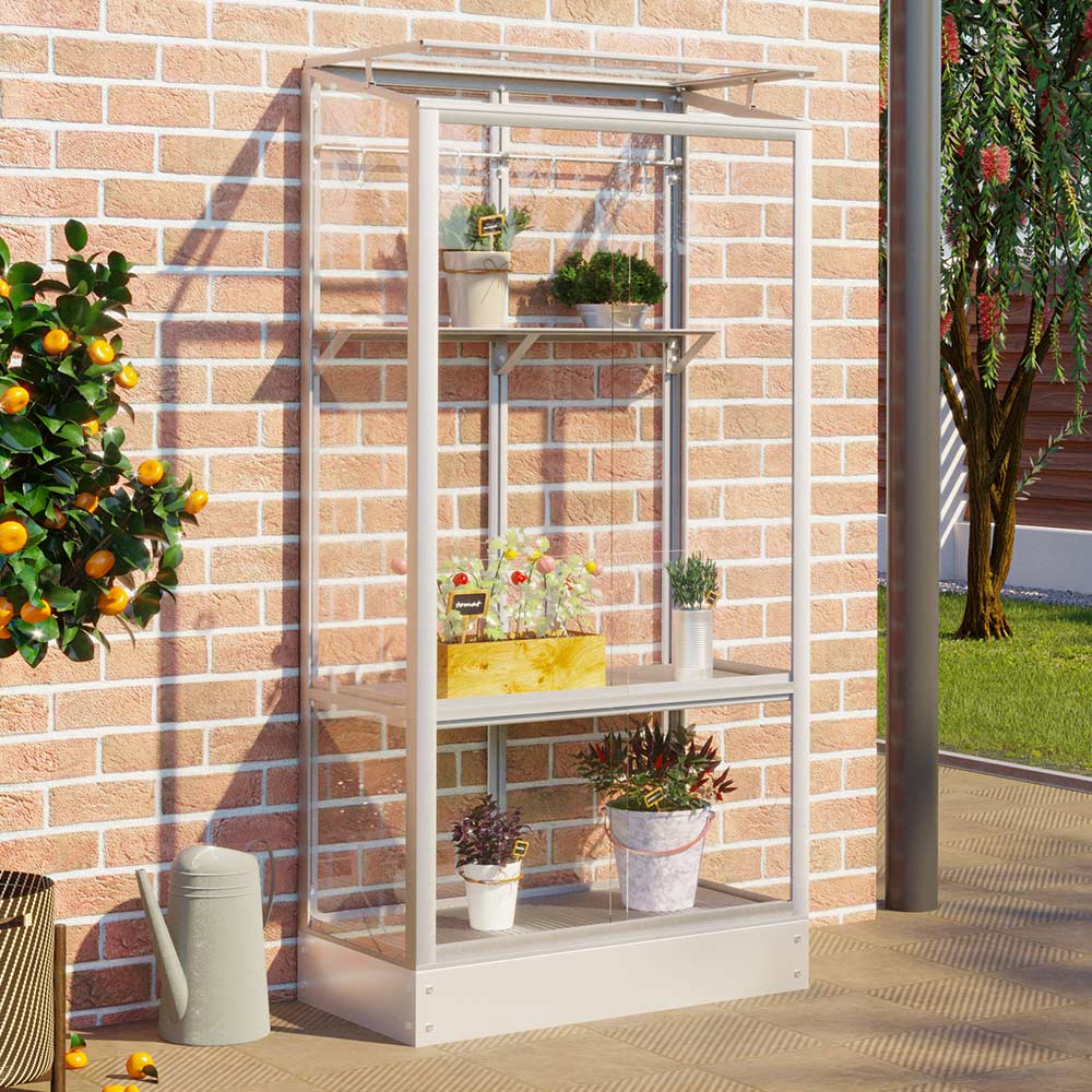 Polis 350 är en mycket exklusiv drivbänk för balkong eller terrass. Drivbänken består av en aluminiumram med kanalplattor. Skåpet består av två fack (nedre och övre). Båda delarna kan öppnas och stängas individuellt.
