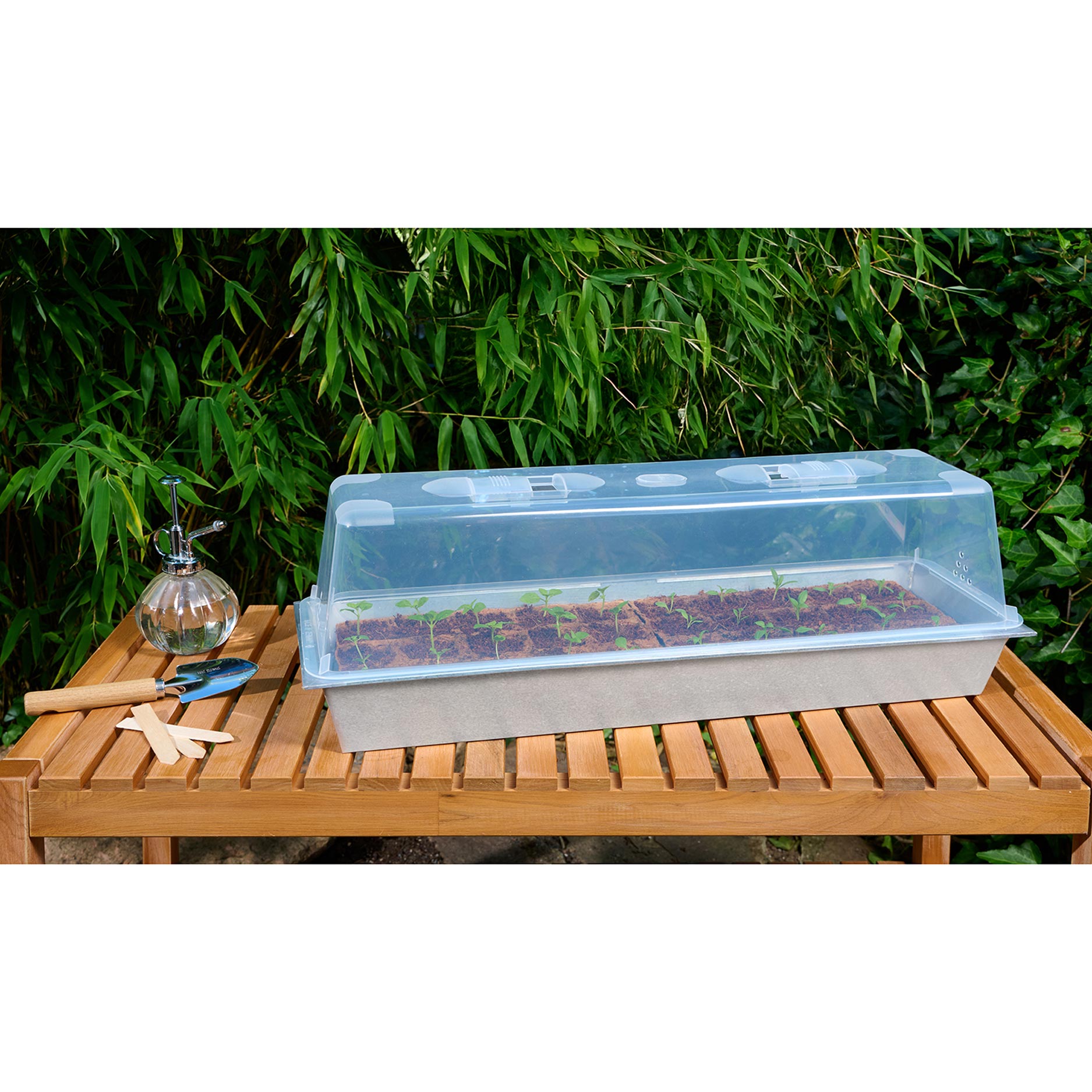 Fyll krukorna med jord eller kokos‑substrat, så frön eller sätt ner sticklingar och placera locket ovanpå. Miniväxthuset skapar ett varmt och fuktigt mikroklimat, medan ventilationen ger frisk luft, vilket gör att frön gror bättre och unga plantor växer stabilt.