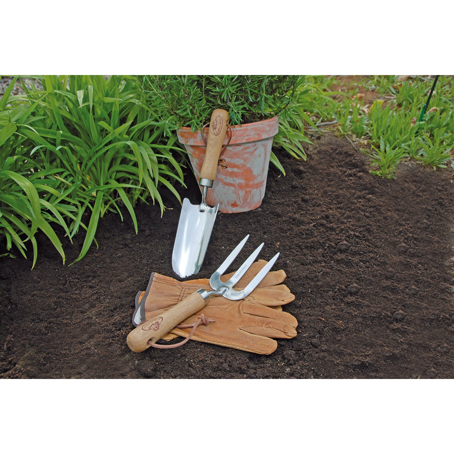 Traditionellt trädgårdsredskapsset för alla med gröna fingrar. Det hållbara materialvalet gör att setet håller länge. Detta trädgårdsset är en bra bas för mindre arbeten i trädgården och vid utomhusplantering. Planteringsspaden passar för många ändamål i trädgården, som att plantera om eller ta bort ogräs. Den handhållna planteringsgaffeln lämpar sig väl för att bryta upp och luckra jorden. De robusta handskarna i grisskinn med ett autentiskt utseende skyddar händerna mot smuts.