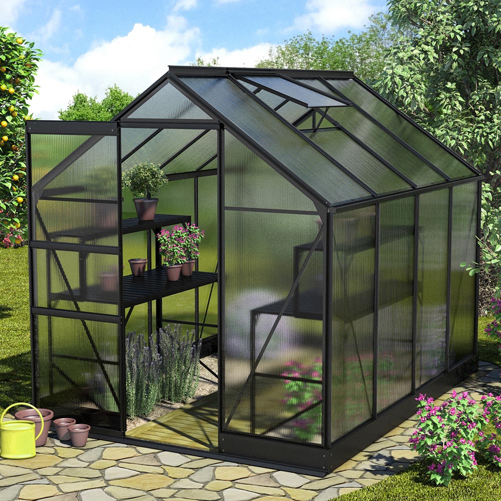 Aluminiumkonstruktionen är underhållsfri och hållbar, uppbyggd med klämfjäderkonstruktion där varje glas- eller skivdel pressas stadigt mot ramen och kläms fast mellan profil och list. Det ger stabilitet och enkelt underhåll. Glasmaterialet finns i tre varianter: helt i 4mm kanalplast, helt i 6mm kanalplast, eller en kombination med klart säkerhetsglas runtom och bysantinskt glas i taket. Detta matta glas ger ett diffust ljus som motverkar bladbränna och ger växthuset ett elegant, klassiskt uttryck. Den enkla skjutdörren ger smidig access, och takfönstret ger naturlig ventilation.