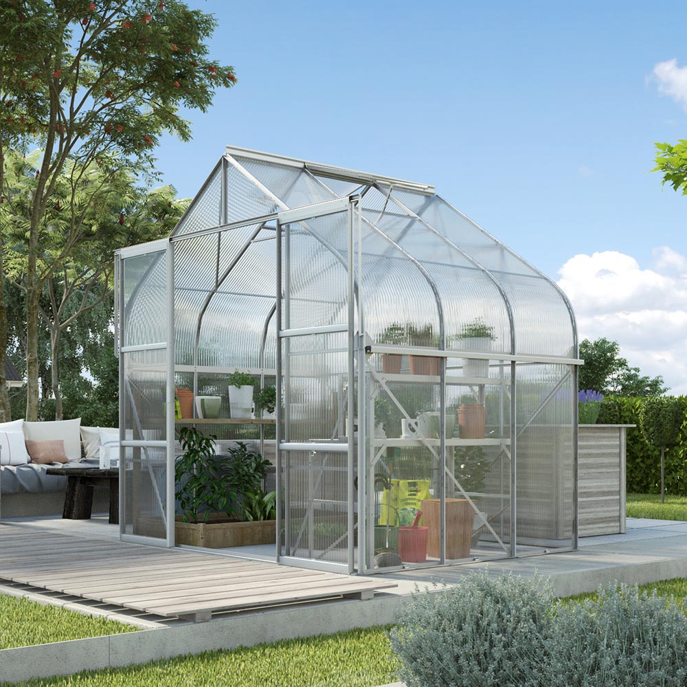 Aluminiumkonstruktionen är lättskött och robust. Glasytorna består av säkerhetsglas, där endast de böjda delarna är av högkvalitativ polykarbonat. Alternativt kan ni välja helt 4mm kanalplast. Panelerna fästs med fjäderklämmor, vilket ger en stabil montering och gör dem enkla att byta ut. Den dubbla skjutdörren öppnas smidigt och ger bred åtkomst. Takfönster ger ventilation, och regnrännor leder bort vatten effektivt; dessa sitter under de böjda delarna.